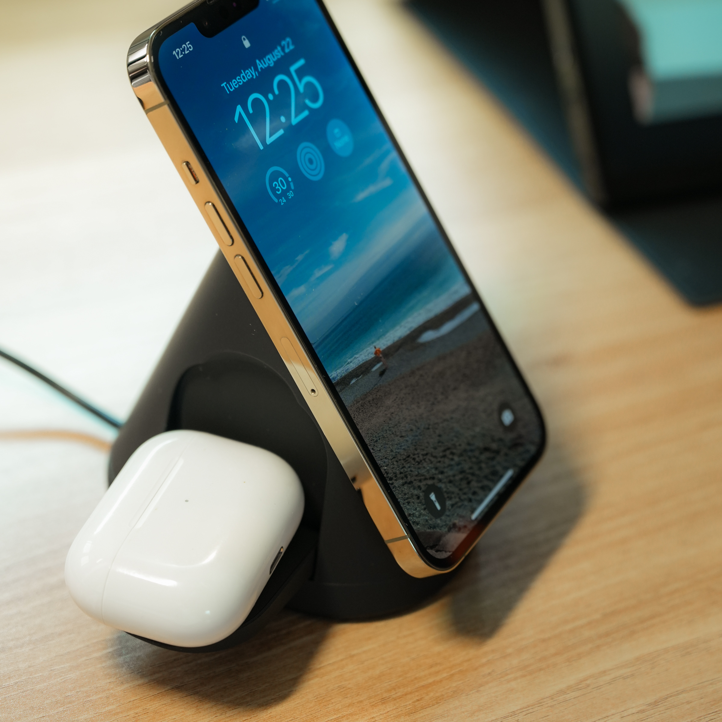 왼쪽 충전부에는 에어팟 등 무선 이어폰을 충전할 수 있습니다. 제가 사용하고 있는 에어팟 프로 모델을 올려놓았을 때 이상없이 충전이 시작됐습니다. 만약 맥세이프 지원 케이스를 사용한다면 스마트폰 충전부에 부착해서도 충전할 수 있겠죠. 에어팟은 고속 충전 지원이 따로 없고 배터리 용량이 적기 때문에 5W 출력으로 원활하게 사용할 수 있습니다.