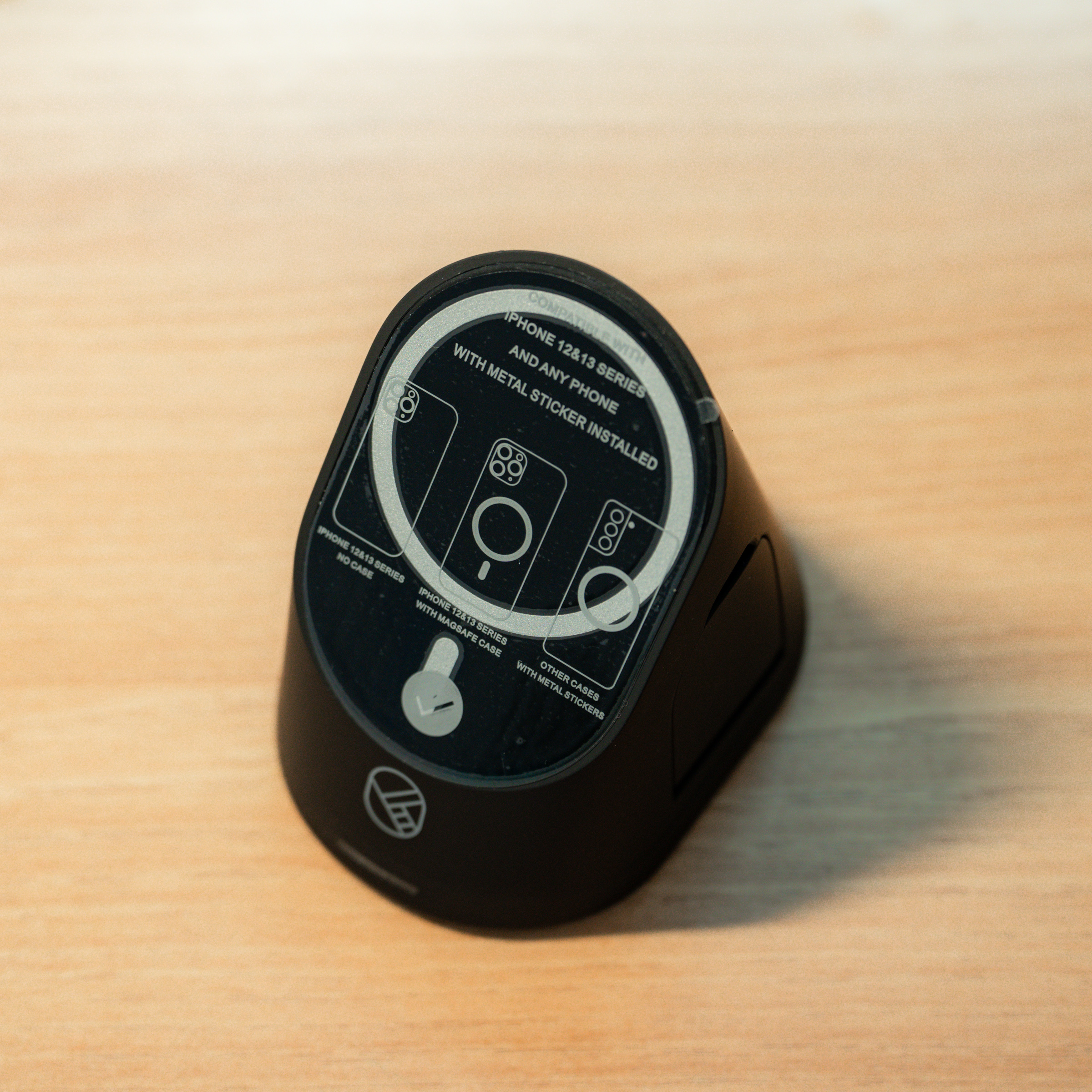 스마트폰 충전부에는 애플 맥세이프와 호환되는 마그네틱 링이 있습니다. 아이폰 12 시리즈 이후 모델이면 자성으로 부착돼 간편하게 무선 충전을 시작할 수 있습니다. MFI 인증은 아니지만 부착 및 충전에는 문제가 없습니다. 고속 충전 어댑터를 사용하면 맥세이프 애니메이션도 표시되며 10W 충전이 가능합니다.