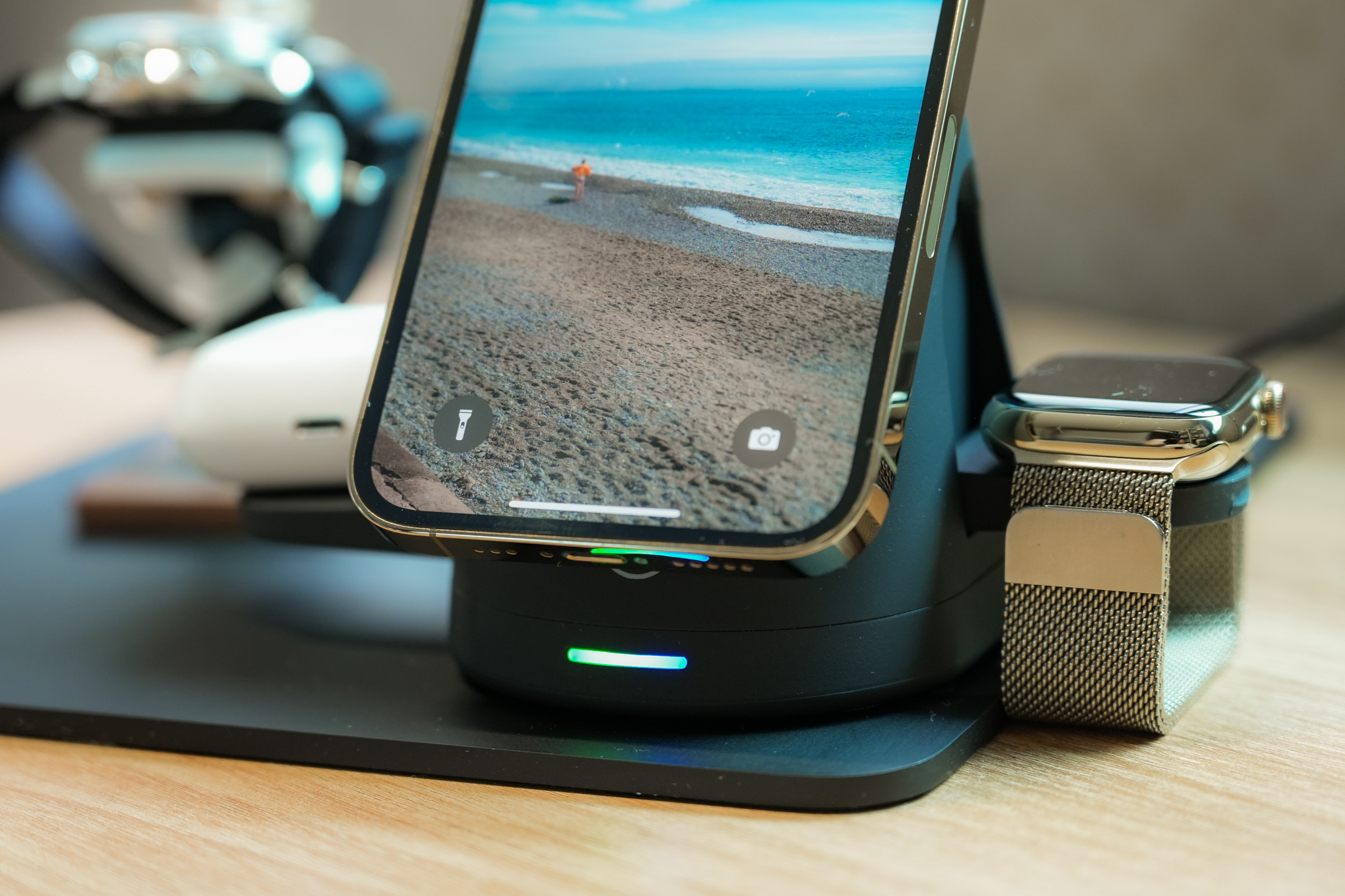 가장 큰 특징은 에어팟, 애플워치 충전부를 접어서 수납하는 폴더블 방식이라는 것입니다. 이런 구조로 인해 전체 부피를 크게 줄였습니다. 제조사 발표 기준 7x11x9cm로 여행용 멀티 충전기로도 무리가 없어 보입니다. USB C 케이블 하나로 세 개의 디바이스를 충전할 수 있으니까요.