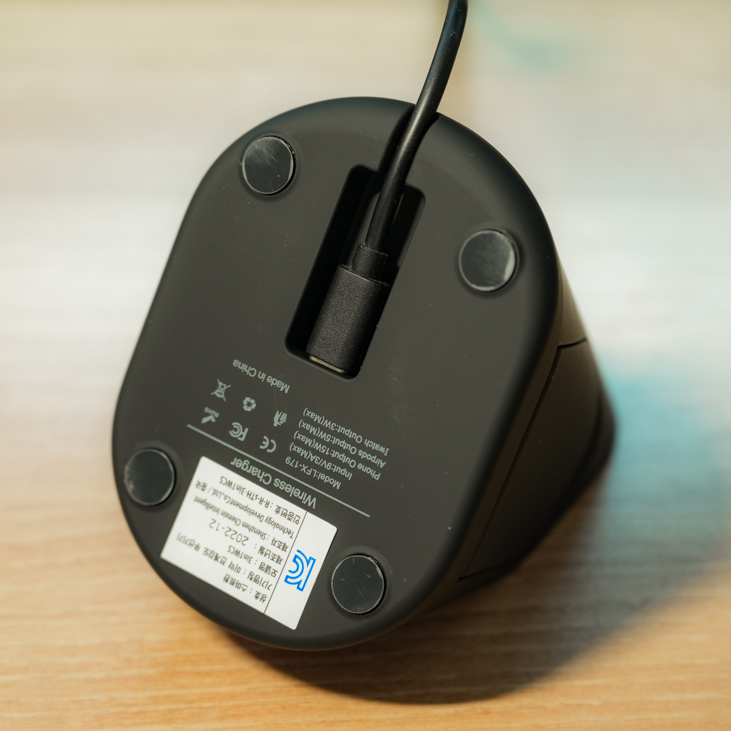 충전기 출력은 15W지만 MFI 인증 제품이 아니라 아이폰 충전은 10W로 제한됩니다. 스마트폰을 사용하지 않을 때 거치하며 충전하는 용도로는 충분합니다. 경사가 있는 스탠드형으로 충전 중 알람을 편히 확인할 수 있기 때문입니다.