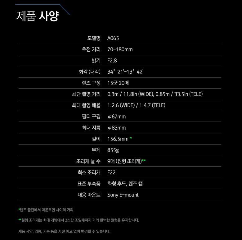 풀프레임 미러리스 카메라에 대응하는 70-180mm 광학 약 2.6배 줌, 모든 초점거리에서 F2.8 조리개 값을 갖는 대구경 렌즈입니다. 이런 고급 사양을 탑재하고도 크기가 83 x 156.5mm, 무게는 855g입니다. 비교 대상 렌즈를 살펴보면 F4 고정 조리개 값의 소니 SEL70200G2 렌즈가 794g으로 약 60g 가량 차이가 납니다. 조리개 값이 F2.8로 밝은 탐론 렌즈에 높은 점수를 주는 사용자가 많을 것입니다. 최상위 제품인 SEL70200GM2와는 조리개 값이 F2.8로 동일한데 탐론 렌즈의 무게가 약 190g 가볍습니다. 광학 성능에서는 GM 렌즈쪽이 우위, 휴대성 그리고 가격에선 탐론이 유리하다 평할 수 있겠네요. 이전 버전인 SEL70200GM과 비교한다면 무게가 1450g과 855g으로 큰 차이가 납니다. 탐론 렌즈의 포지션은 70200GM과 70200GMII 사이를 노리고 있다고 볼 수 있겠네요. 브랜드 인지도를 제외 한다면.