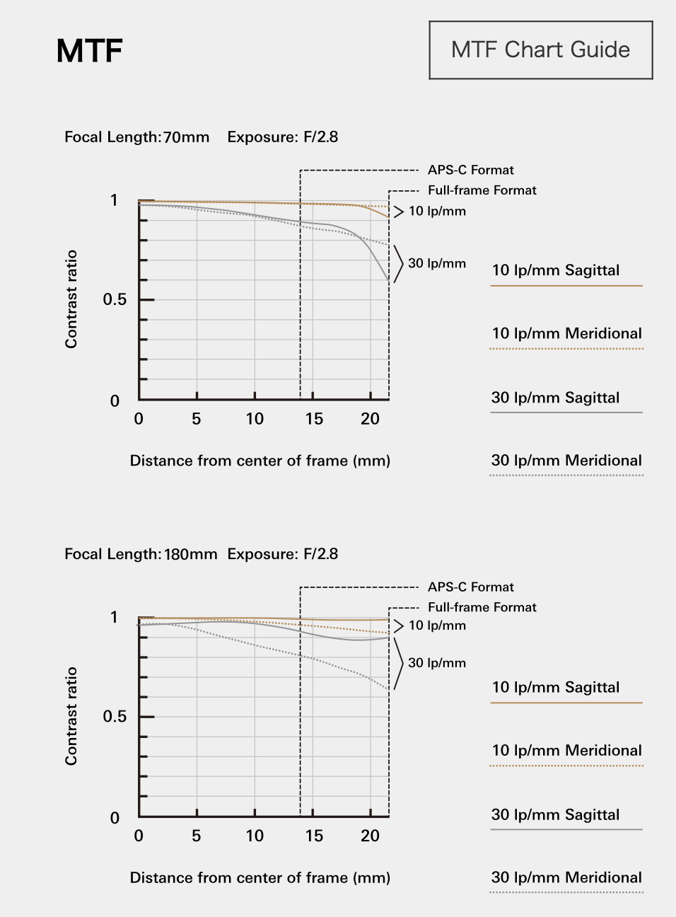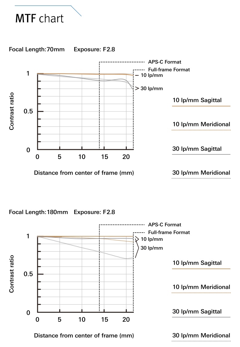 이전 버전인 70-180mm F/2.8 Di III VXD와 70-180mm F/2.8 Di III VC VXD G2의 가장 큰 차이는 손떨림 보정 장치 VC의 유무입니다. 그 외에도 70-180mm의 초점거리와 F2.8 조리개 값을 제외하면 둘은 다른 렌즈라 봐도 좋을만큼 각 요소에 차이가 있습니다. 렌즈 구성이 14군 19매에서 15군 20매로 변경됐고 크기는 81 x 149 mm(G1) / 83 x 156.5 mm(G2), 무게도 810g(G1) / 855g(G2)로 신형이 크고 무겁습니다. 손떨림 보정 장치와 개선된 광학 설계로 인한 변화로 보입니다. 최단 촬영 거리는 AF기준 30(70mm)-85cm(180mm)로 동일하지만 구형은 수동 초점으로 27mm(70mm 기준)까지 가능합니다. 휴대성과 일부 성능에서 전작보다 불리한 부분이 있지만 손떨림 보정 장치 추가, 화질 개선 등이 이뤄졌습니다. MTF 차트를 통해 유의미한 주변부 화질 개선이 이뤄진 것을 확인할 수 있습니다.