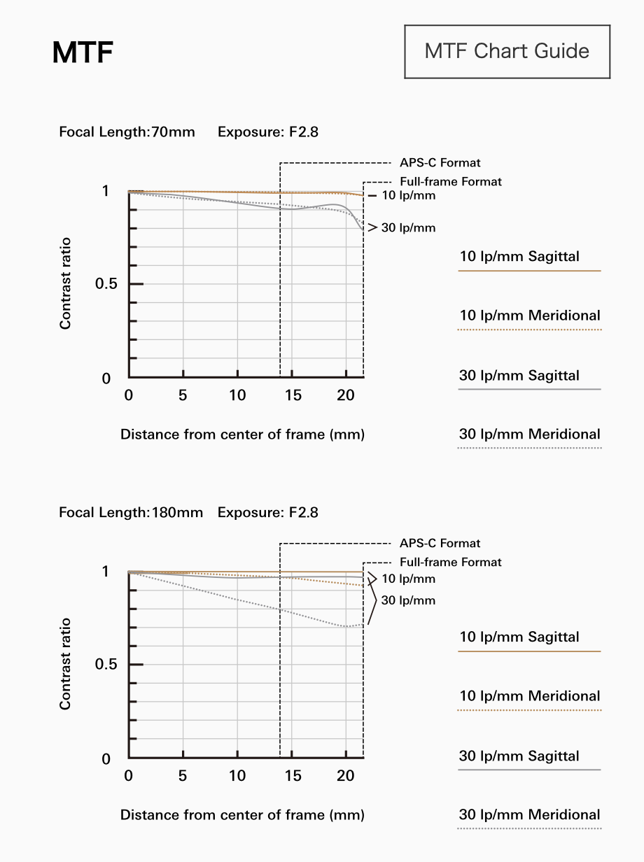 이전 버전인 70-180mm F/2.8 Di III VXD와 70-180mm F/2.8 Di III VC VXD G2의 가장 큰 차이는 손떨림 보정 장치 VC의 유무입니다. 그 외에도 70-180mm의 초점거리와 F2.8 조리개 값을 제외하면 둘은 다른 렌즈라 봐도 좋을만큼 각 요소에 차이가 있습니다. 렌즈 구성이 14군 19매에서 15군 20매로 변경됐고 크기는 81 x 149 mm(G1) / 83 x 156.5 mm(G2), 무게도 810g(G1) / 855g(G2)로 신형이 크고 무겁습니다. 손떨림 보정 장치와 개선된 광학 설계로 인한 변화로 보입니다. 최단 촬영 거리는 AF기준 30(70mm)-85cm(180mm)로 동일하지만 구형은 수동 초점으로 27mm(70mm 기준)까지 가능합니다. 휴대성과 일부 성능에서 전작보다 불리한 부분이 있지만 손떨림 보정 장치 추가, 화질 개선 등이 이뤄졌습니다. MTF 차트를 통해 유의미한 주변부 화질 개선이 이뤄진 것을 확인할 수 있습니다.