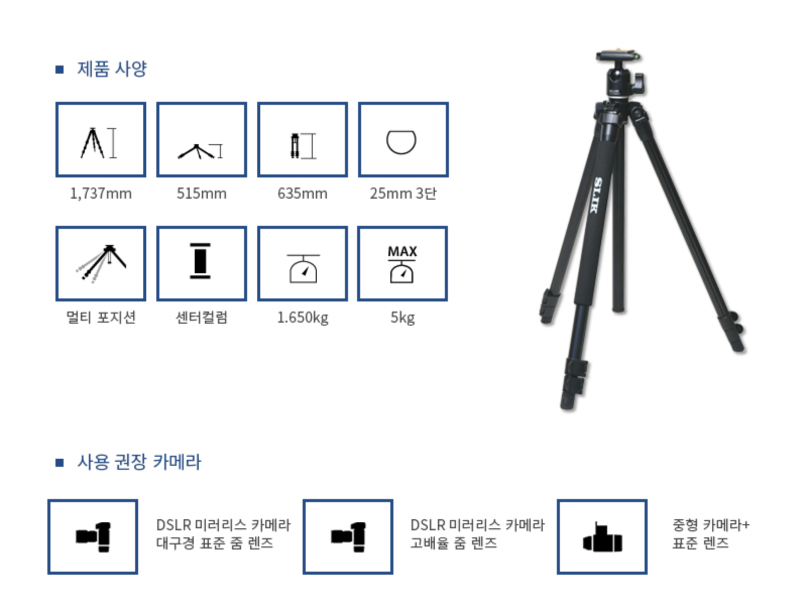 삼각대 전체 크기 특히 중형 카메라급을 올릴 때 사용자에 따라 안전성을 우려할 수 있는 작은 크기의 볼헤드지만 전체 지지하중이 5kg이므로 성능 자체는 충분한 것으로 보입니다. 아무래도 5kg을 꽉 채우기보단 미러리스, DSLR 카메라 정도로 여유있게 사용하는 것이 좋겠지만요. 제가 사용하는 소니 A7M4와 2070G 렌즈가 케이지 포함 약 2kg이고 이 정도의 구성은 걱정없이 사용할 수 있습니다.