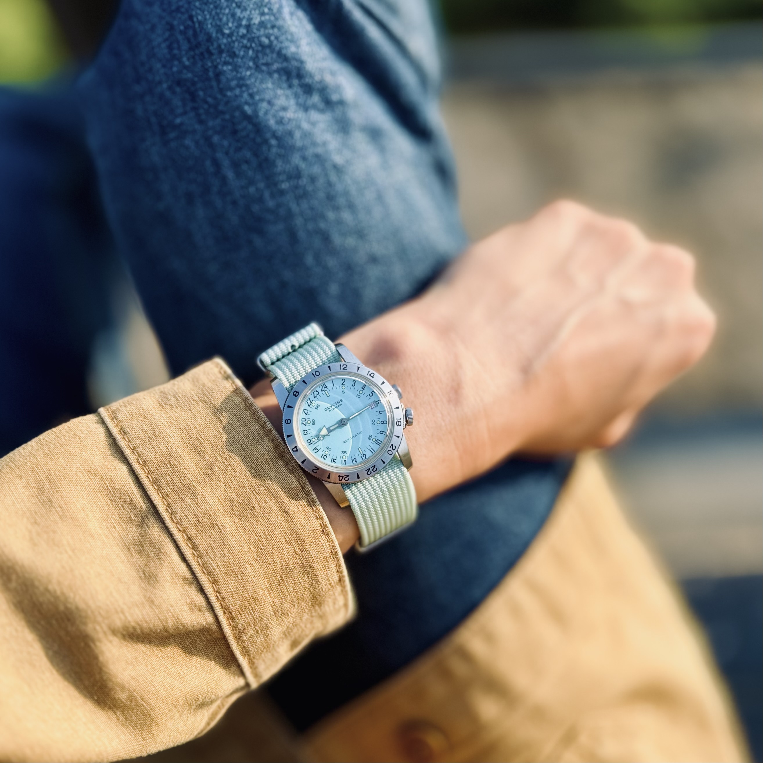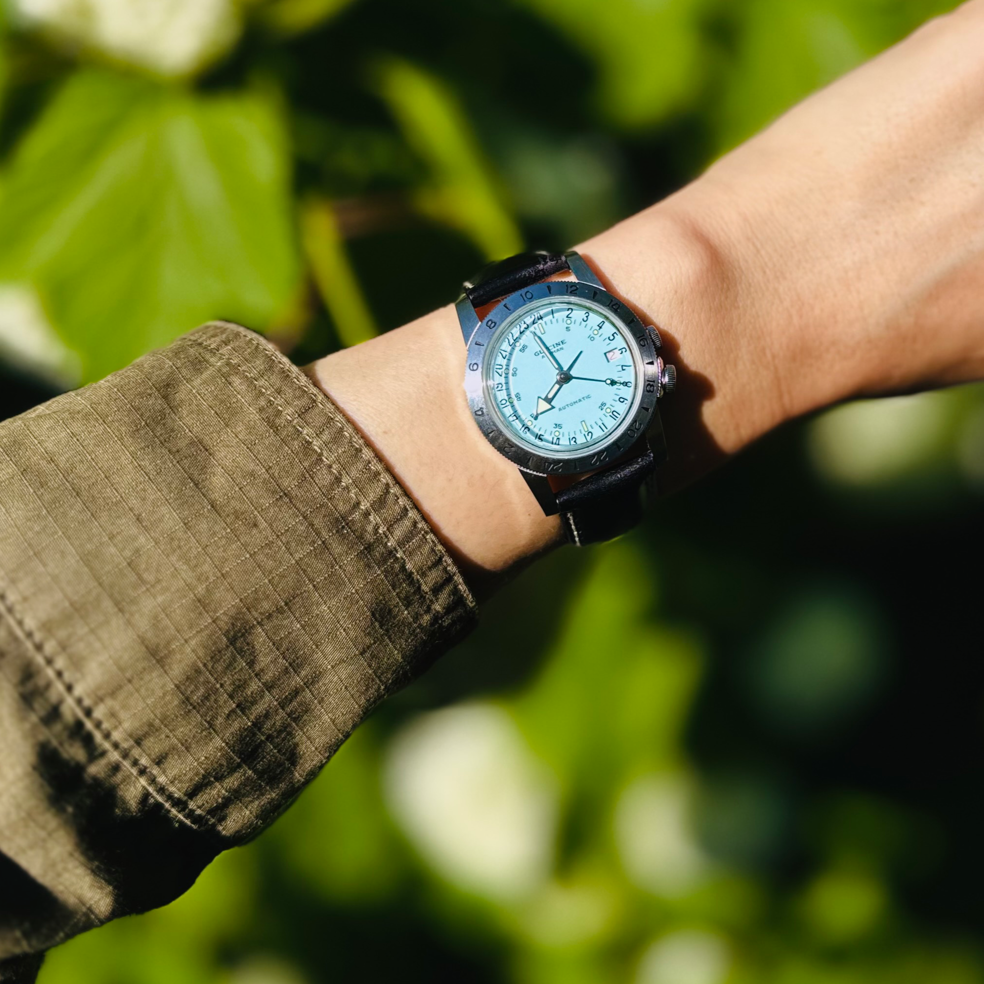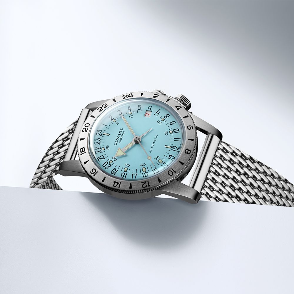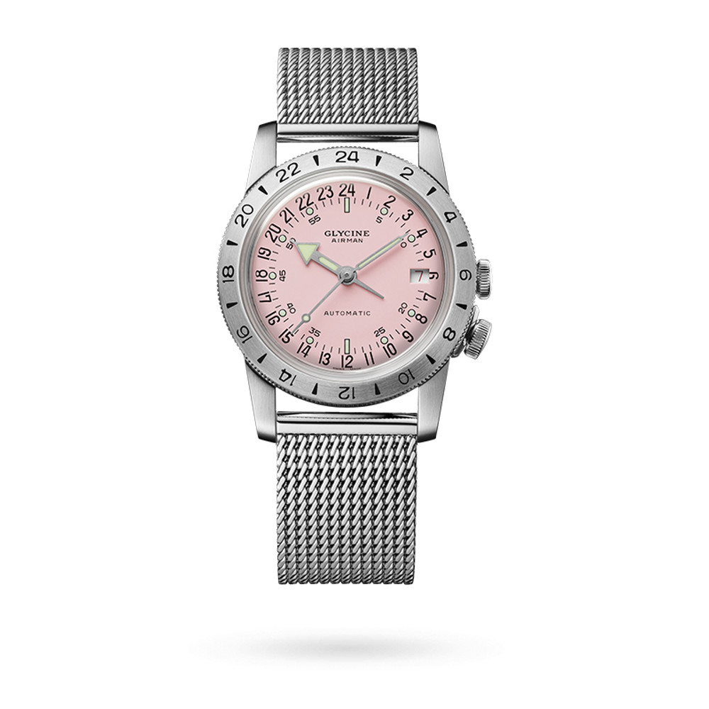 오메가보다는 당연히, 아는 사람만 안다는 오리스보다도 더 마니악한 비주류 브랜드입니다. 최초의 GMT 시계를 만든 위업이 있다곤 하지만 현재는 간판만 남아 이름팔이 당한다는 이야기도 들을 정도니. 그래도 브랜드의 개성, 유산을 잘 이어가고 있습니다. 대표 모델인 에어맨 시리즈는요. 그러면서도 크고 작은 변주를 준 모델들을 발매하는데 이게 그 중 하나입니다. 36mm 케이스, 하루 한 바퀴를 도는 24시간계, 회전 베젤을 이용한 듀얼 타임 기능 등 뼈대를 유지하면서 파스텔 톤의 화려한 컬러를 칠했습니다.