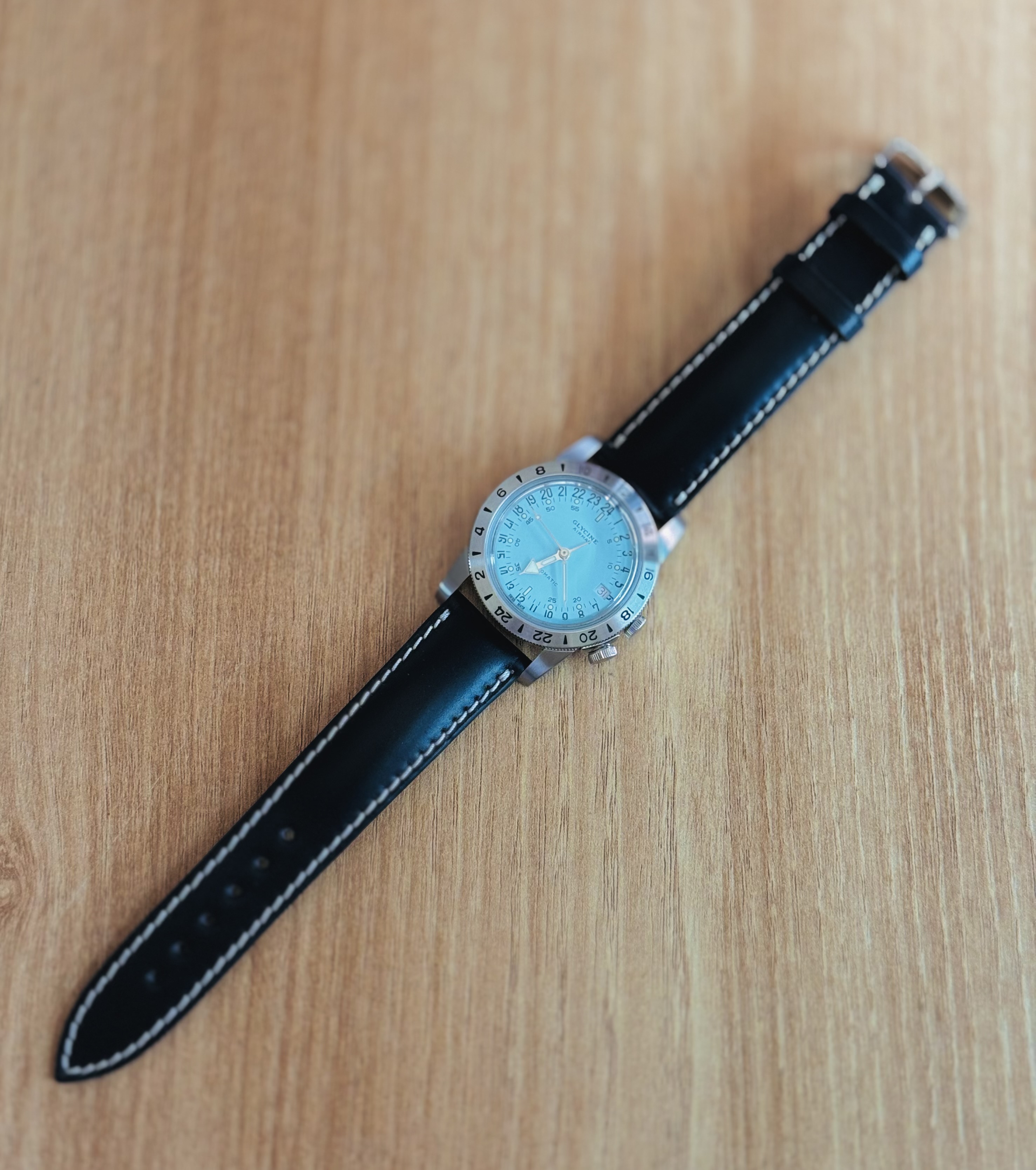 이 시계의 스트랩은 블랙/화이트 컬러의 가죽, 메쉬 브레이슬릿이 있습니다. 저는 기본 가죽 스트랩이 마음에 들지 않아서 가지고 있던 20mm 코도반 가죽 스트랩을 사용하고 있습니다. 다이얼 색상 때문에 밴드 조합이 제한적인데 맞는 조합을 찾아가고 있어요. 가장 잘 어울리는 것은 제치 메쉬 브레이슬릿일텐데 국내 스마트 스토어에서는 별도 판매를 안 하더라고요.