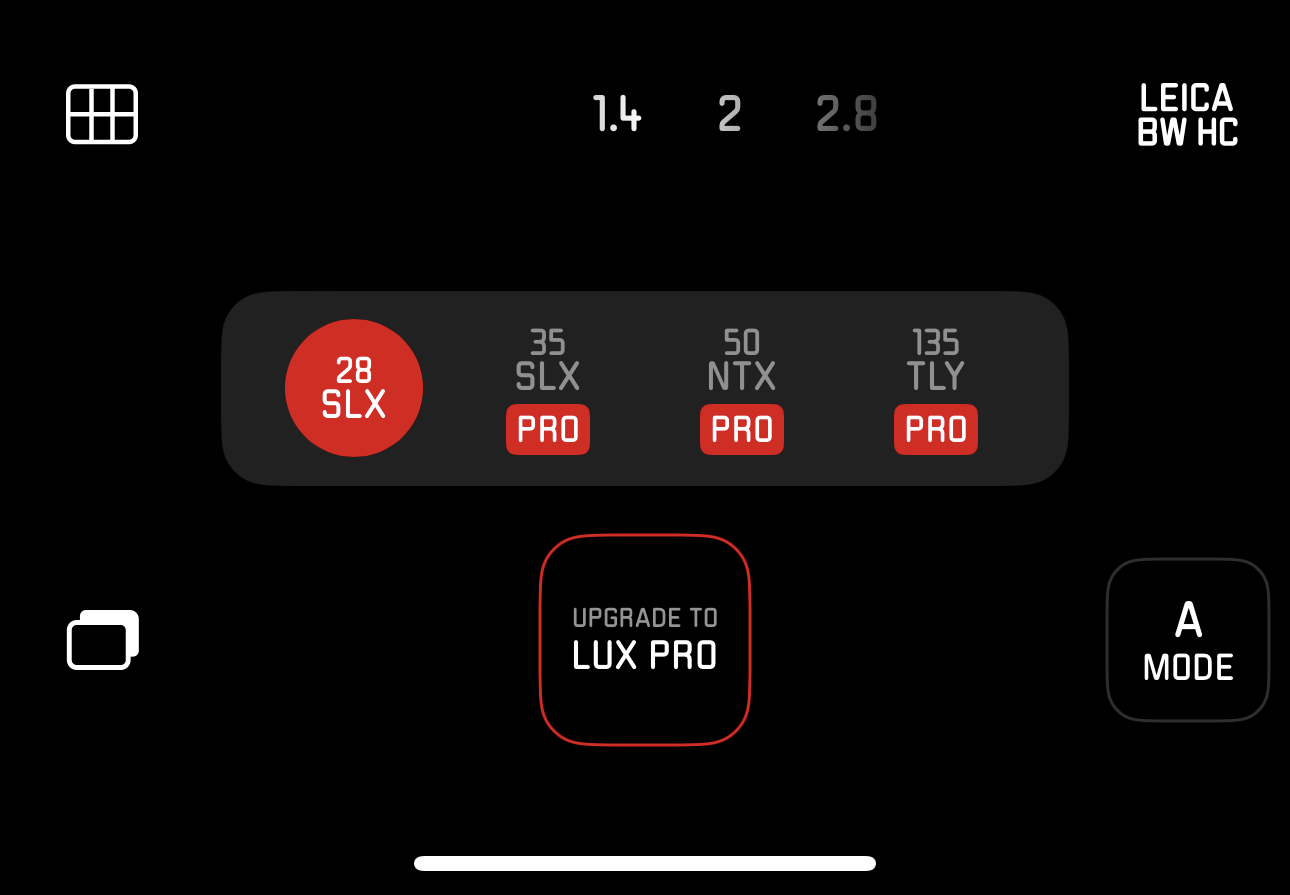 A 모드에서는 조리개 값을 조절할 수 있습니다. 이에 따라 배경 흐림 효과의 정도가 달라지고요. 스마트폰의 인물 모드와 비슷하지만 룩스 앱에서는 개방 촬영의 주변부 비네팅 효과가 더해지는 등 신경을 좀 썼습니다. 실제로 아래 표시 된 렌즈 목록들을 보면 라이카의 대표 렌즈인 28/50mm Summilux, 50mm Noctilux가 표기되어 있습니다. 아마 이 렌즈들의 특징들을 필터를 통해 적용하는 것 같습니다. 제가 느꼈던 주변부 비네팅도 28mm Summilux의 특징을 표현한 거겠죠. 선택할 수 있는 렌즈는 총 네 가지로 35/50/135 렌즈는 LUX PRO 유로 구독을 해야 사용할 수 있습니다.