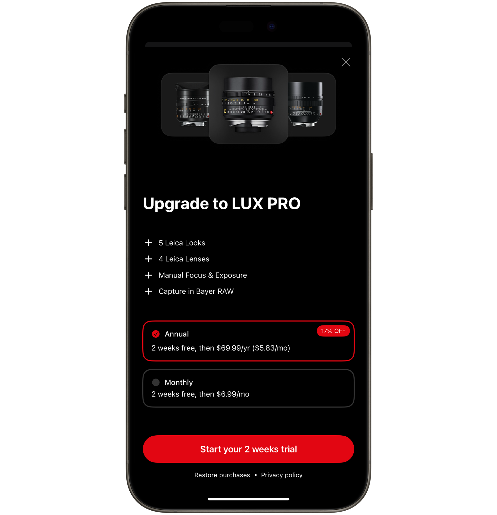LEICA LUX의 구독료는 월 7달러, 1년에 70달러입니다. 역시나 라이카 카메라 다운 가격 정책입니다. 추가 제공되는 기능과 필터, 렌즈 효과 등이 그만한 가치가 있는지 판단해 보고 싶지만, 우선은 무료 기능을 사용해 보려고 합니다. 앱 실행 속도 등의 완성도가 아직 충분치 않아 보여서요. 하지만 일 년에 십만 원으로 라이카 유저가 될 수 있다 생각하면 매력적으로 보이기도 합니다. 이 앱을 좀 더 써 보고 기본 카메라와 비교 포스팅 해 보겠습니다. 흥미로운 앱이니 한 번 경험해 보세요.