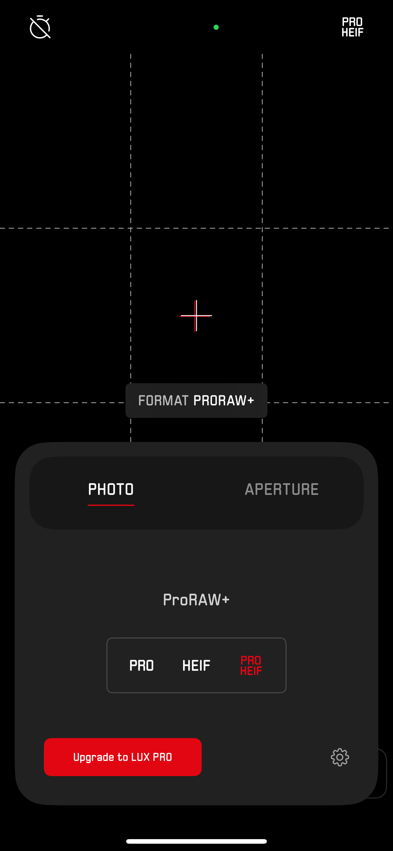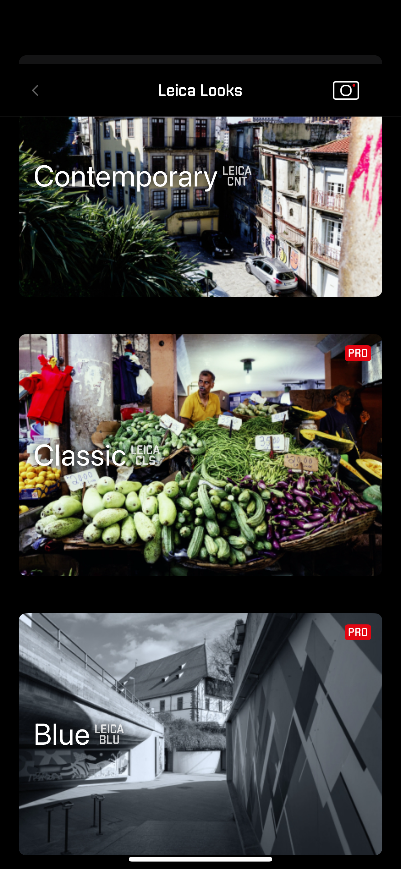 P,A 모두에 제공되는 기능/옵션들은 위와 같습니다. 촬영에 필요한 격자선과 수평계, 플래시, 셀프 타이머가 기본 기능으로 제공되고 파일 포맷은 HEIF와 DNG 둘로 설정할 수 있습니다. HEIF+DNG 동시 촬영도 가능합니다. Looks 메뉴에서는 여러 개의 컬러 필터를 제공합니다. VIVID, NATURAL, BW 등 기본 필터 몇 개와 LUX PRO 유로 구독자들에게 제공되는 추가 필터가 있습니다. 라이카 스타일의 사진을 만들어 주는 이 기능이 이 앱을 사용하는 이유가 되지 않을까요. 라이카에서 튜닝한 이미지 품질과 스타일이 어떨지 궁금합니다.