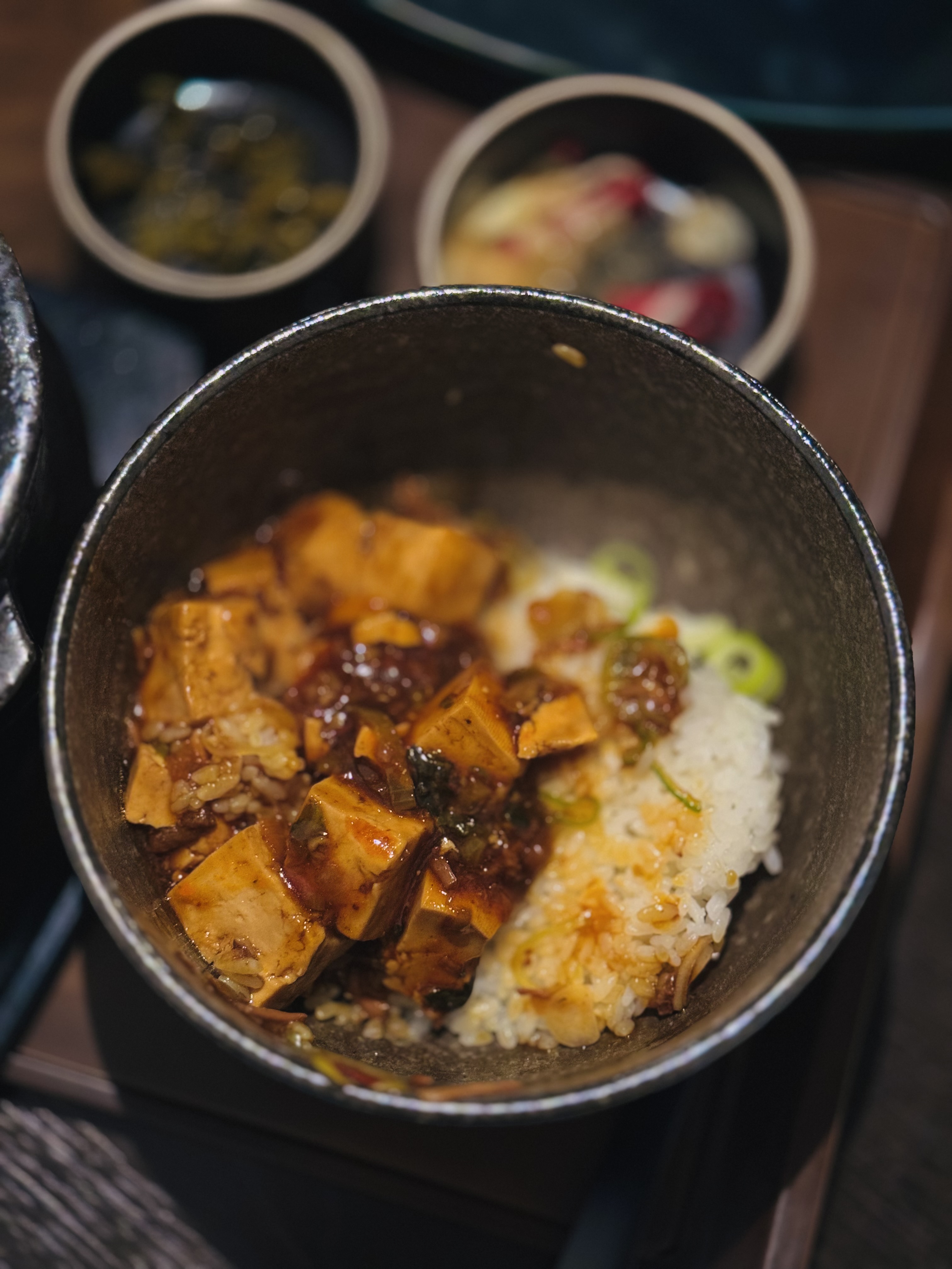 이집의 점심 메뉴인 우육 마파두부 정찬입니다. 고추기름을 올린 새빨간 마파두부와 비벼먹기 좋도록 큰 볼에 담은 쌀밥, 샐러드, 반찬 구성입니다. -오이는 훠이훠이-