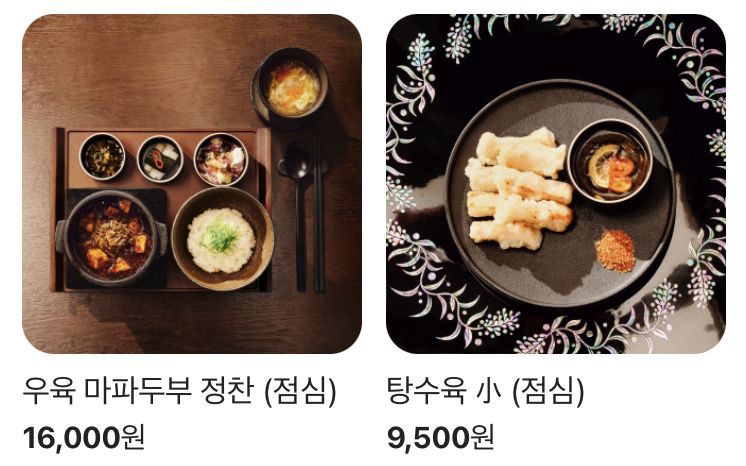 점심 메뉴는 우육 마파두부 정찬 그리고 탕수육이 있습니다. 가격이 좀 높은 편이지만 먹어보니 납득이 될 정도로 맛과 구성, 분위기까지 괜찮았어요. 여러 명이 함께 식사할 때는 탕수육도 추가하면 좋습니다. 사진에서 볼 수 있듯 사이즈는 소 아니 초소.