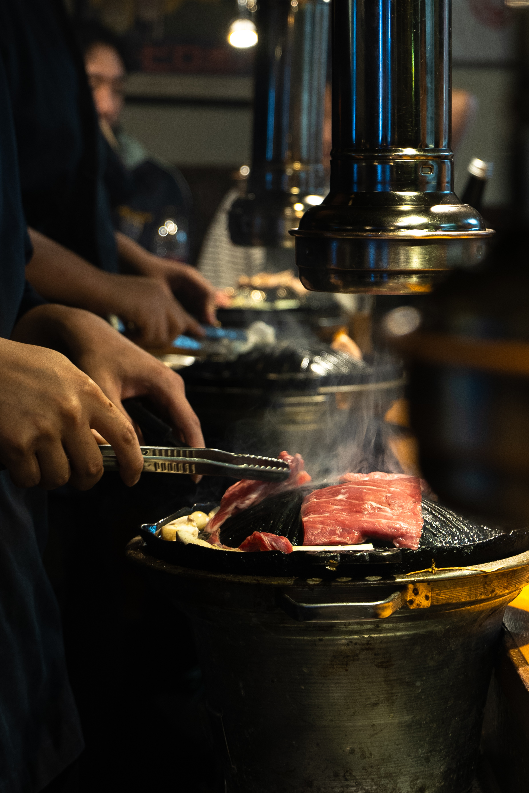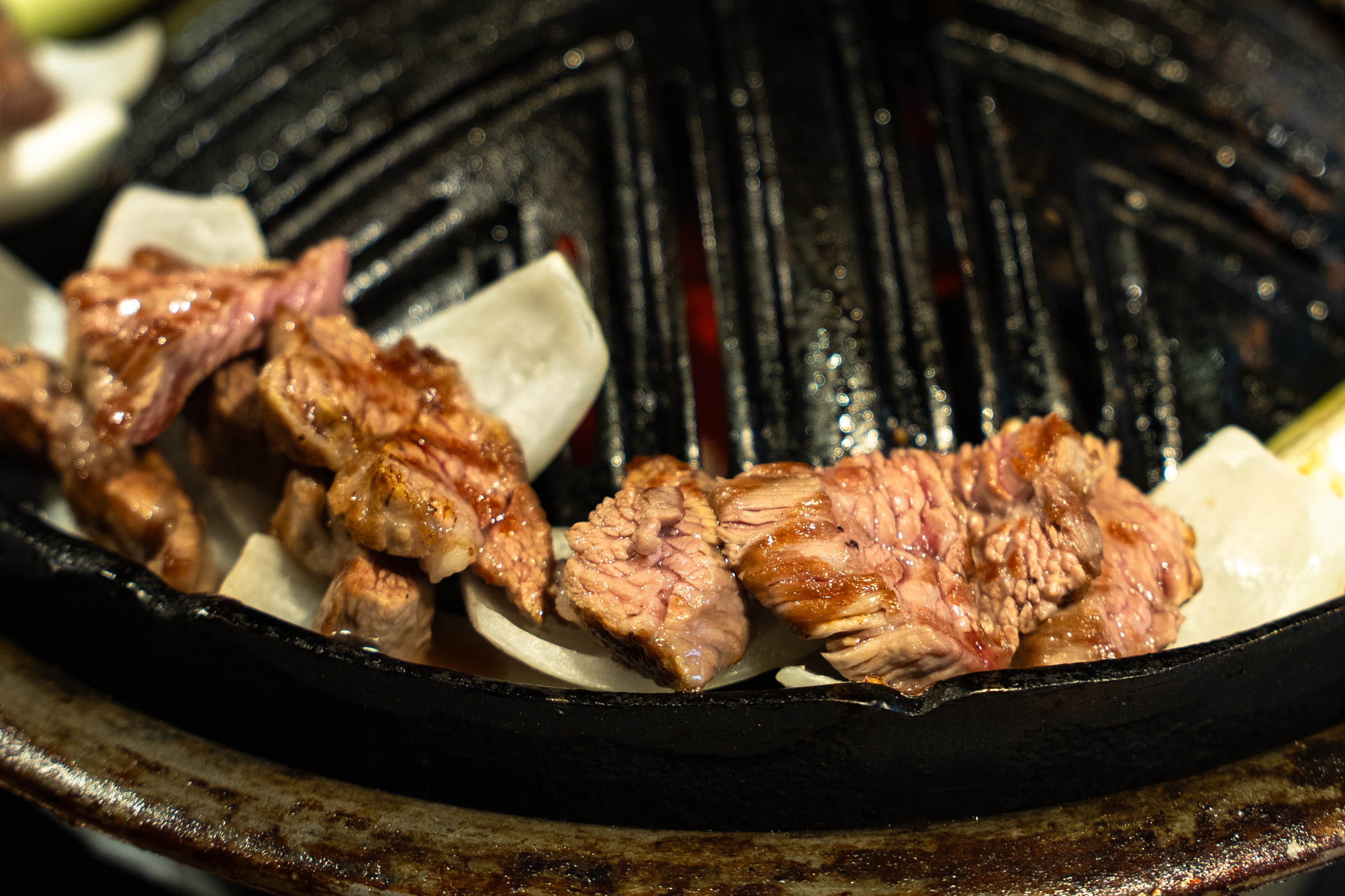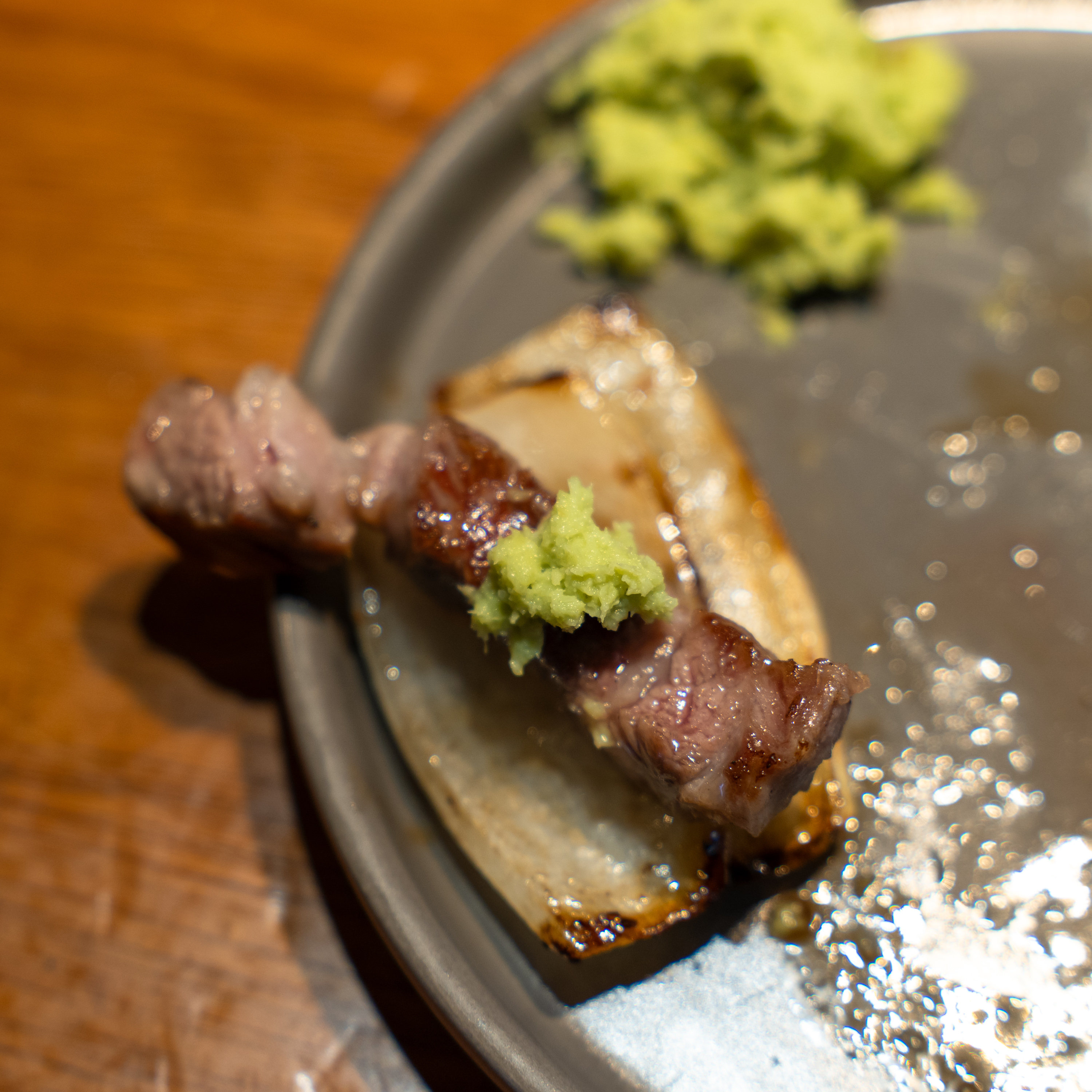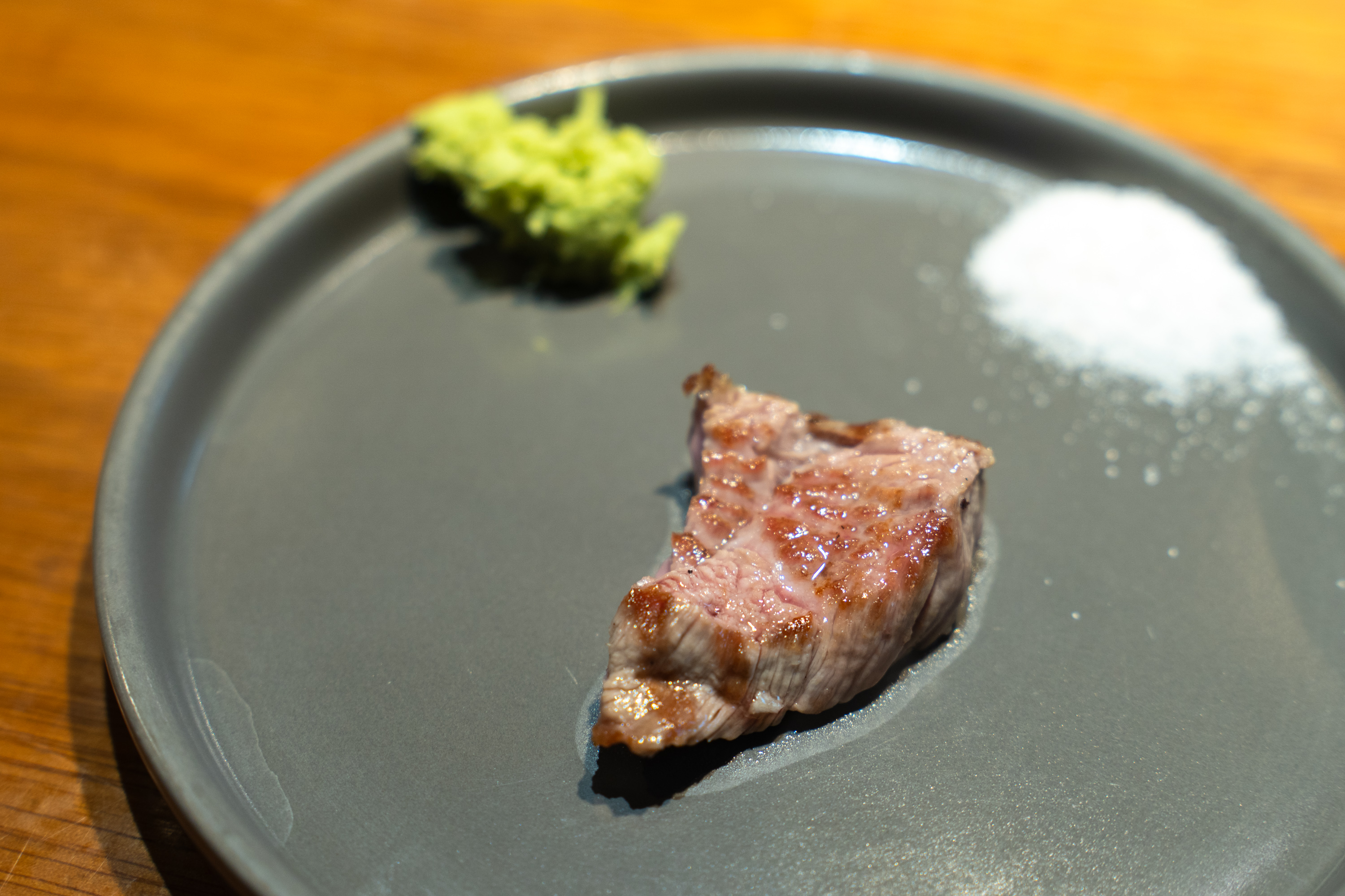 고기는 육향이 덜한 것에서 강한 것으로 구워집니다. 잘 구워진 첫 점은 소금만 찍어 먹는 것을 추천해 주지만 저는 와사비 올려 먹는 것을 가장 좋아합니다.
