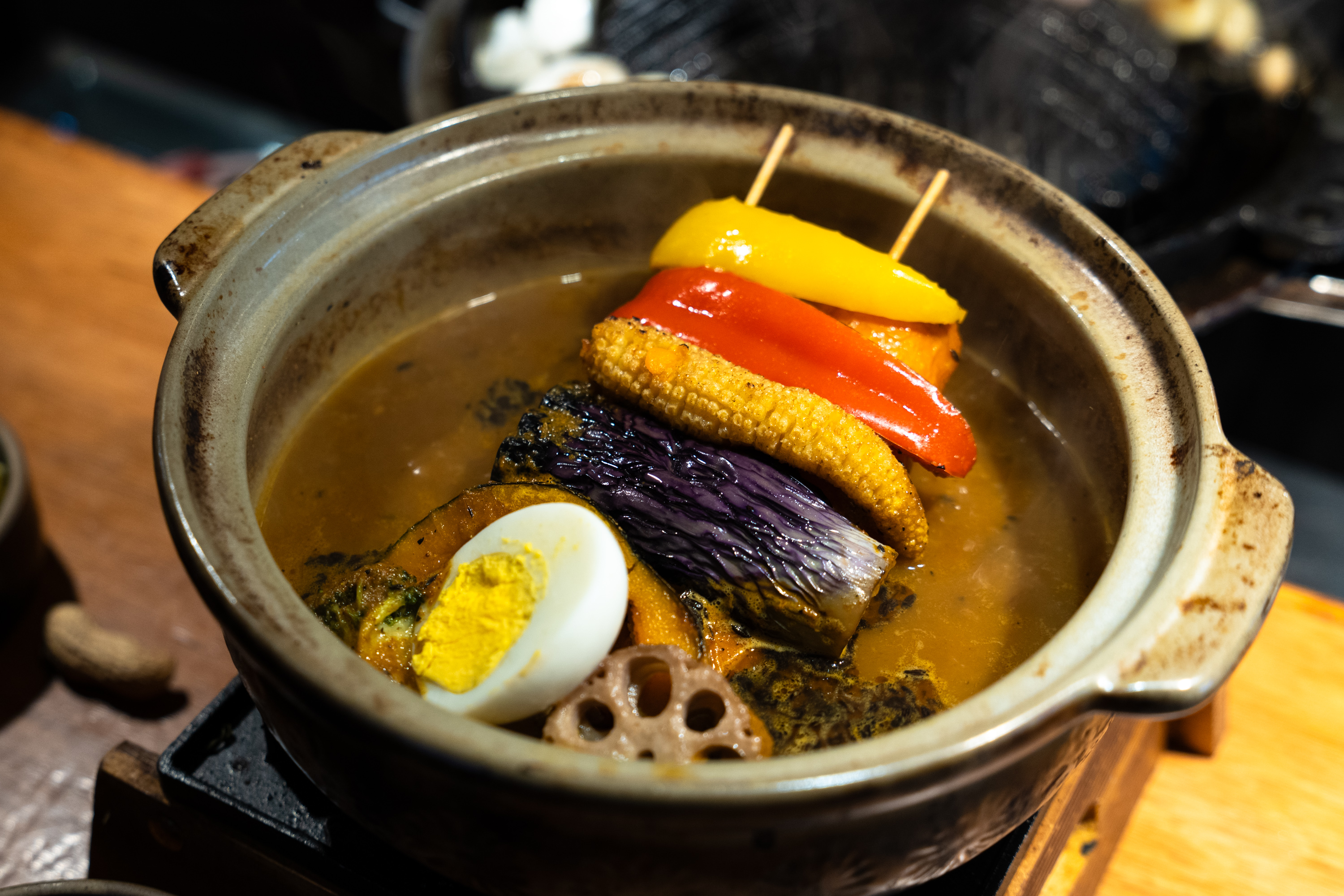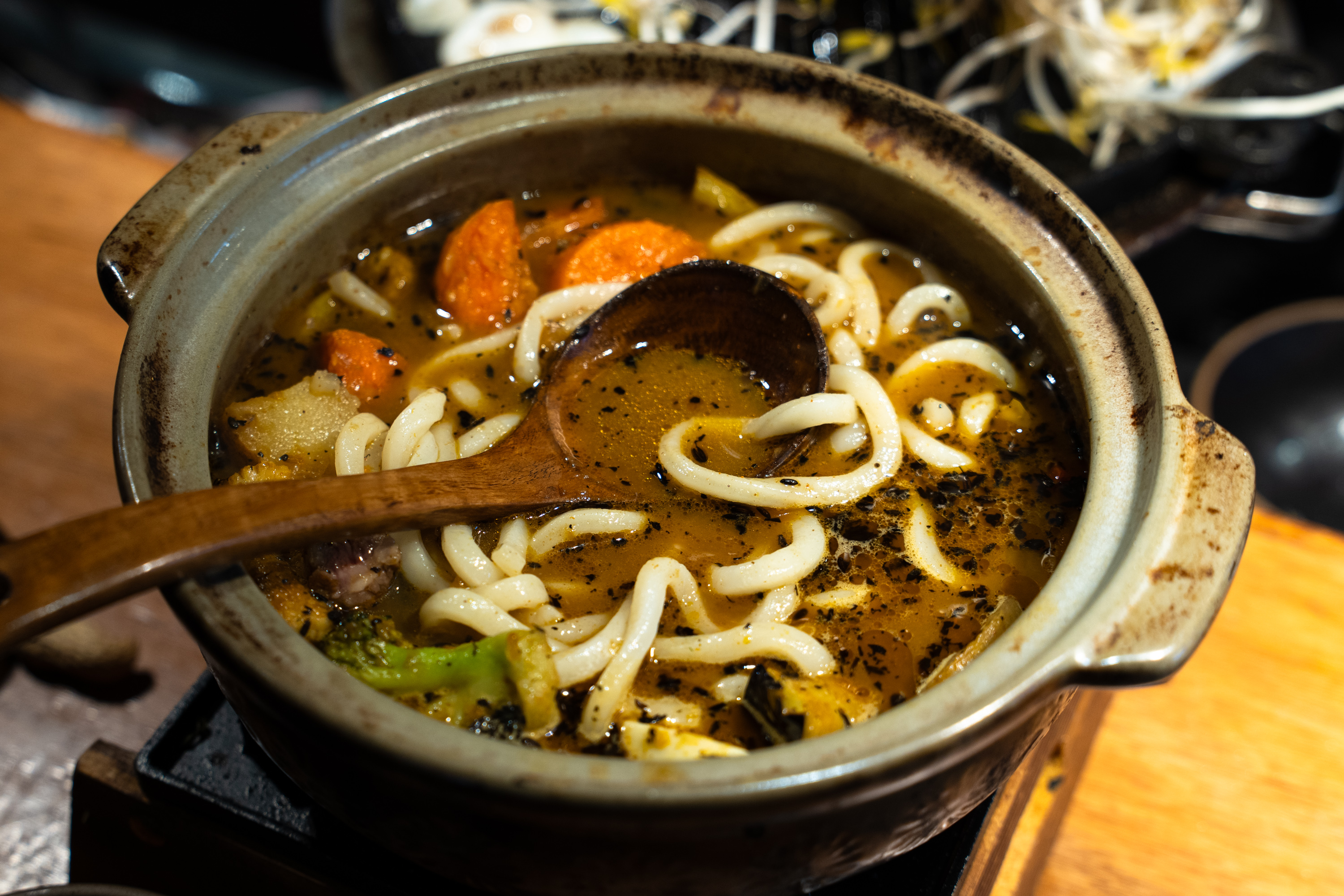 이 집에선 고기를 추가하기보단 마무리로 삿포로 스프 카레를 시키는 편입니다. 전골 느낌의 스프 카레가 이제는 꽤 유명해졌지만 그럼에도 아직 잘 하는 집이 흔치 않거든요. 각종 채소 구이가 토핑으로 나오고 마지막으로 양고기 꼬치가 추가 됩니다. 구성이 꽤 괜찮죠. 거기에 우동 토핑까지. 식사 마무리로, 안주로도 좋지만 이것만으로도 한 끼 식사가 됩니다.