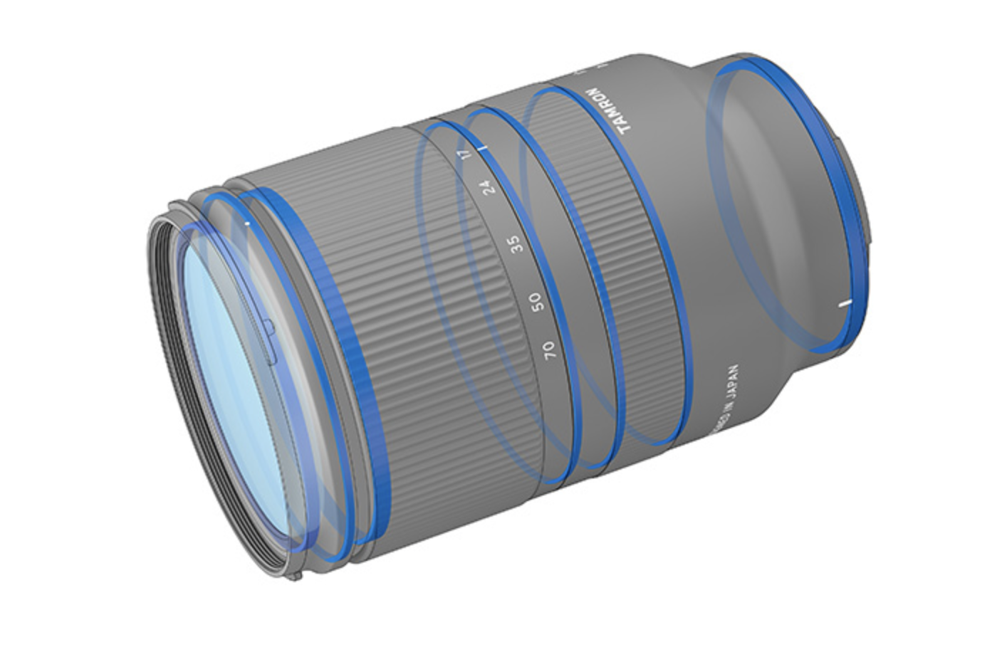 현행 탐론 렌즈들과 디자인 언어를 공유하는 심플한 원통형 실루엣. 활용도가 높은 줌 링이 렌즈 상단에 넓게 자리하고 있고 경통 중간에 초점 링이 있습니다. 초점 거리에 따라 경통이 길어지는 일반적인 방식입니다.