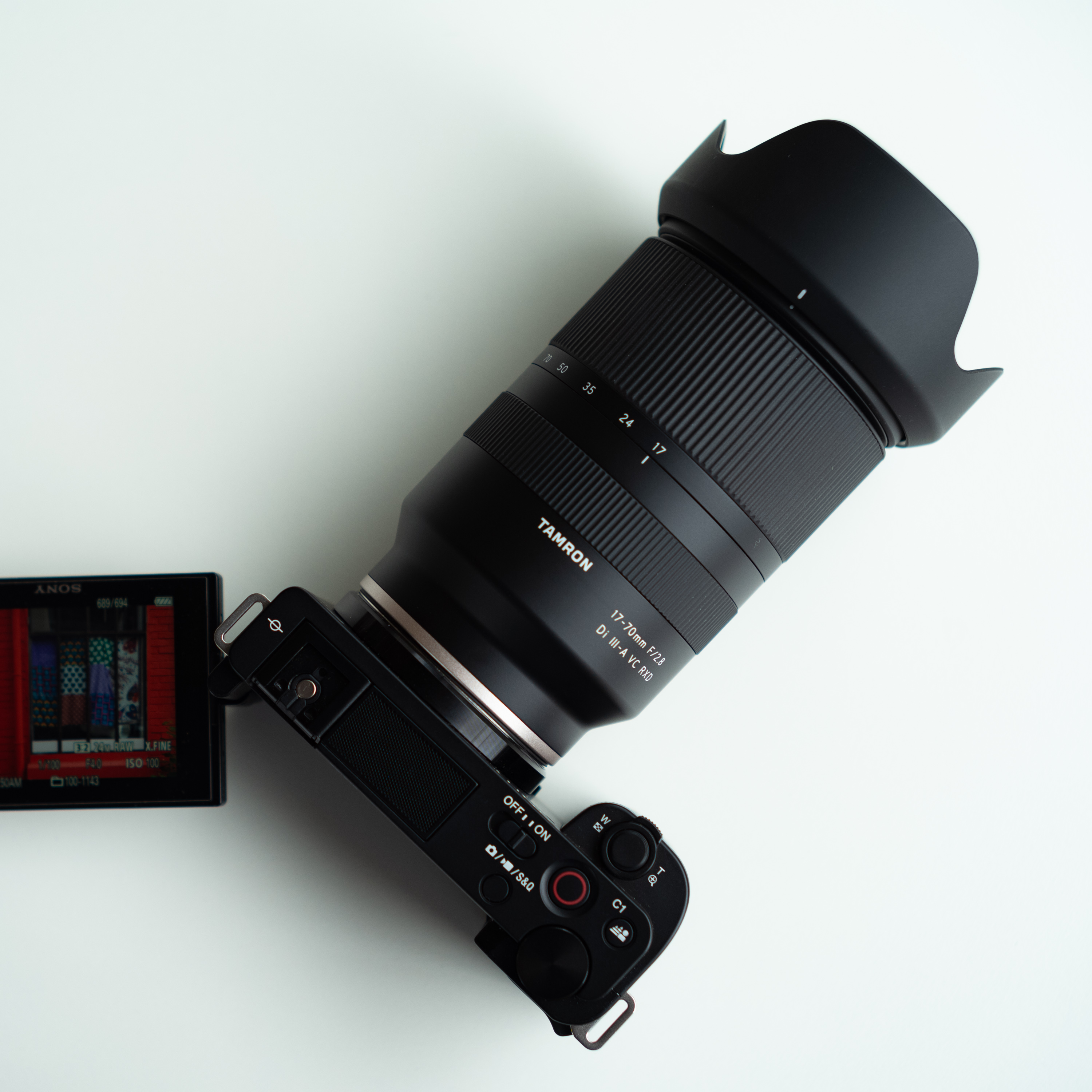 소니 APS-C 미러리스 카메라 중 가장 작고 가벼운 ZV-E10에 마운트 한 모습. 카메라가 워낙 작아 렌즈가 커 보입니다. 둘을 합친 무게는 약 870g. 이 조합으로 2400만 화소 사진, 4K 동영상, 광학 4.1배 줌, F2.8 개방 촬영, 19cm 근접 촬영, 손 떨림 보정 기능 등을 모두 누릴 수 있습니다. 이것이 현재도 APS-C 포맷이 사랑받는 이유가 아닐까요.