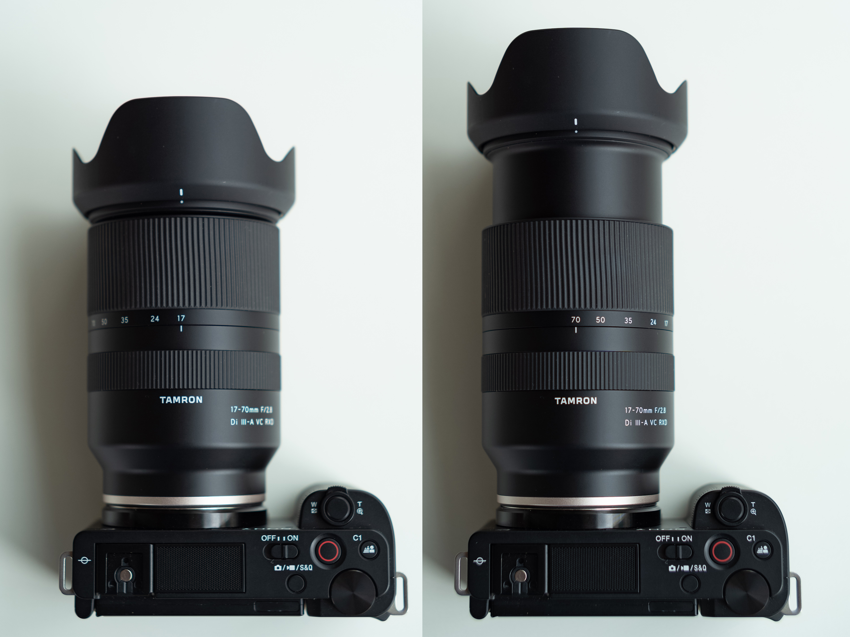 경통 길이는 17mm 최대 광각에서 가장 짧고 망원으로 갈 수록 점점 길어집니다. 70mm 망원에서 전체 경통 길이는 약 145mm입니다.