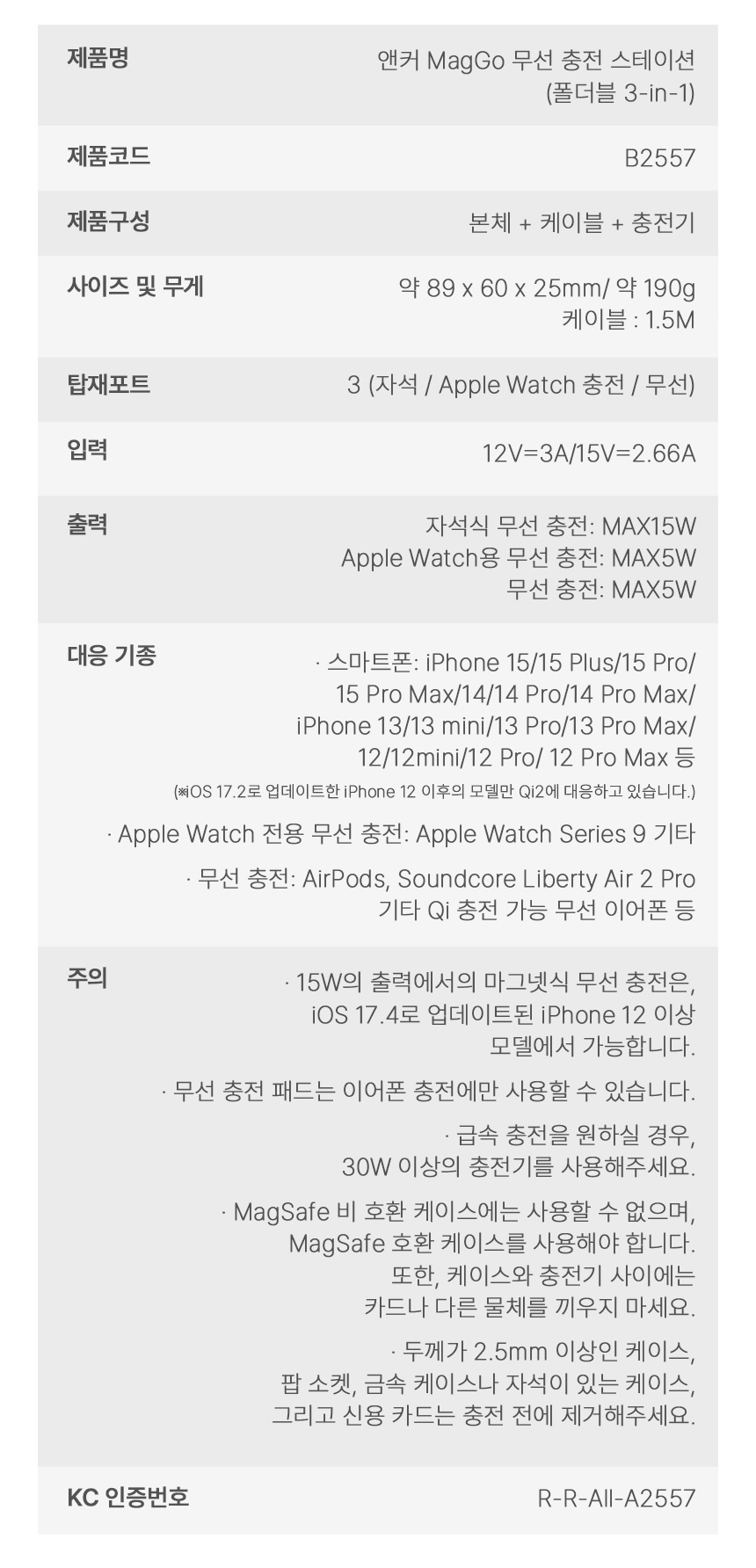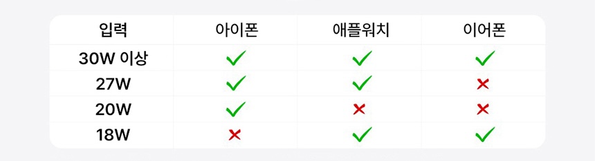 크기 89x60x25mm, 무게 190g으로 휴대성이 뛰어납니다. 지금 쓰고있는 아이폰 15 프로 맥스(221g)보다 30g 가볍습니다. 휴대용 멀티 충전기로 이 휴대성의 장점이 대단하죠. 입력 역시 USB C를 받기 때문에 별도의 충전 어댑터를 챙길 필요가 없습니다. 최대 출력은 아이폰 15W, 애플 워치 5W, 에어팟용 충전 패드 5W입니다. 세 개의 디바이스를 동시 충전하기 위해서는 30W 이상의 입력이 필요한 것을 체크해야겠습니다.