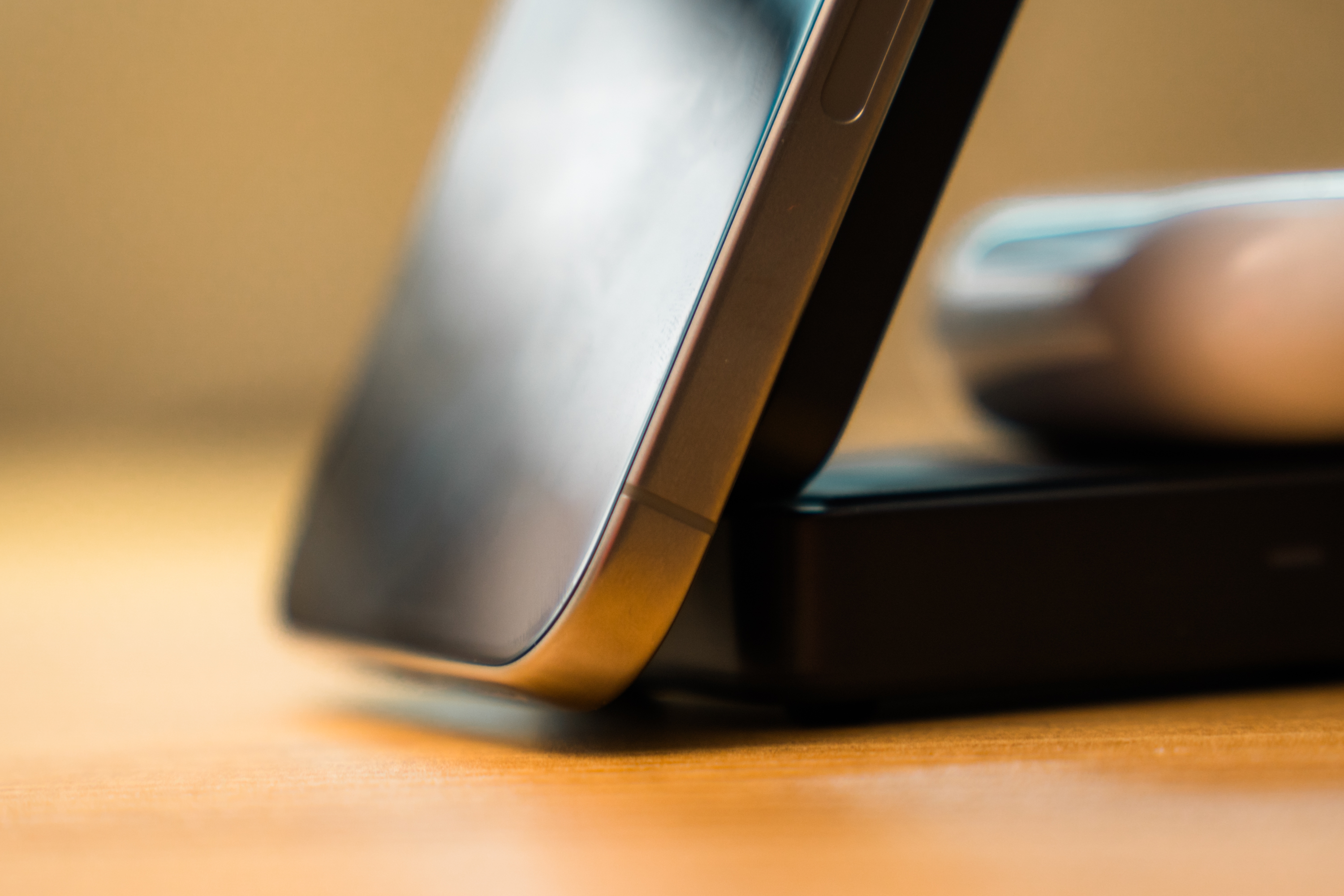 폴딩 구조라 크기는 확실히 작습니다. 한 손에 충분히 쥘 수 있을 정도. Qi2 충전부가 상단에 노출되어 있기에 폴딩한 상태로도 아이폰을 충전할 수 있습니다. 스탠드를 들어 올리면 에어팟 충전부를 쓸 수 있습니다. 스탠드 각도를 자유롭게 조절할 수 있는 프리스탑 구조로 원하는 각도로 폰을 거치할 수 있습니다. 아이폰 15 프로 맥스를 거치하면 바닥에 닿을 듯 말 듯한 높이입니다.