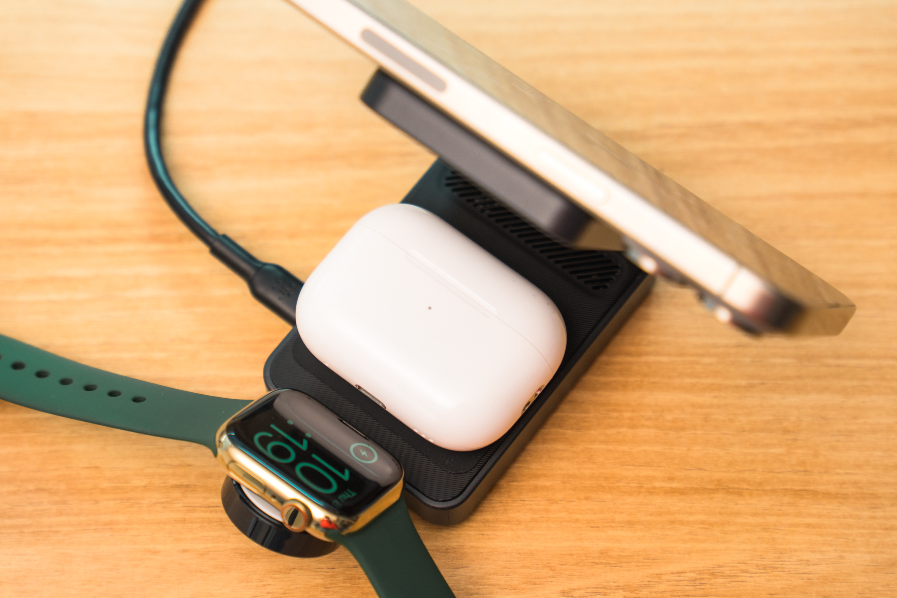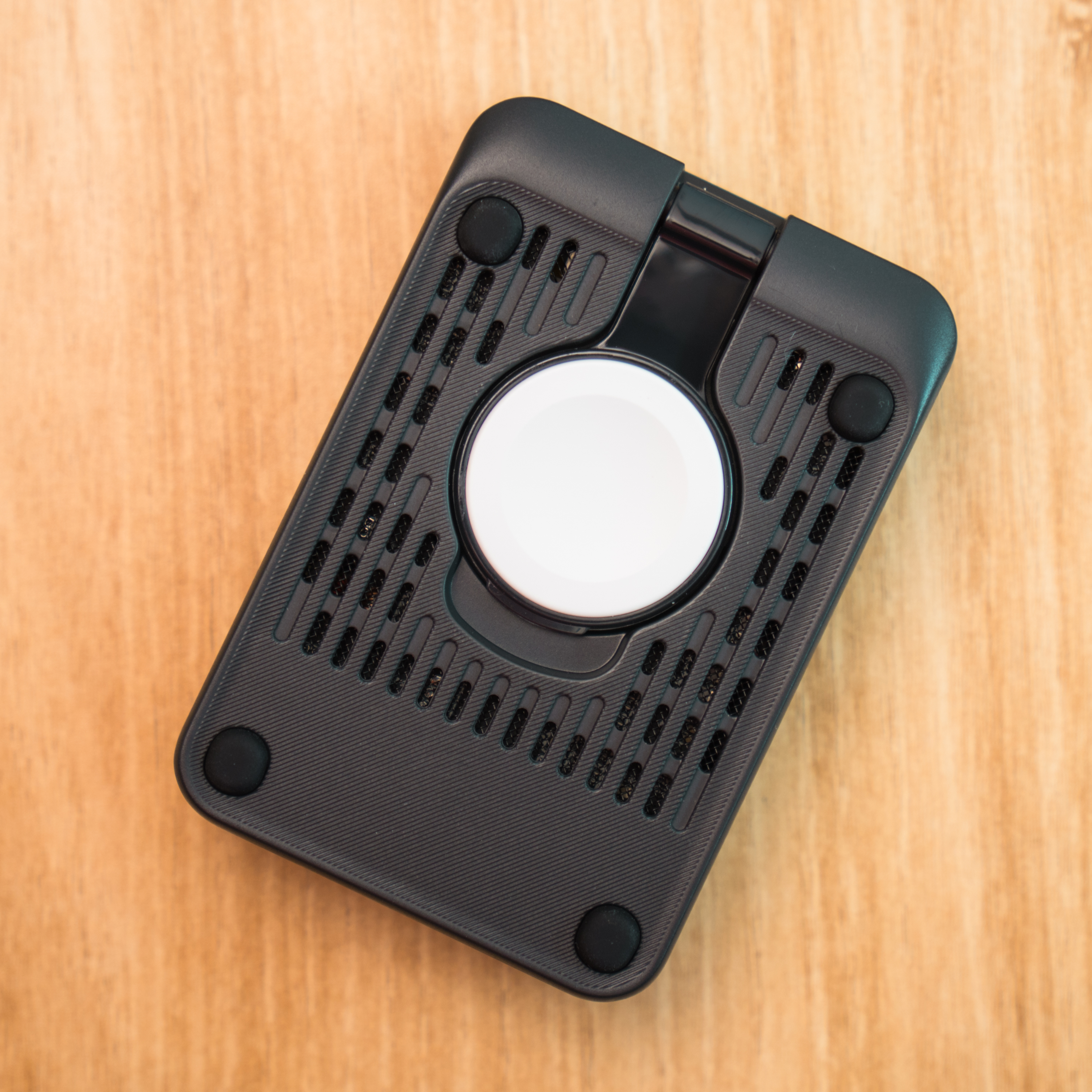 애플 워치 충전부는 아랫쪽에 접혀 있습니다. 애플 인증 모듈을 사용해서 이 부분이 흰색입니다. 워치 스탠드까지 펼치면 3 디바이스 동시 충전이 가능합니다. 단점이라면 애플 워치 충전부 높이가 낮아 일부 스트랩은 완전히 펼쳐야 거치가 가능하다는 것. 에어팟 충전부와 가까워서 사용 중 걸리적거릴 수 있다는 점 정도를 꼽겠습니다. 휴대성을 위한 불편이니 감수할 수 있습니다만 탁상용으로 사용할 땐 아쉬운 구조입니다.