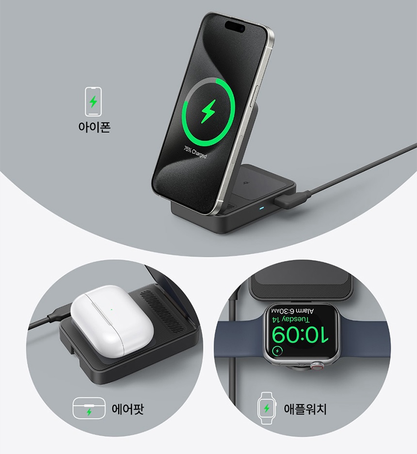 지금 사용 중인 벨킨의 3 in 1 맥세이프 충전기와 한 번 비교해 보려고 합니다. 성능과 안전성이 좋지만 부피가 크고 별도 어댑터를 사용해야 하는 것이 단점인데 앤커 제품이 탁상용으로도 쓸 만하다면 완전히 대체할 수 있을 테니까요. 물론 앤커 제품도 단점이 있겠죠?