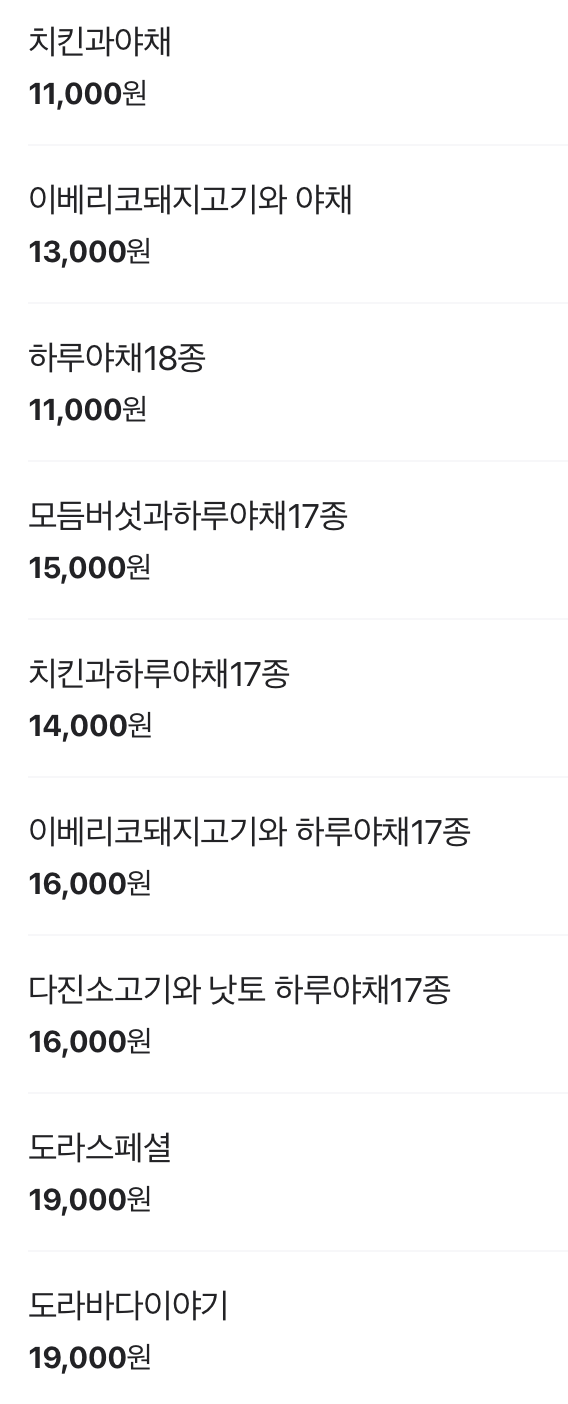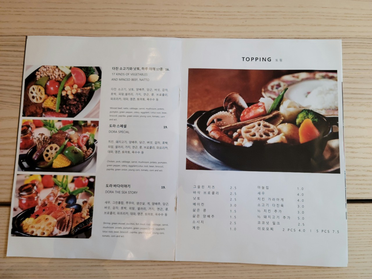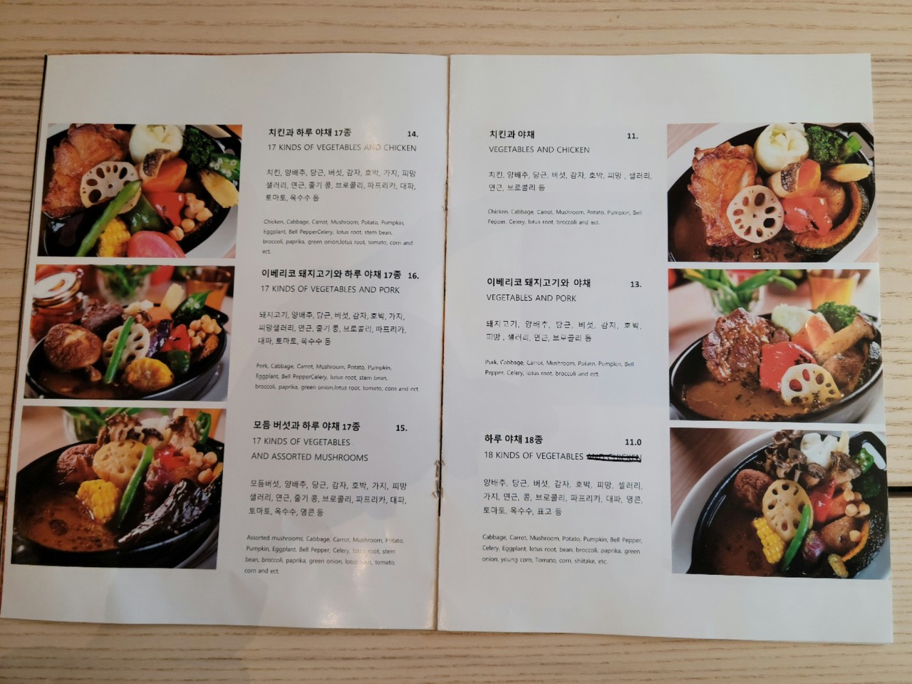기본 카레는 동일한 것 같고 들어가는 재료들로 메뉴가 구분 됩니다. 저렴한 치킨, 야채부터 이것저것 다 있는 스페셜까지. 도라바다이야기는 아마도 해산물 같죠? 저는 두 번 방문했는데 한 번은 치킨과 하루야채 17종, 한 번은 이베리코 돼지고기를 먹었습니다.