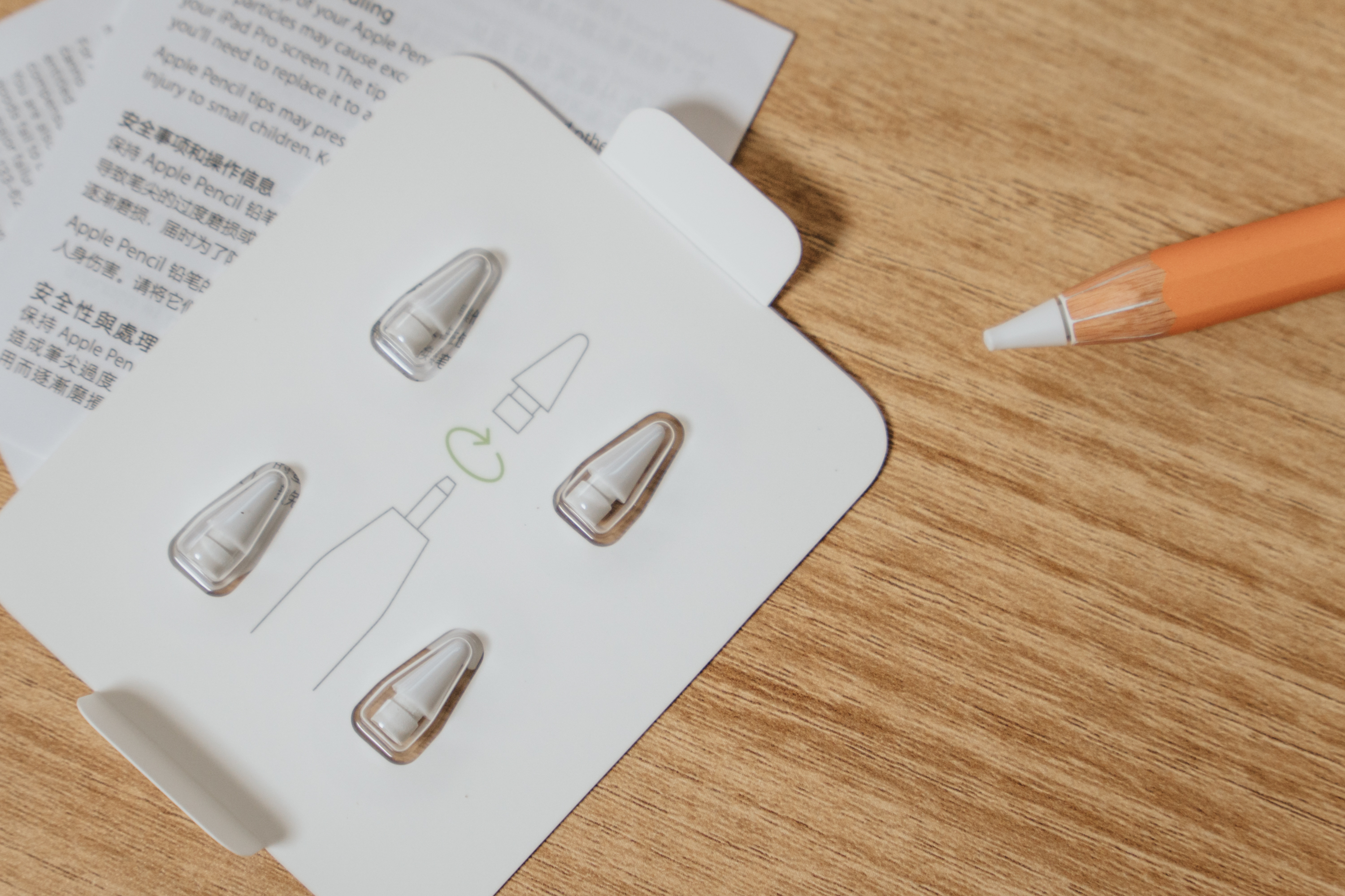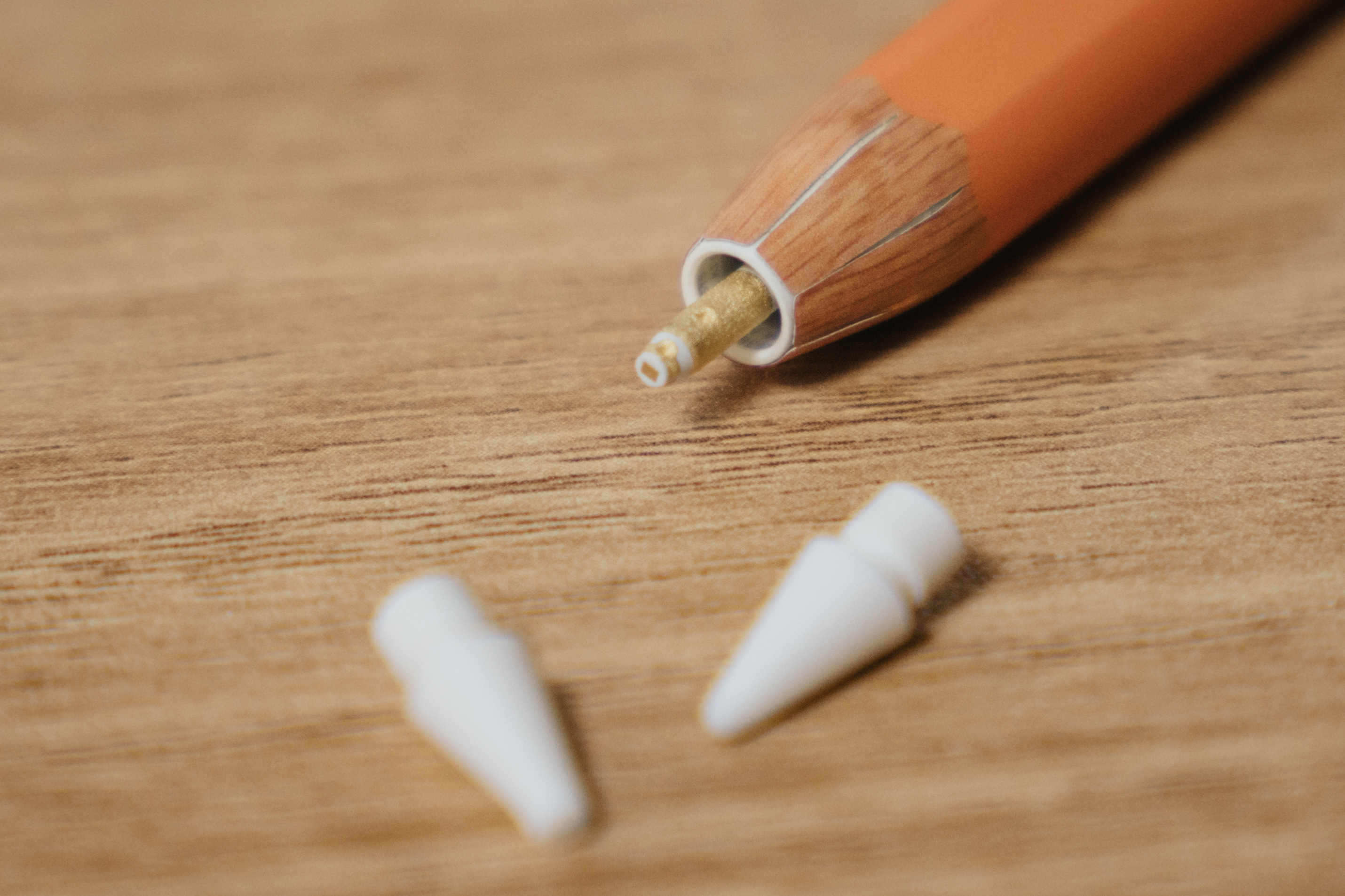 교체 방법 간단합니다. 기존의 팁을 왼쪽으로 돌려 분해한 뒤 새 팁으로 바꾸면 끝. 덕분에 펜슬 내부 구조를 보게 됩니다. 끝이 납작한 형태라 낙하 사고에서 무사했던 것 같아요. 금박지(?)로 감은 것 같은 모양새가 재밌기도 하고 애플 제품 답지 않게 허술해 보이기도 하고 뭐 그렇습니다.