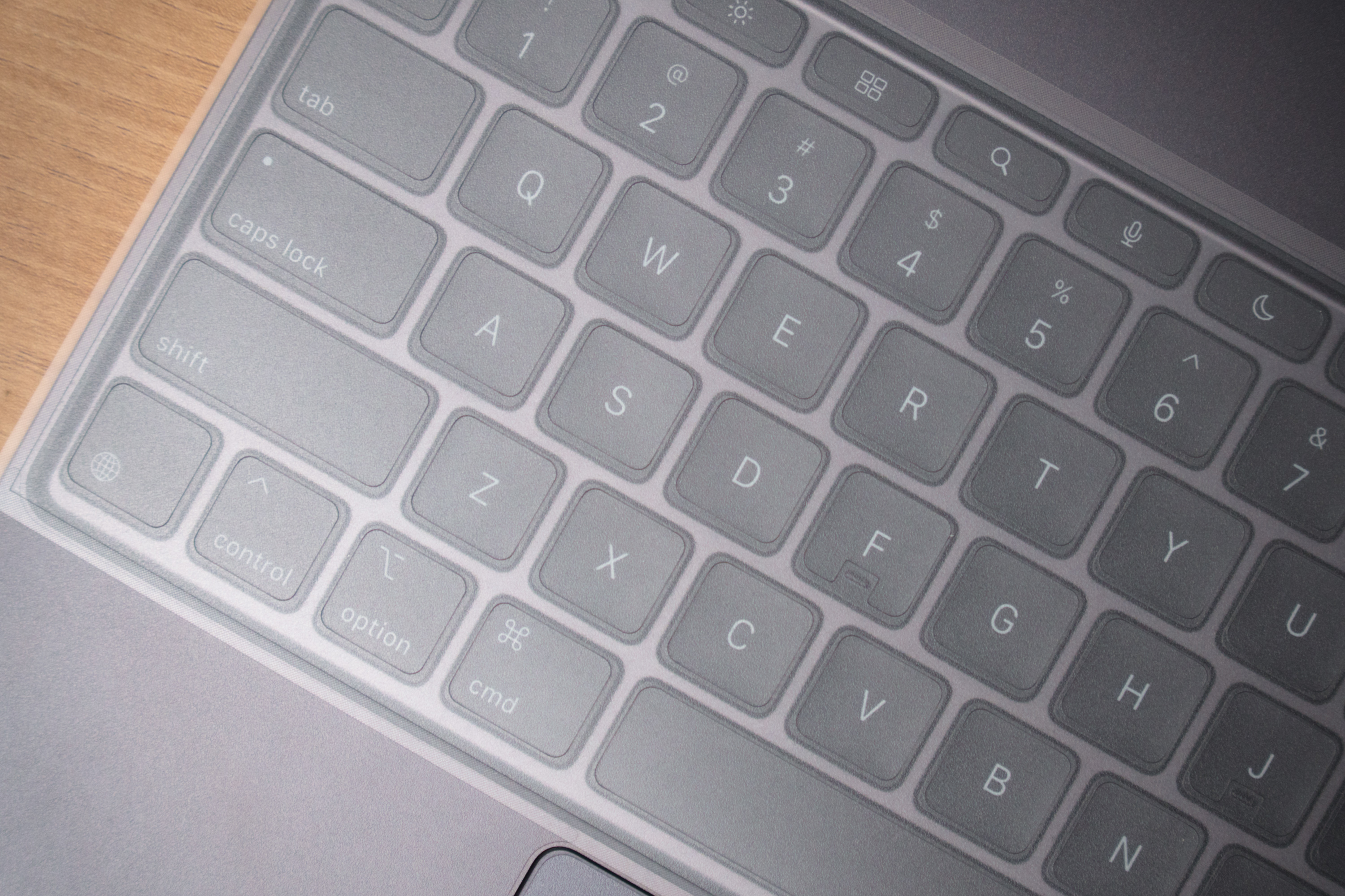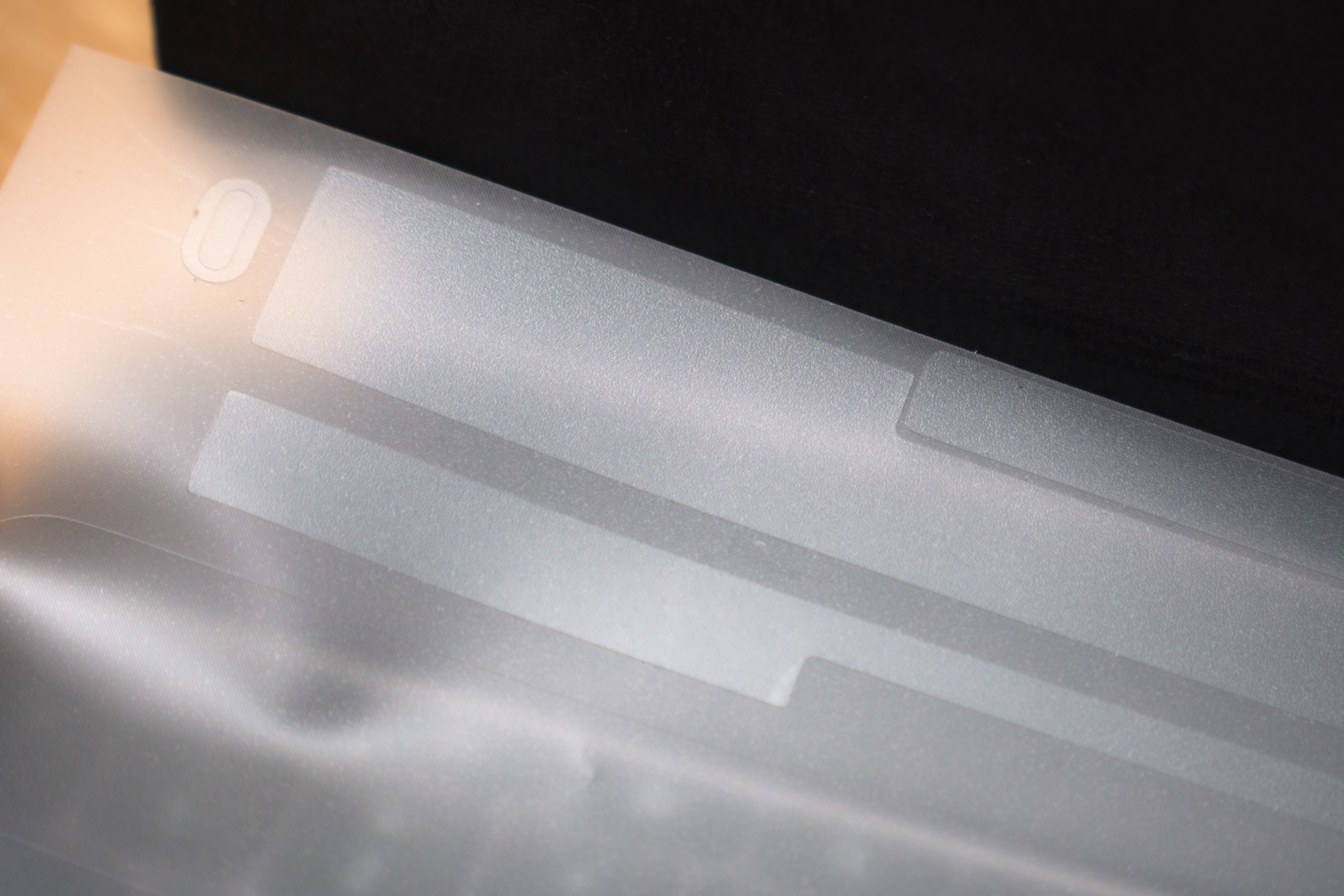 다음은 키보드 자판 보호필름. 부착 면적이 넓은데 키캡이 분리돼 있는 구조라 부착이 까다로울 것이라 생각했는데 큰 문제 없었습니다. 사실 자판 보호필름은 타자 칠 때 감촉에 차이를 줘서 부착을 망설였는데 막상 부착하니 좋은 점이 더 많아요. 번들번들한 맥북 키보드랑 비교해보면 말이죠. 그래서 자판 보호필름까지 포함해서 4종 패키지를 판매해도 좋지 않을까,라고 생각해 봤습니다. 자판 보호필름은 패키지 상품이 아니라 2매가 들어 있습니다.