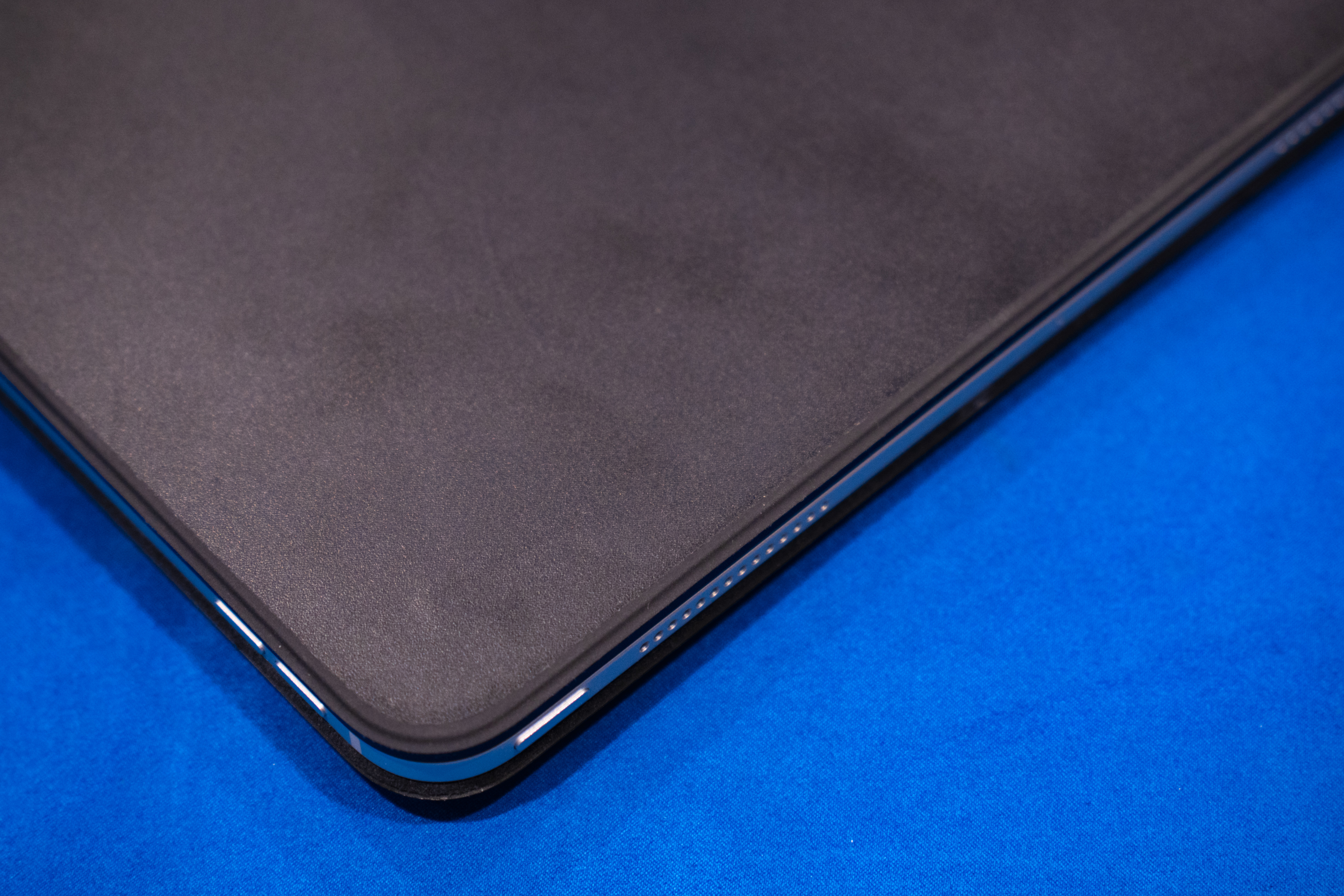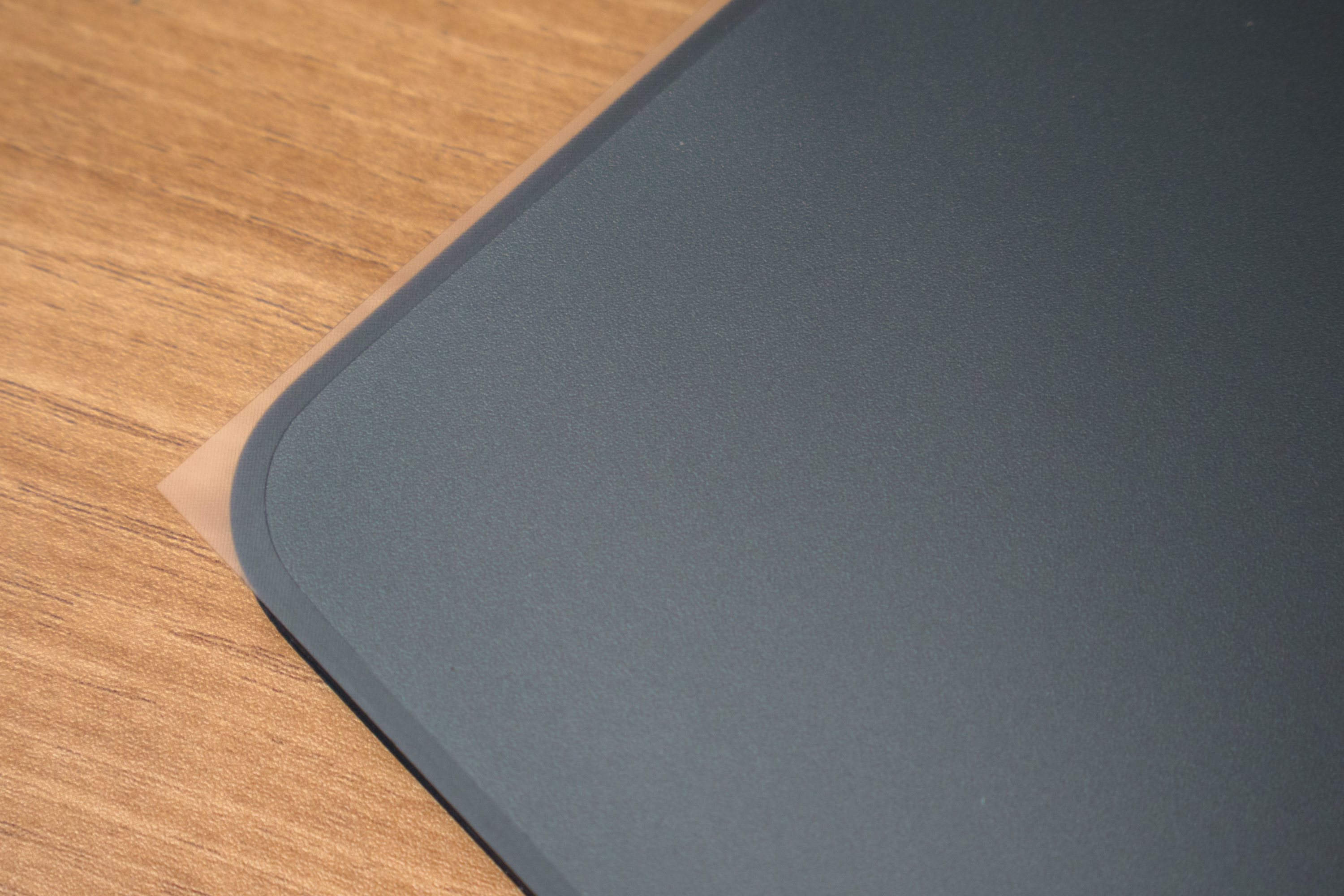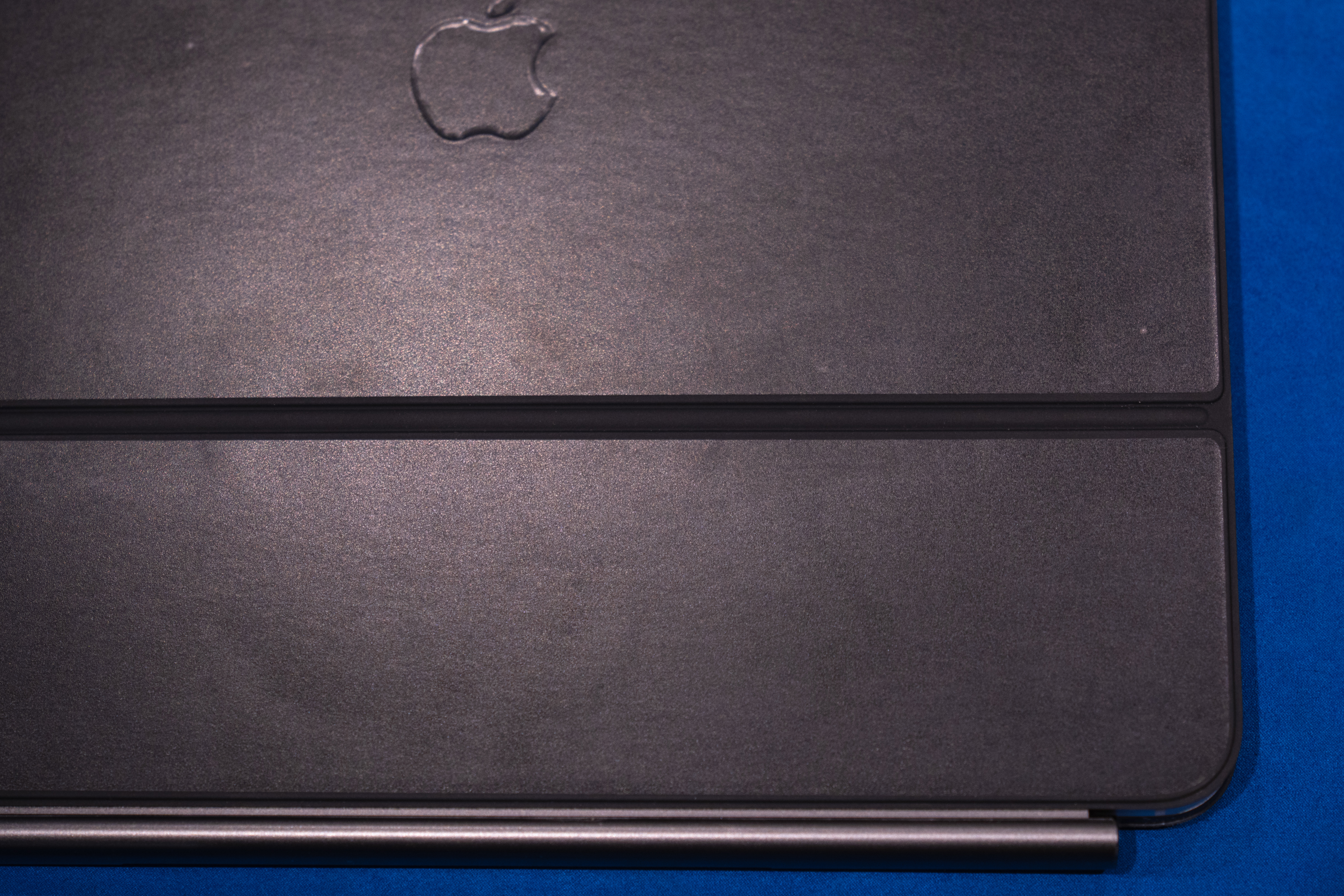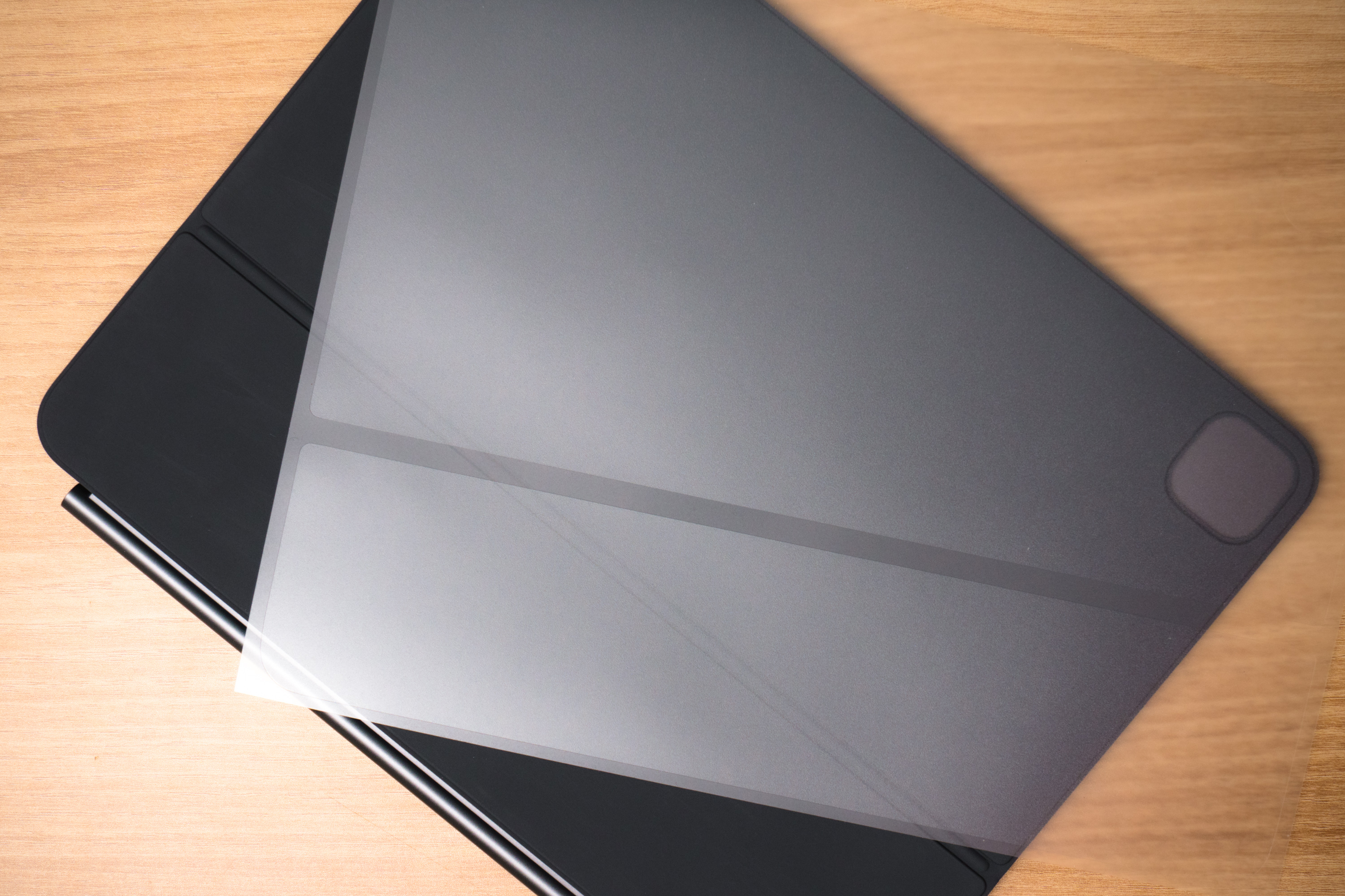 내구성 역시 끊임없이 지적돼 왔습니다. 과거 키보드 폴리오 시절엔 모서리가 찢기거나 벌어지기 일쑤였고 아예 벗겨지기까지 했다죠. 새 모델을 받아보니 11인치 아이패드 프로와 함께 사용했던 이전 모델보다 나아지긴 했습니다. 팜레스트쪽 소재가 메탈로 바뀌면서 내구성뿐 아니라 오염도 덜 신경쓰게 됐어요. 외부 소재도 전보다 단단한 느낌입니다만 소재 특성상 스크래치나 찍힘 등의 사용감이 쉽게 드러나는 건 여전해요. 그래서 보호 필름을 사용해 보기로 했습니다.