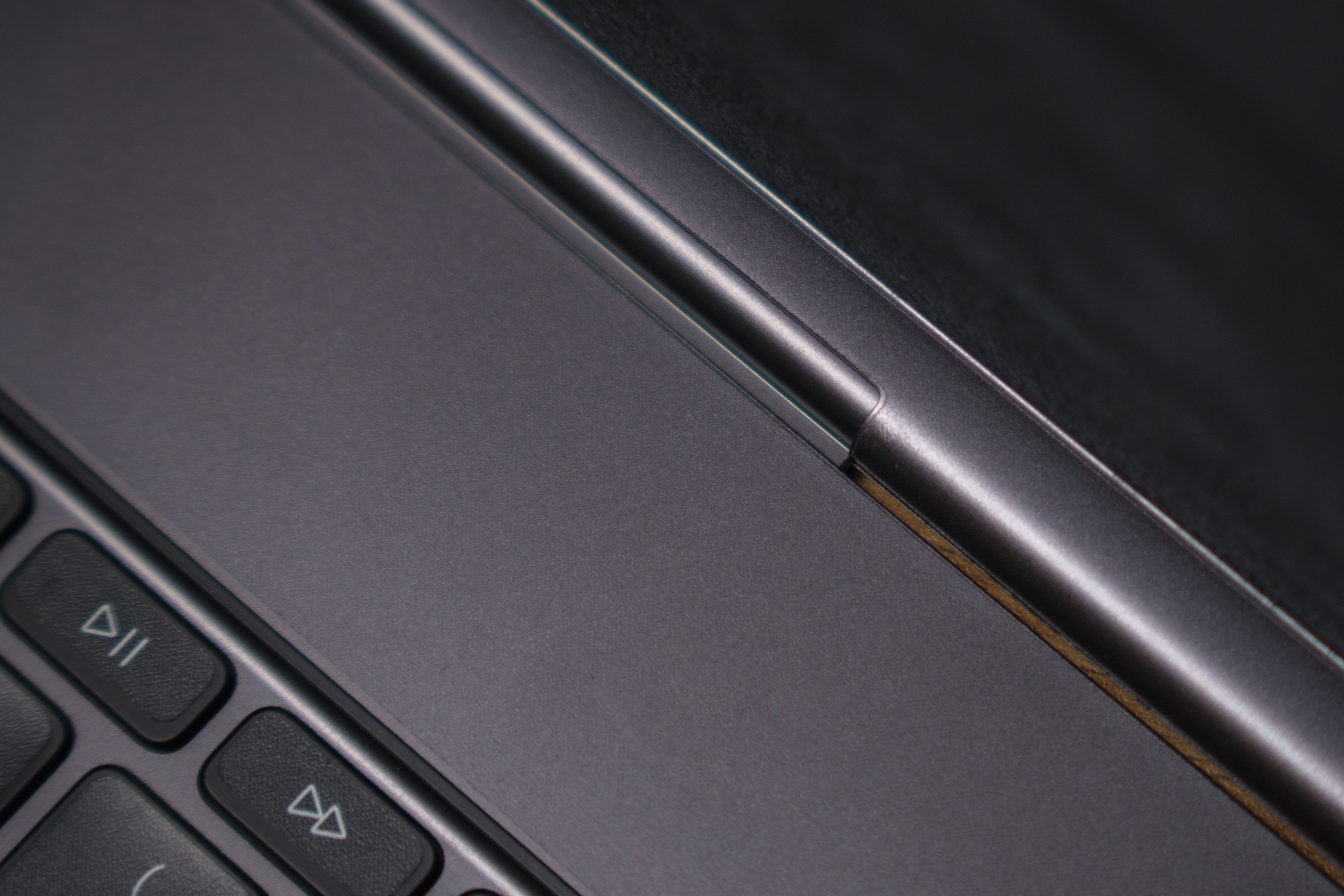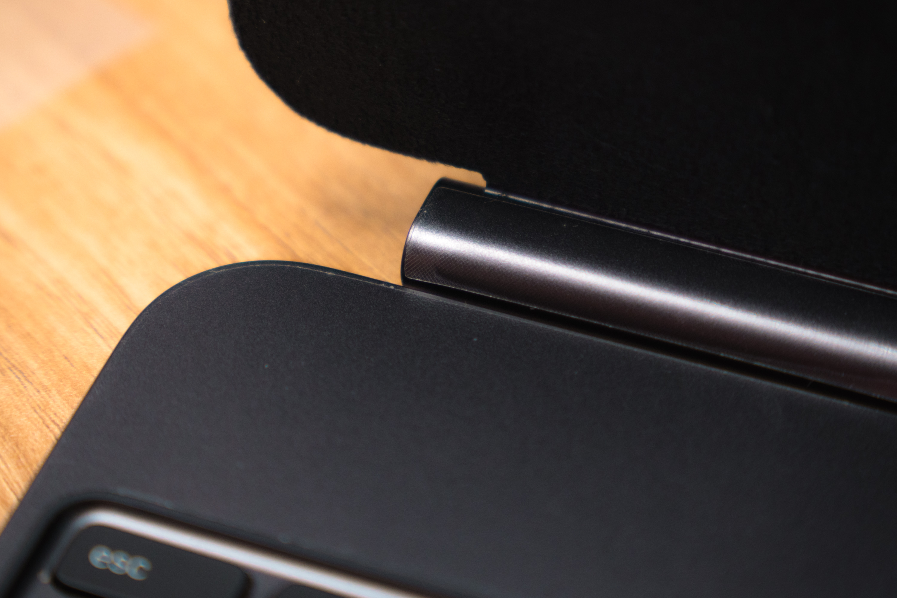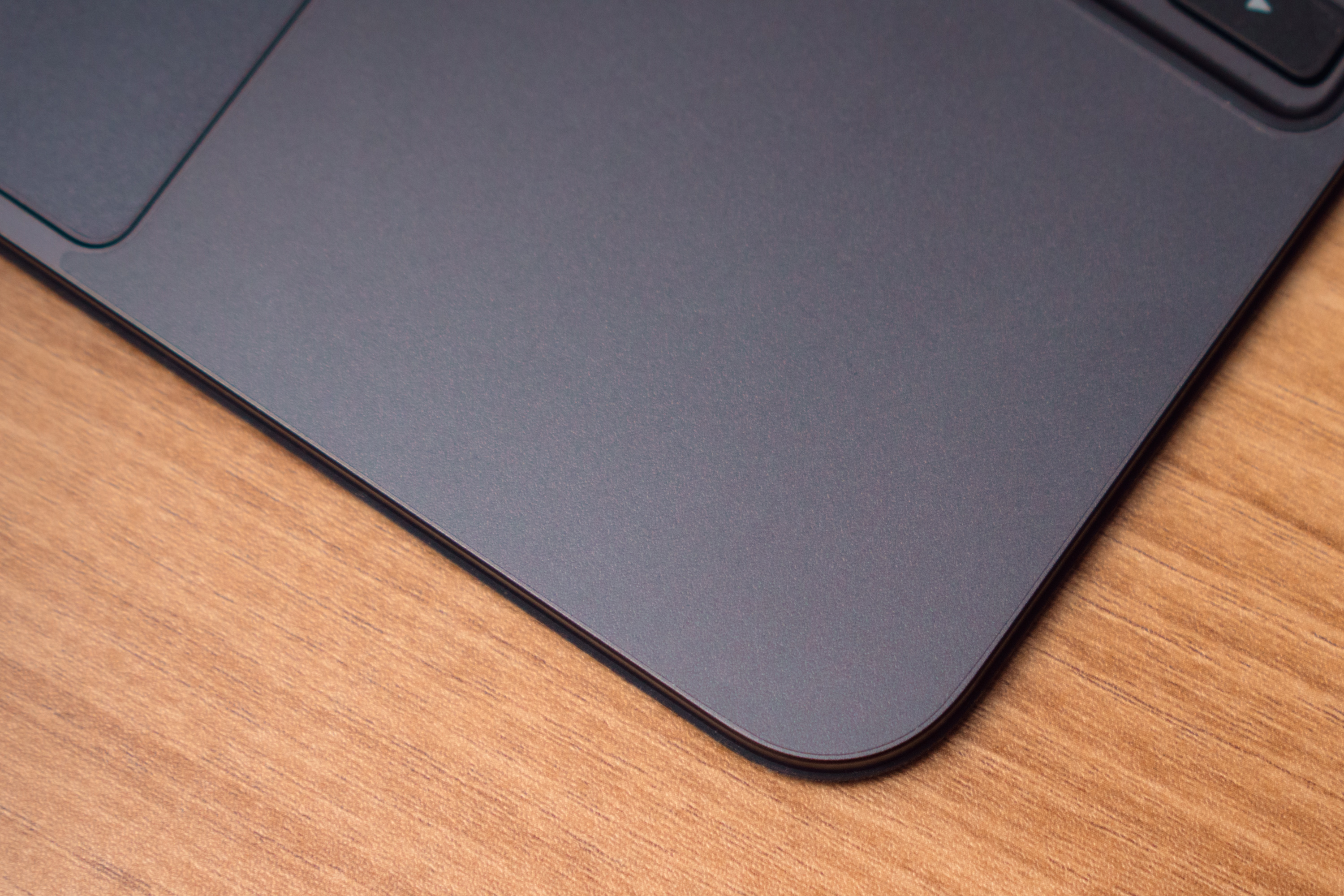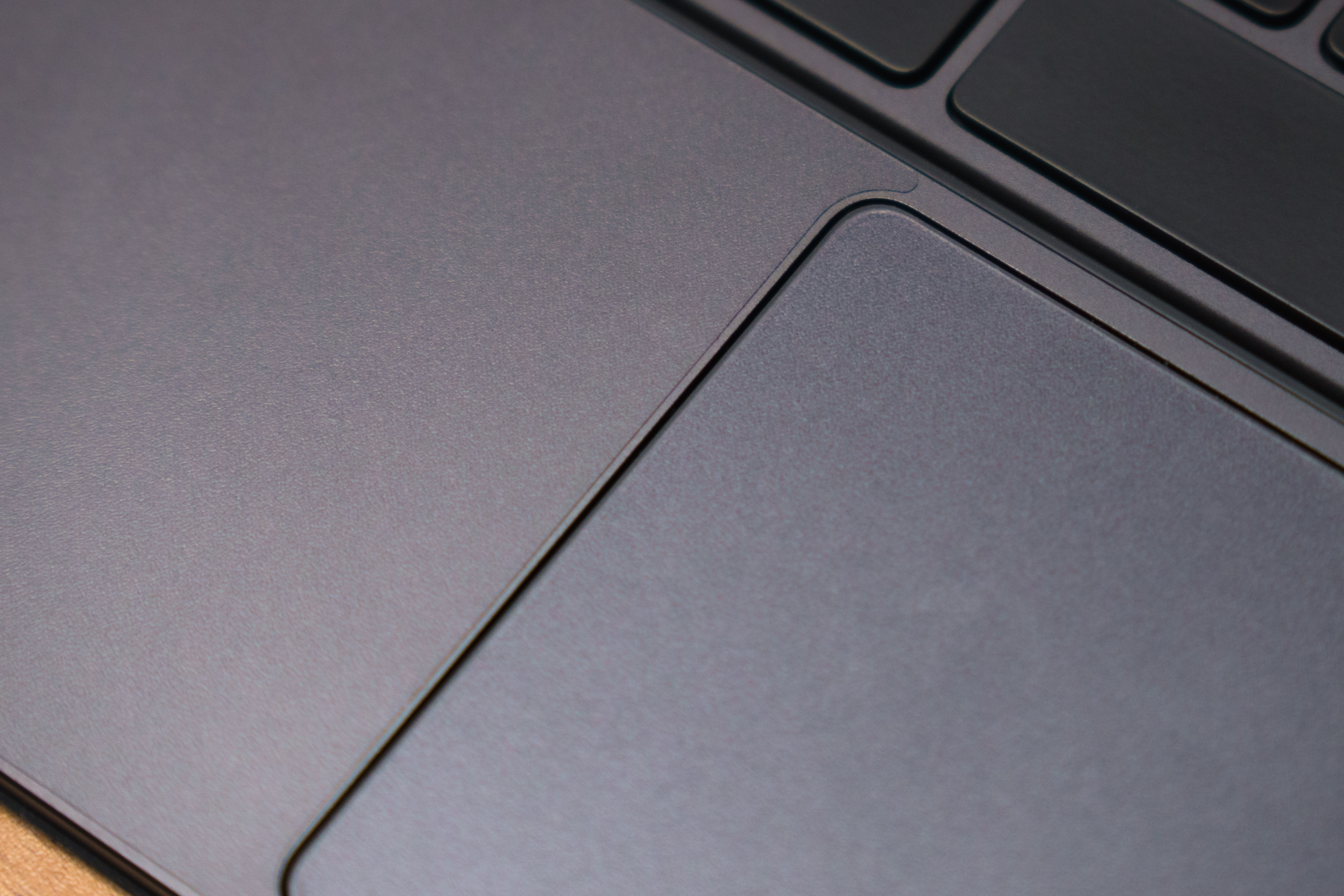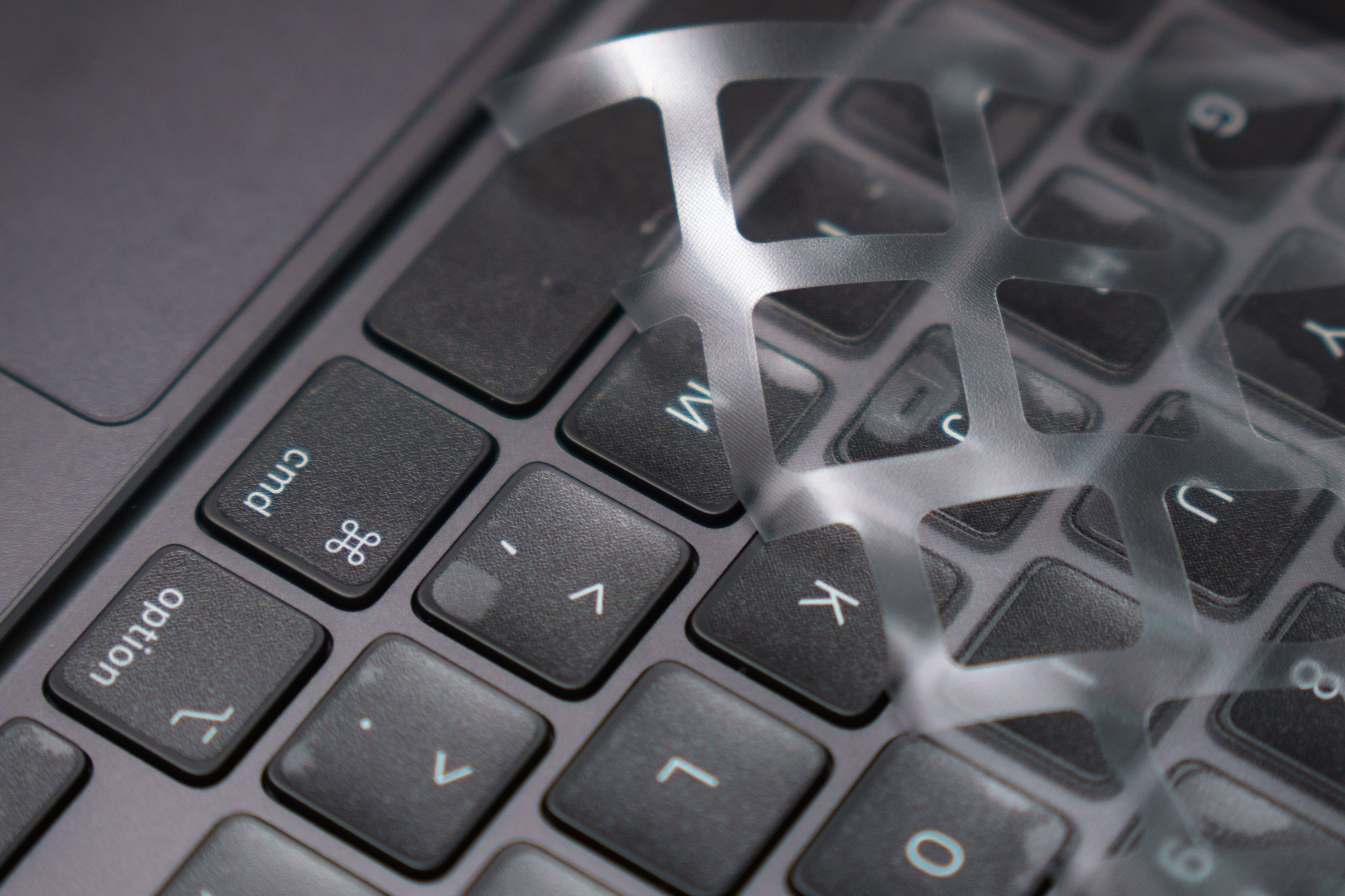 내구성 역시 끊임없이 지적돼 왔습니다. 과거 키보드 폴리오 시절엔 모서리가 찢기거나 벌어지기 일쑤였고 아예 벗겨지기까지 했다죠. 새 모델을 받아보니 11인치 아이패드 프로와 함께 사용했던 이전 모델보다 나아지긴 했습니다. 팜레스트쪽 소재가 메탈로 바뀌면서 내구성뿐 아니라 오염도 덜 신경쓰게 됐어요. 외부 소재도 전보다 단단한 느낌입니다만 소재 특성상 스크래치나 찍힘 등의 사용감이 쉽게 드러나는 건 여전해요. 그래서 보호 필름을 사용해 보기로 했습니다.