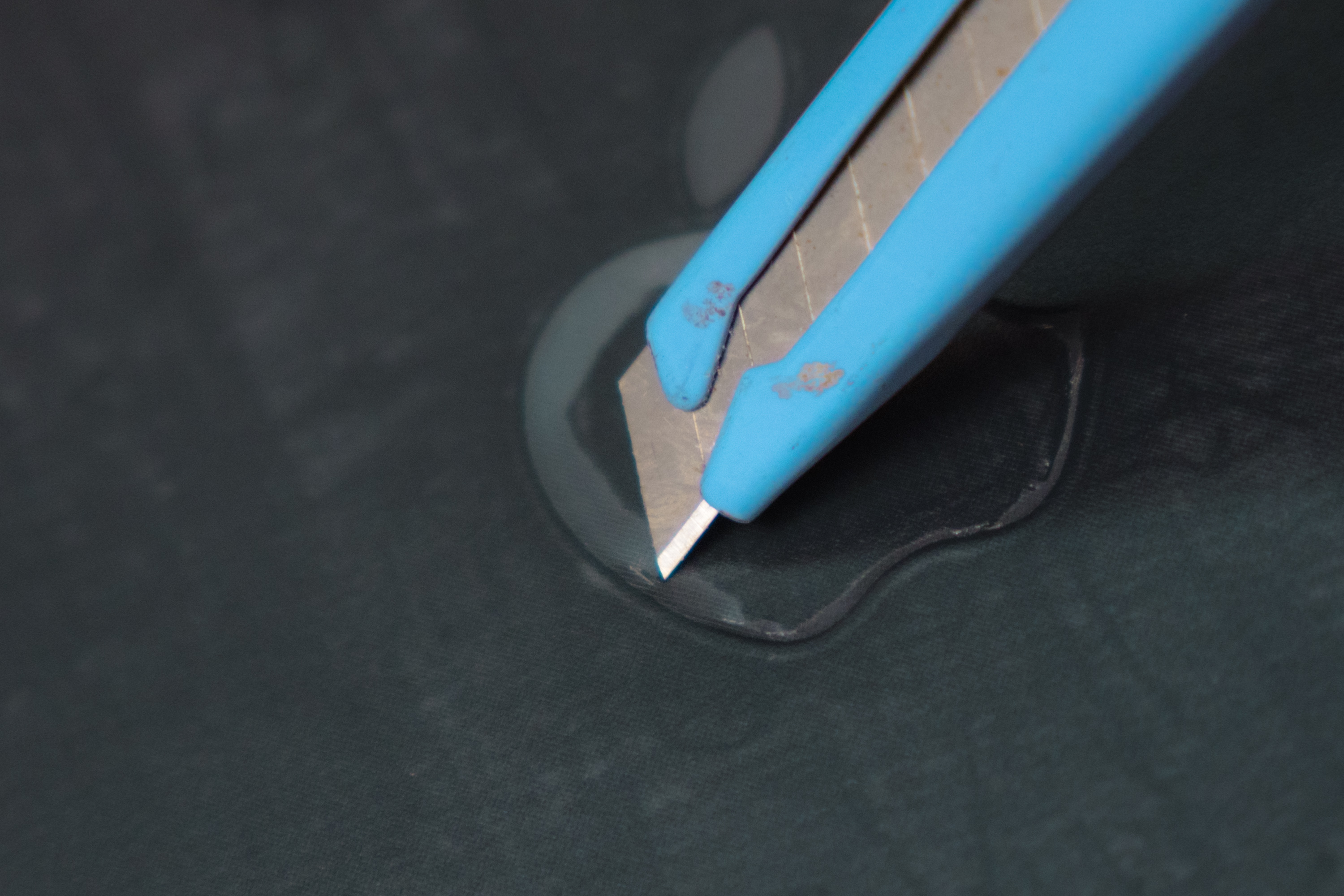 그래서 칼로 경계선쪽에 작게 칼집을 내서 안에 있는 공기를 빼고 필름을 밀착시켜봤습니다. 결과는 만족. 아주 작은 칼집만 몇 개 내면 되니 이 역시도 어렵지 않습니다.