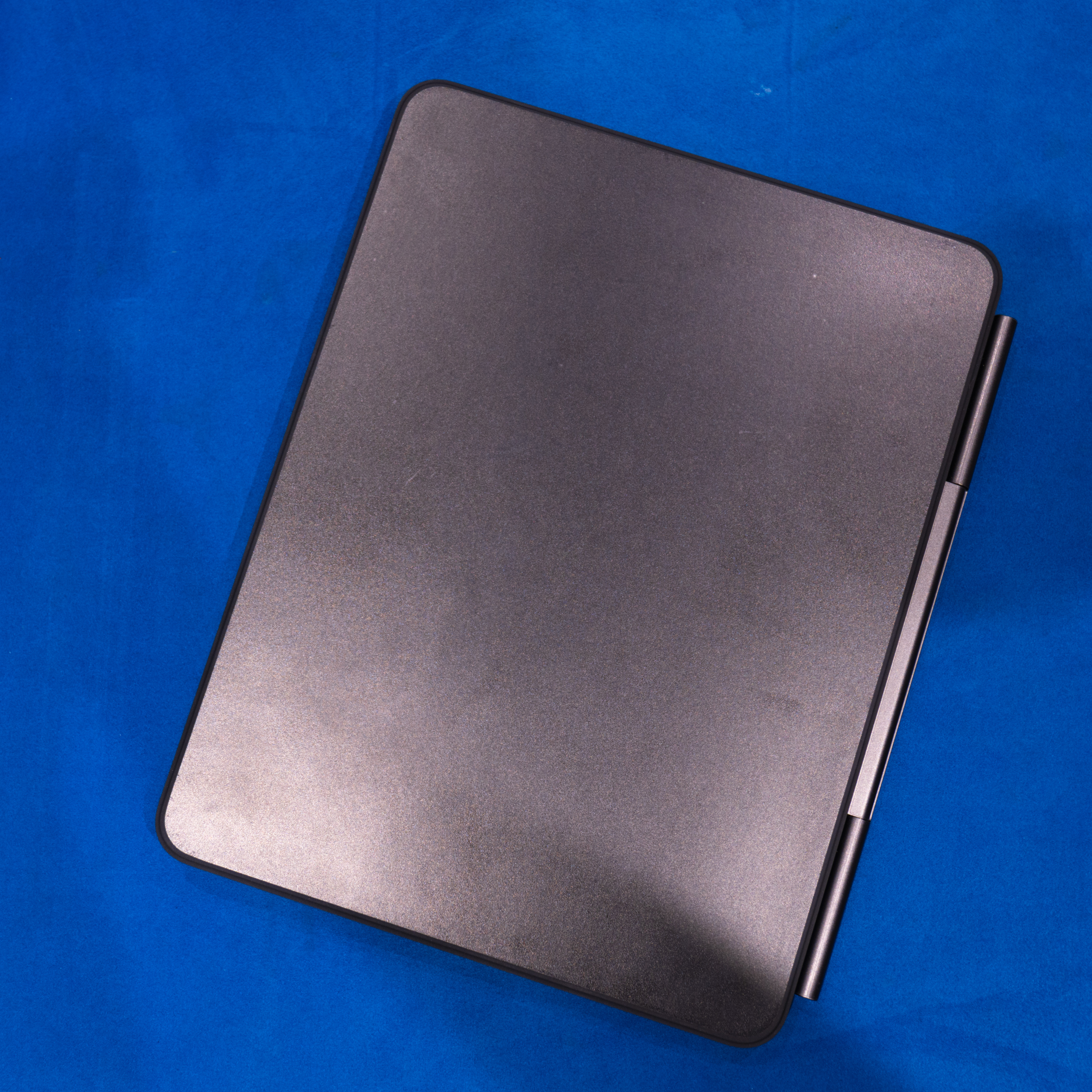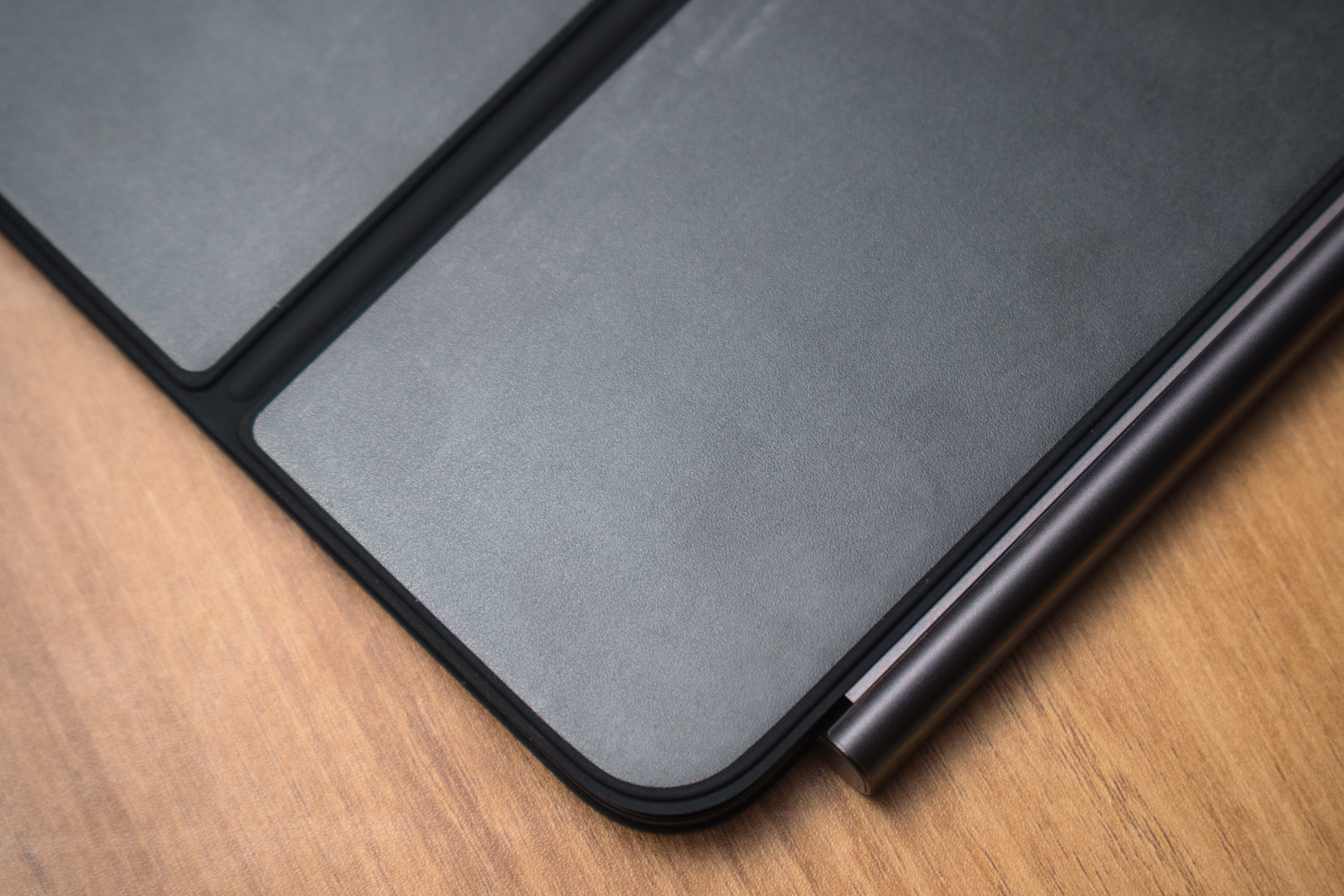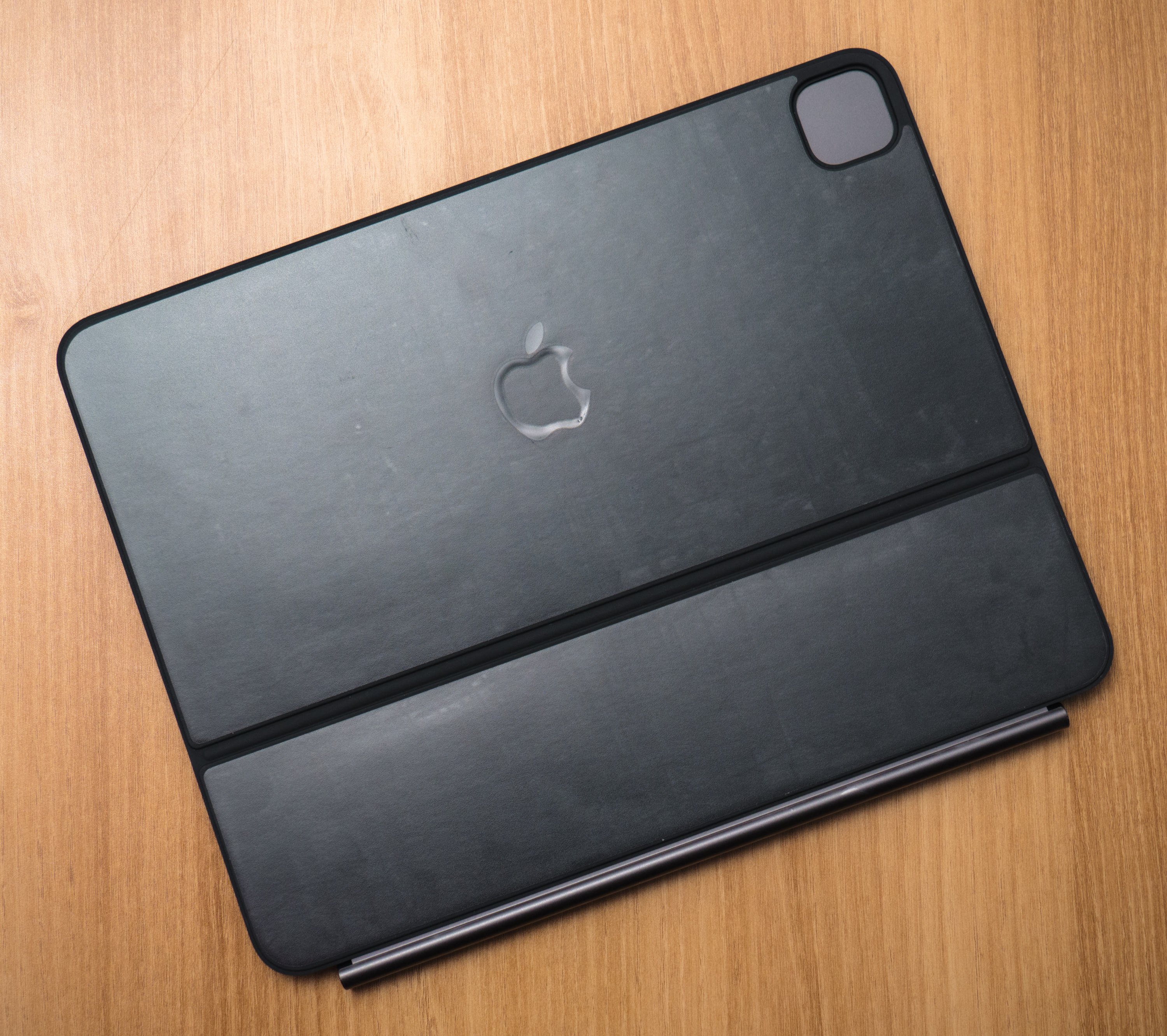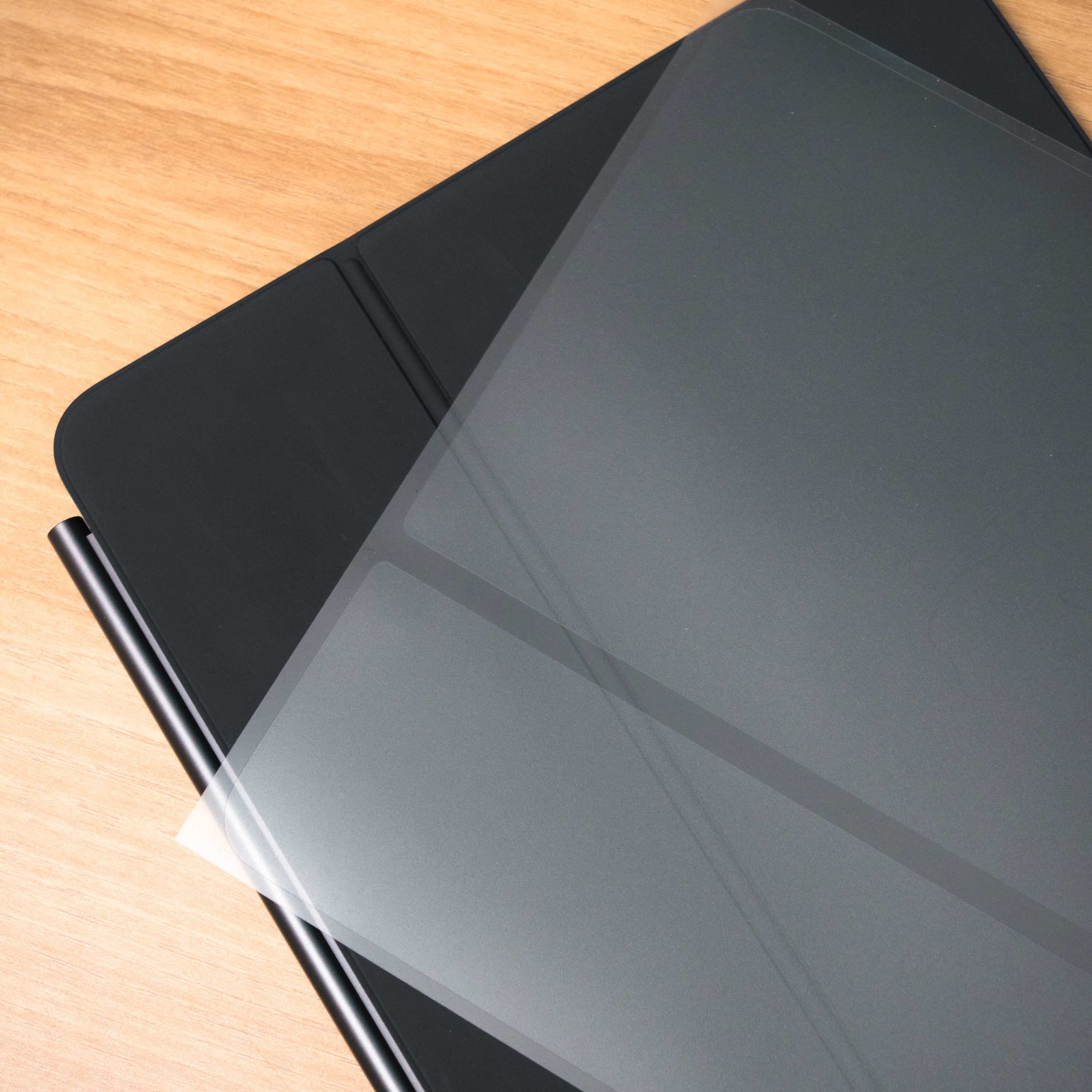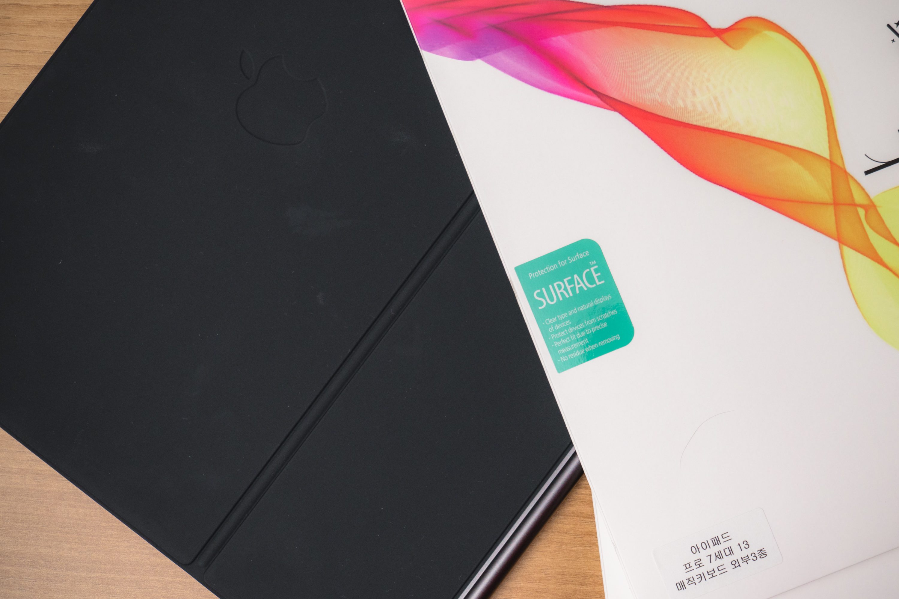 내구성 역시 끊임없이 지적돼 왔습니다. 과거 키보드 폴리오 시절엔 모서리가 찢기거나 벌어지기 일쑤였고 아예 벗겨지기까지 했다죠. 새 모델을 받아보니 11인치 아이패드 프로와 함께 사용했던 이전 모델보다 나아지긴 했습니다. 팜레스트쪽 소재가 메탈로 바뀌면서 내구성뿐 아니라 오염도 덜 신경쓰게 됐어요. 외부 소재도 전보다 단단한 느낌입니다만 소재 특성상 스크래치나 찍힘 등의 사용감이 쉽게 드러나는 건 여전해요. 그래서 보호 필름을 사용해 보기로 했습니다.
