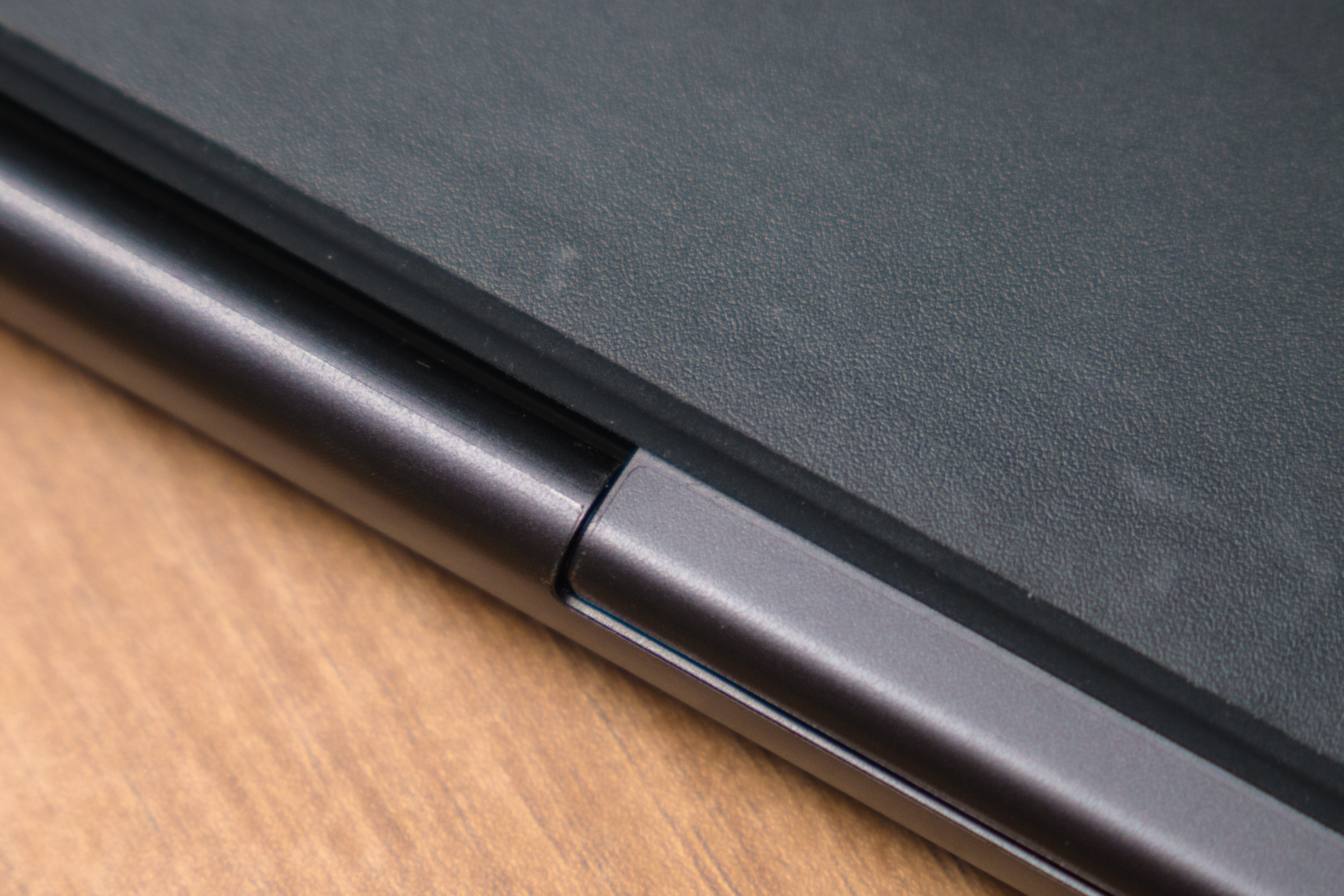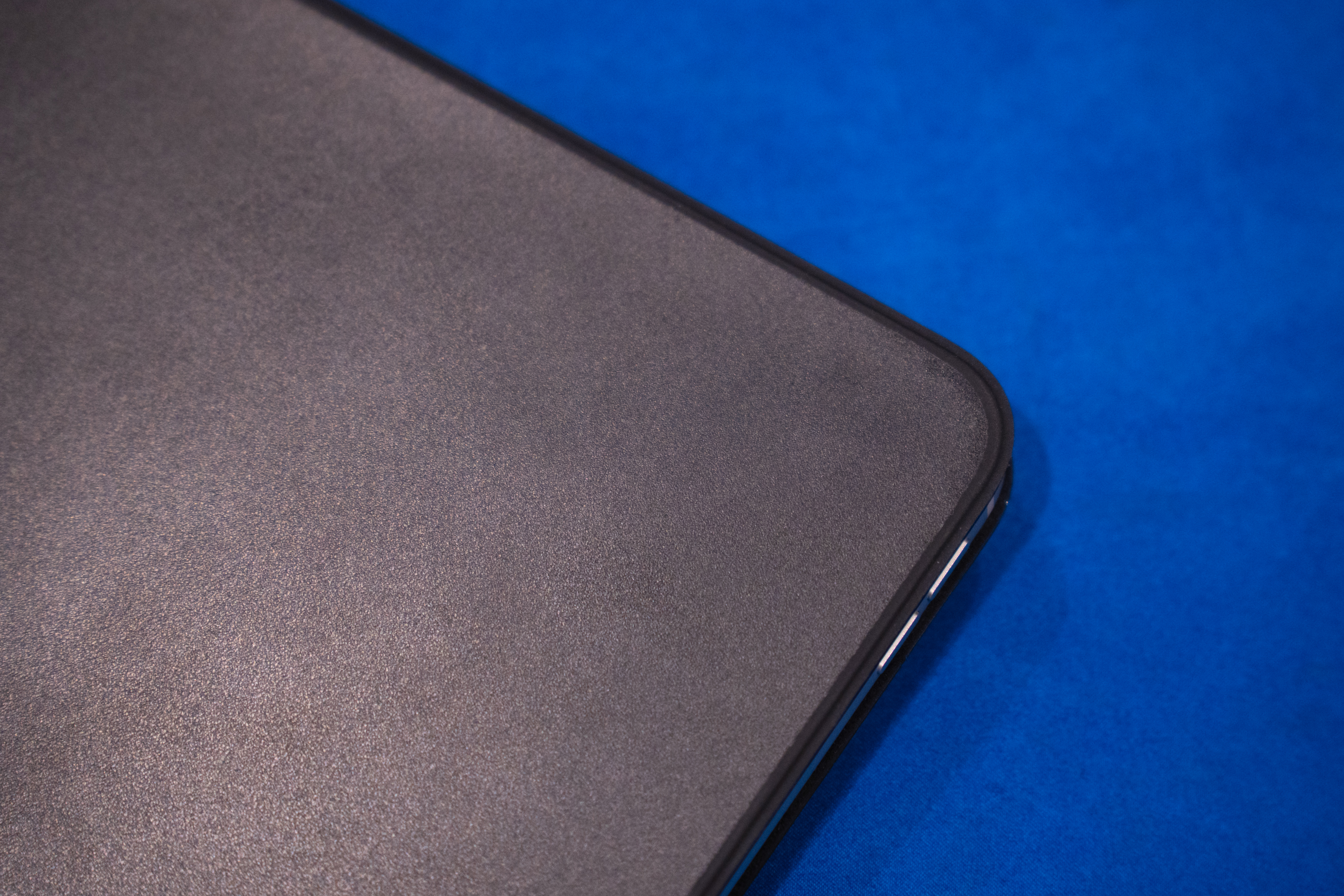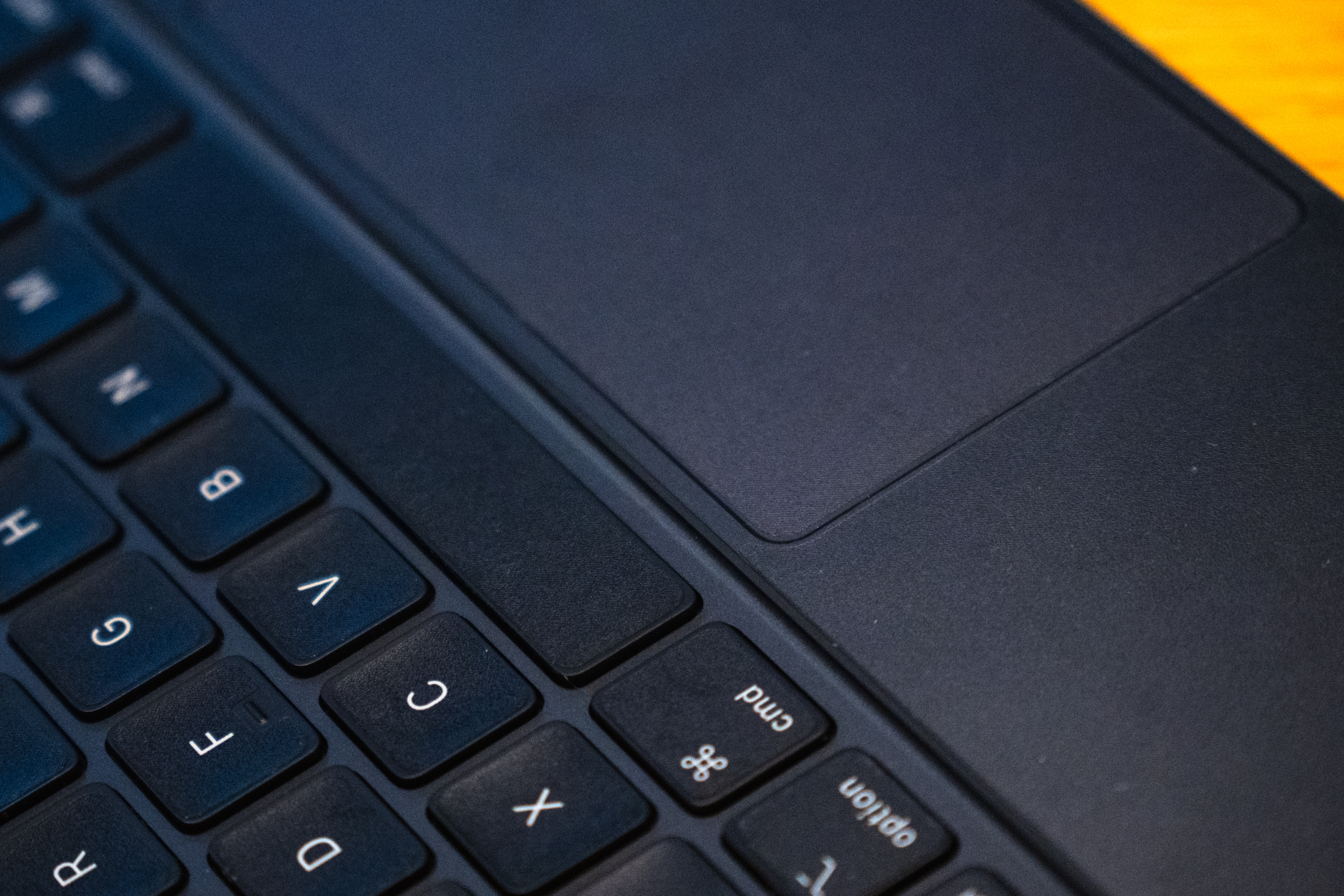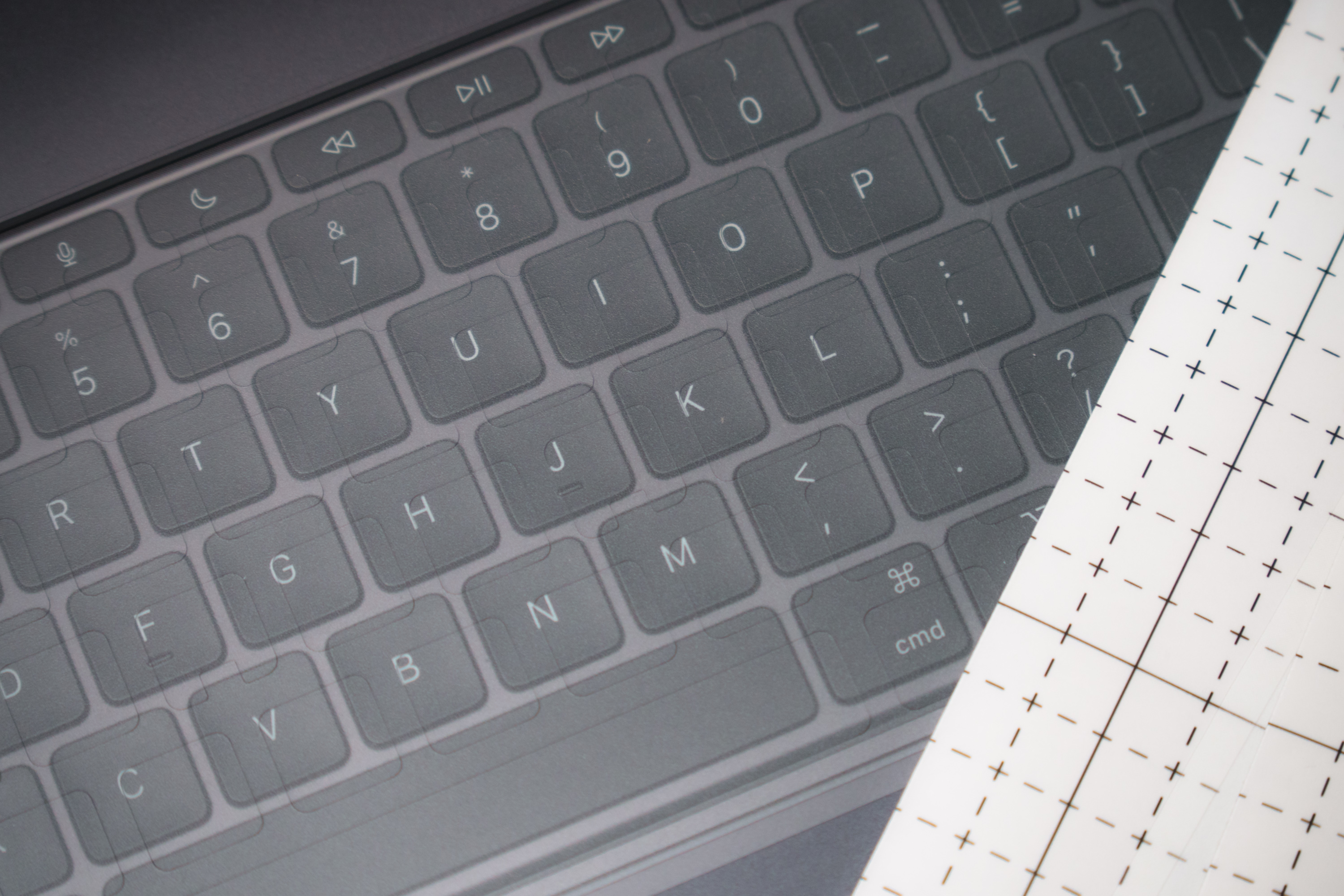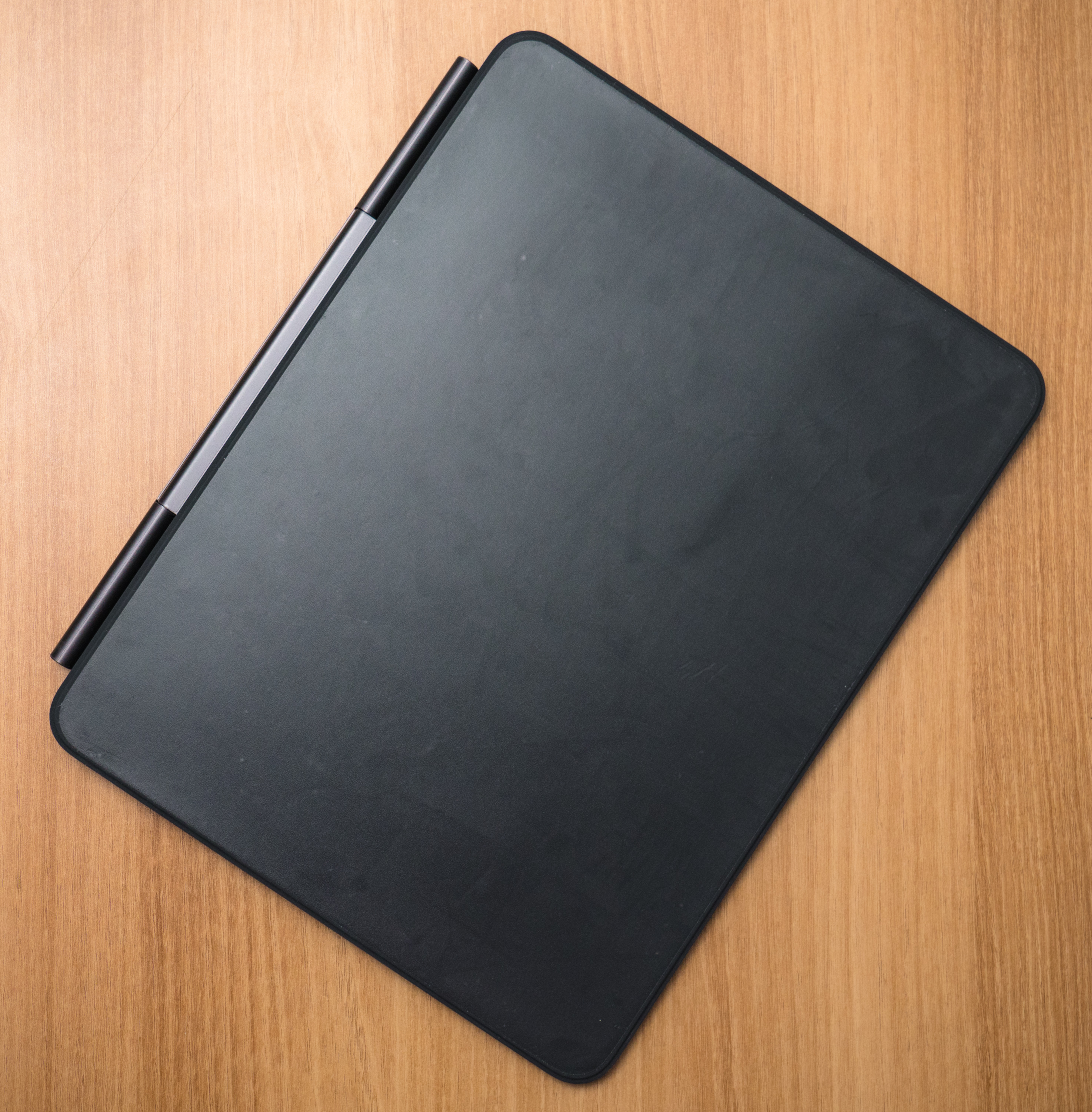 내구성 역시 끊임없이 지적돼 왔습니다. 과거 키보드 폴리오 시절엔 모서리가 찢기거나 벌어지기 일쑤였고 아예 벗겨지기까지 했다죠. 새 모델을 받아보니 11인치 아이패드 프로와 함께 사용했던 이전 모델보다 나아지긴 했습니다. 팜레스트쪽 소재가 메탈로 바뀌면서 내구성뿐 아니라 오염도 덜 신경쓰게 됐어요. 외부 소재도 전보다 단단한 느낌입니다만 소재 특성상 스크래치나 찍힘 등의 사용감이 쉽게 드러나는 건 여전해요. 그래서 보호 필름을 사용해 보기로 했습니다.