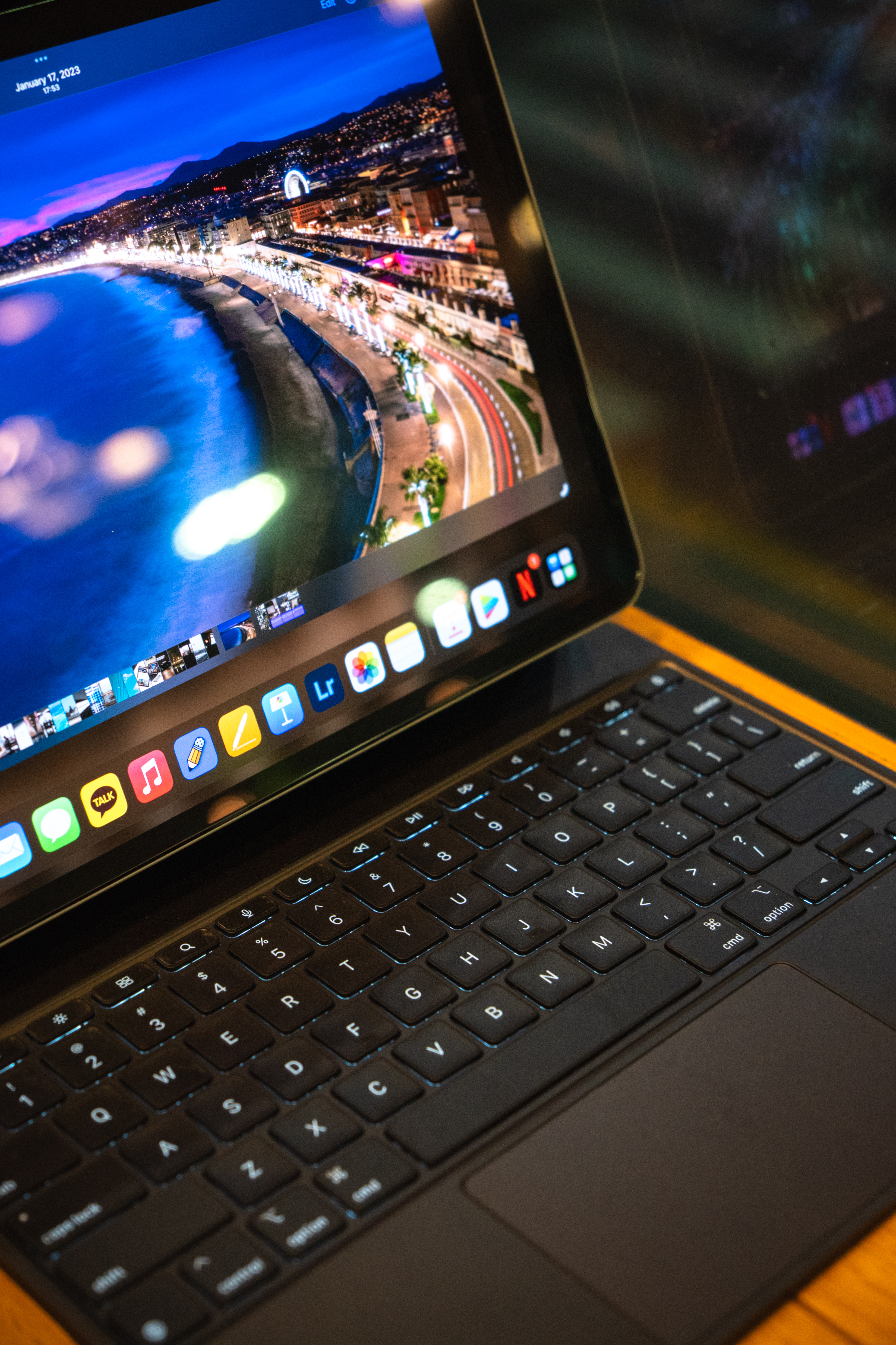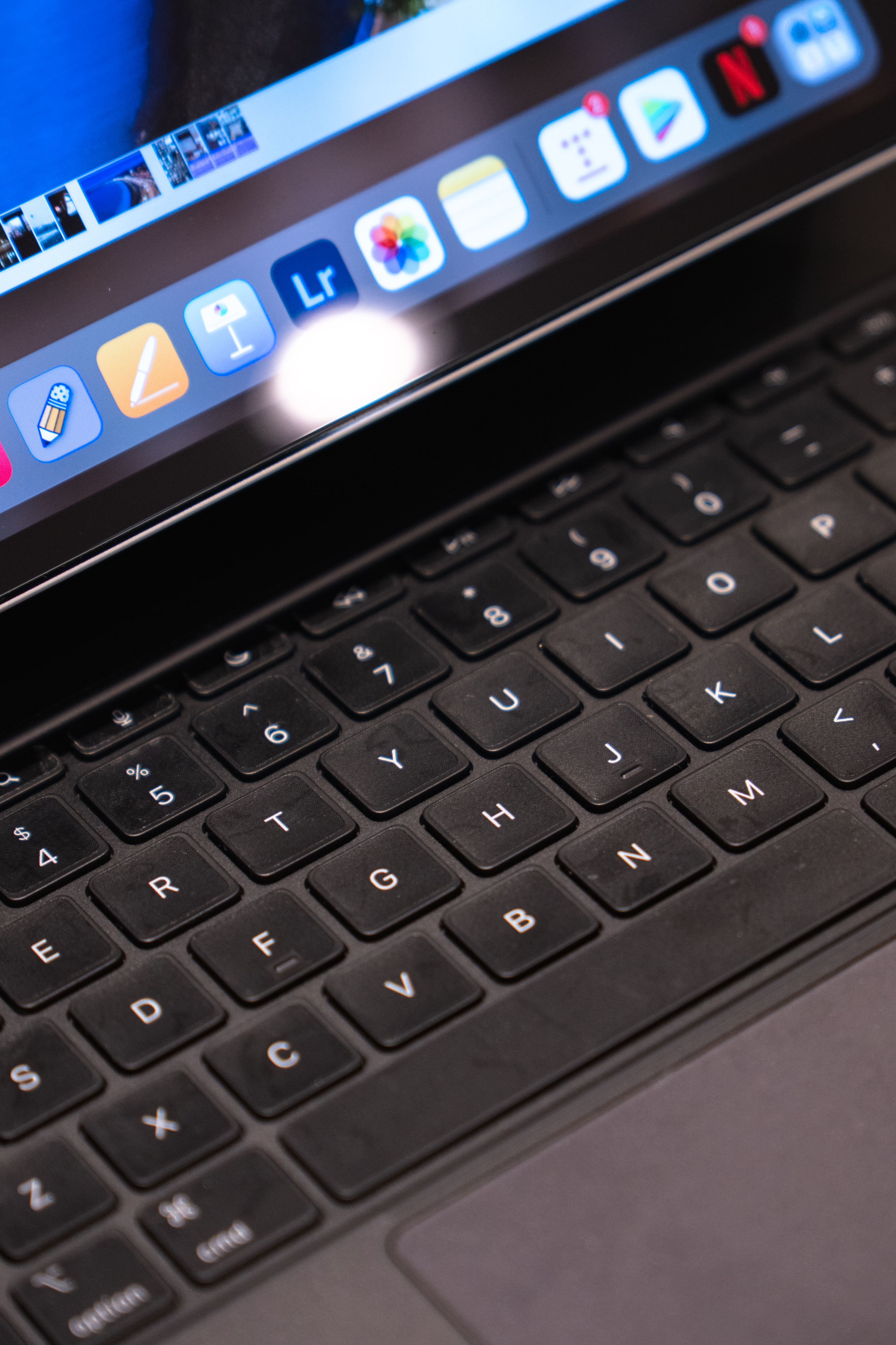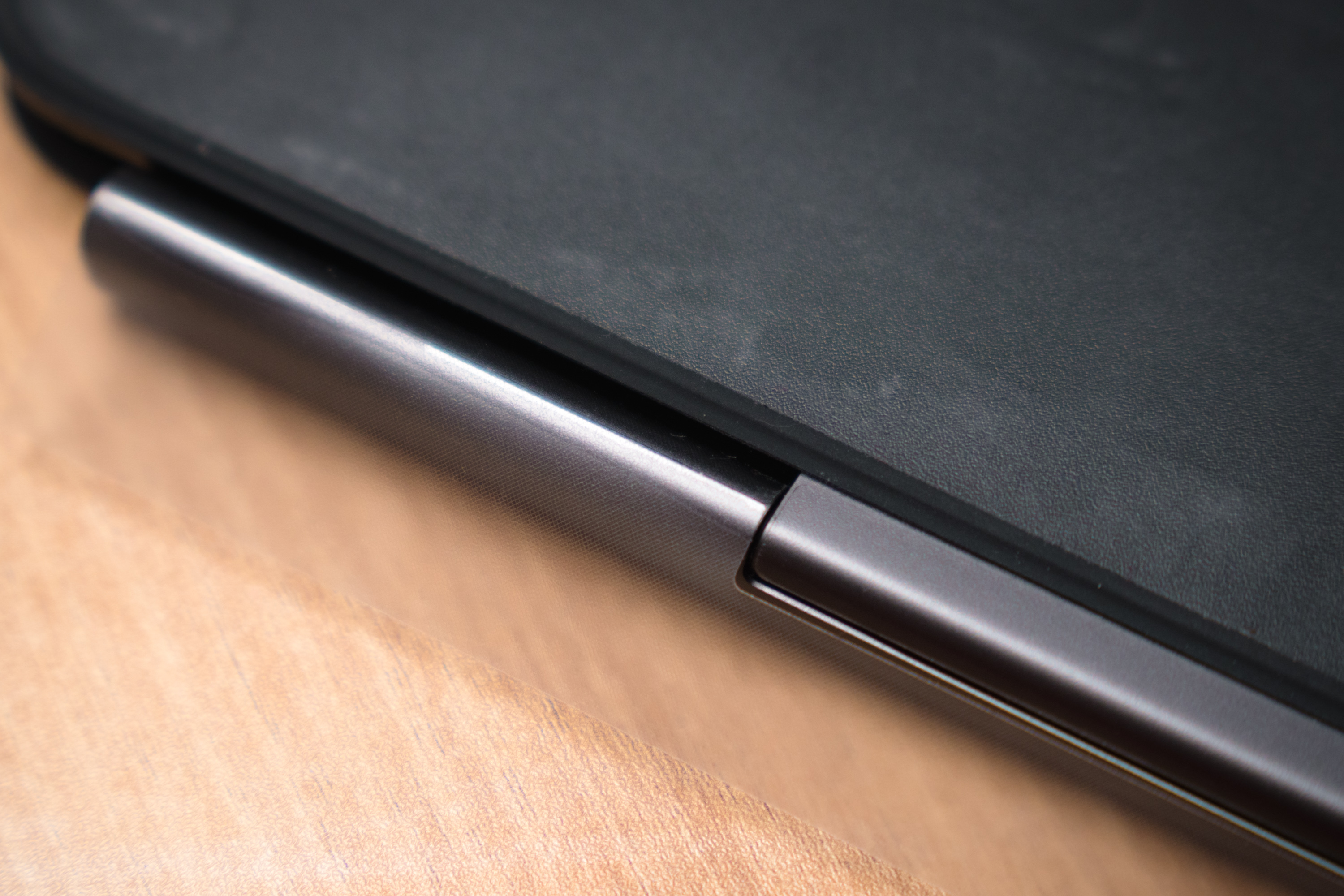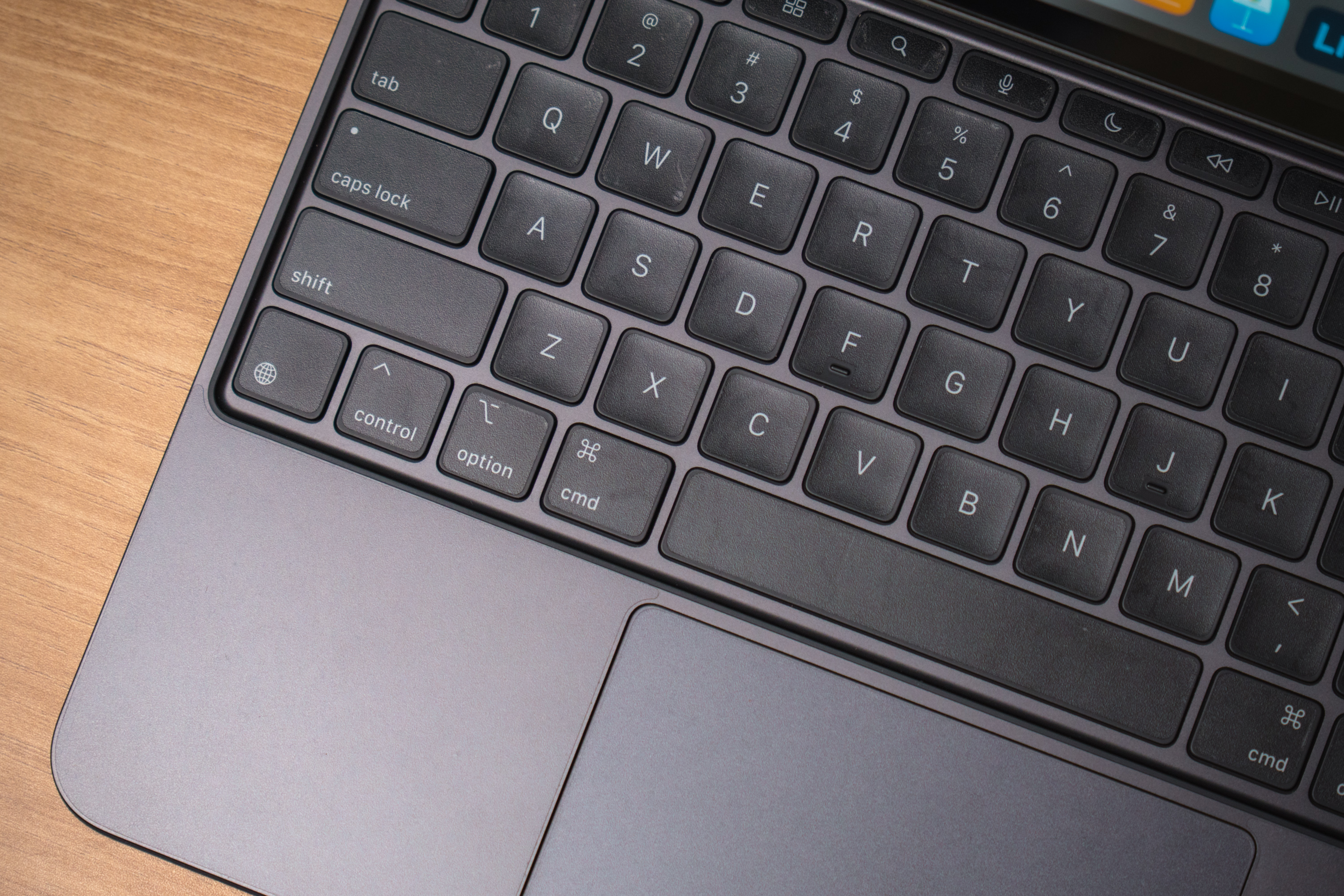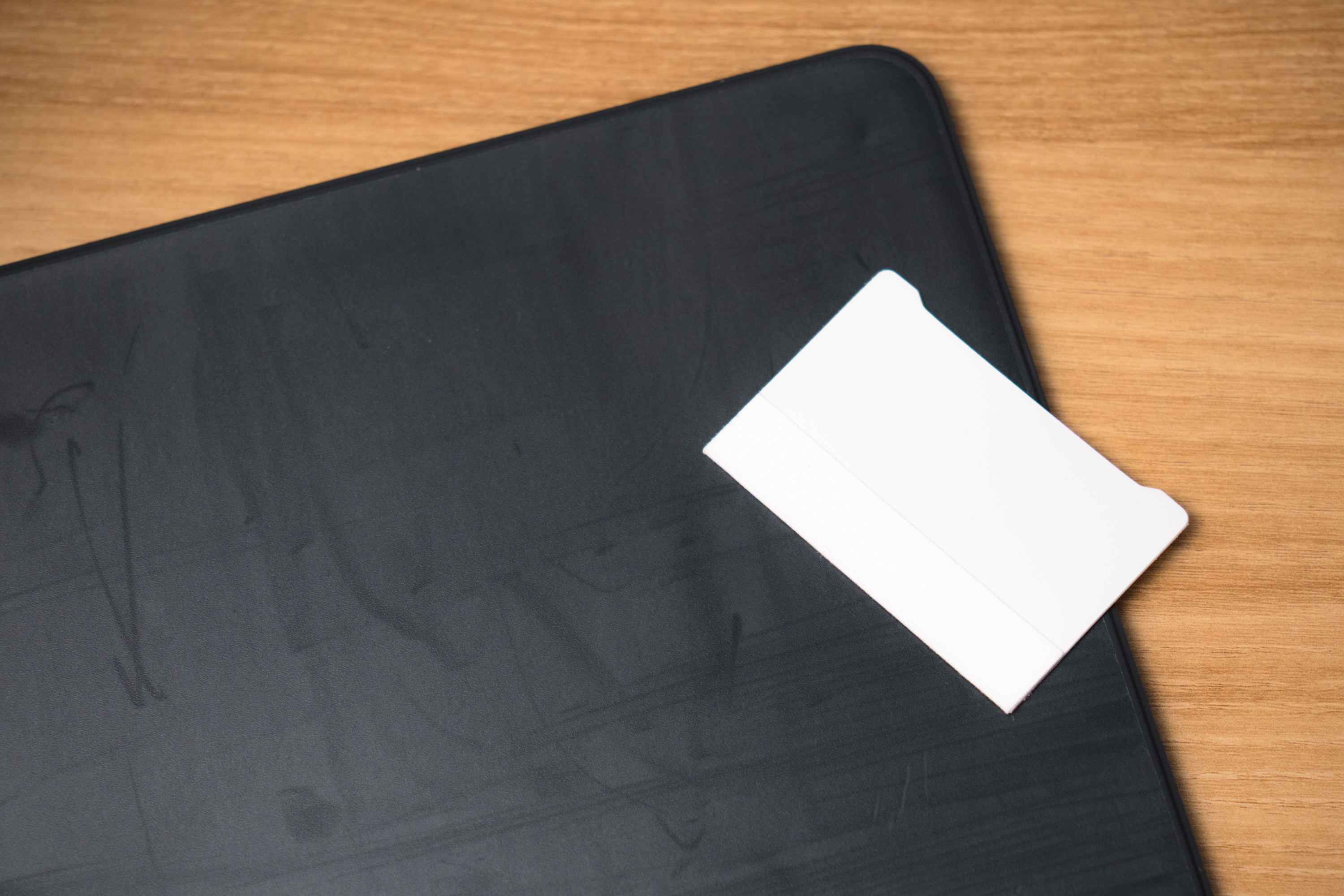 내구성 역시 끊임없이 지적돼 왔습니다. 과거 키보드 폴리오 시절엔 모서리가 찢기거나 벌어지기 일쑤였고 아예 벗겨지기까지 했다죠. 새 모델을 받아보니 11인치 아이패드 프로와 함께 사용했던 이전 모델보다 나아지긴 했습니다. 팜레스트쪽 소재가 메탈로 바뀌면서 내구성뿐 아니라 오염도 덜 신경쓰게 됐어요. 외부 소재도 전보다 단단한 느낌입니다만 소재 특성상 스크래치나 찍힘 등의 사용감이 쉽게 드러나는 건 여전해요. 그래서 보호 필름을 사용해 보기로 했습니다.