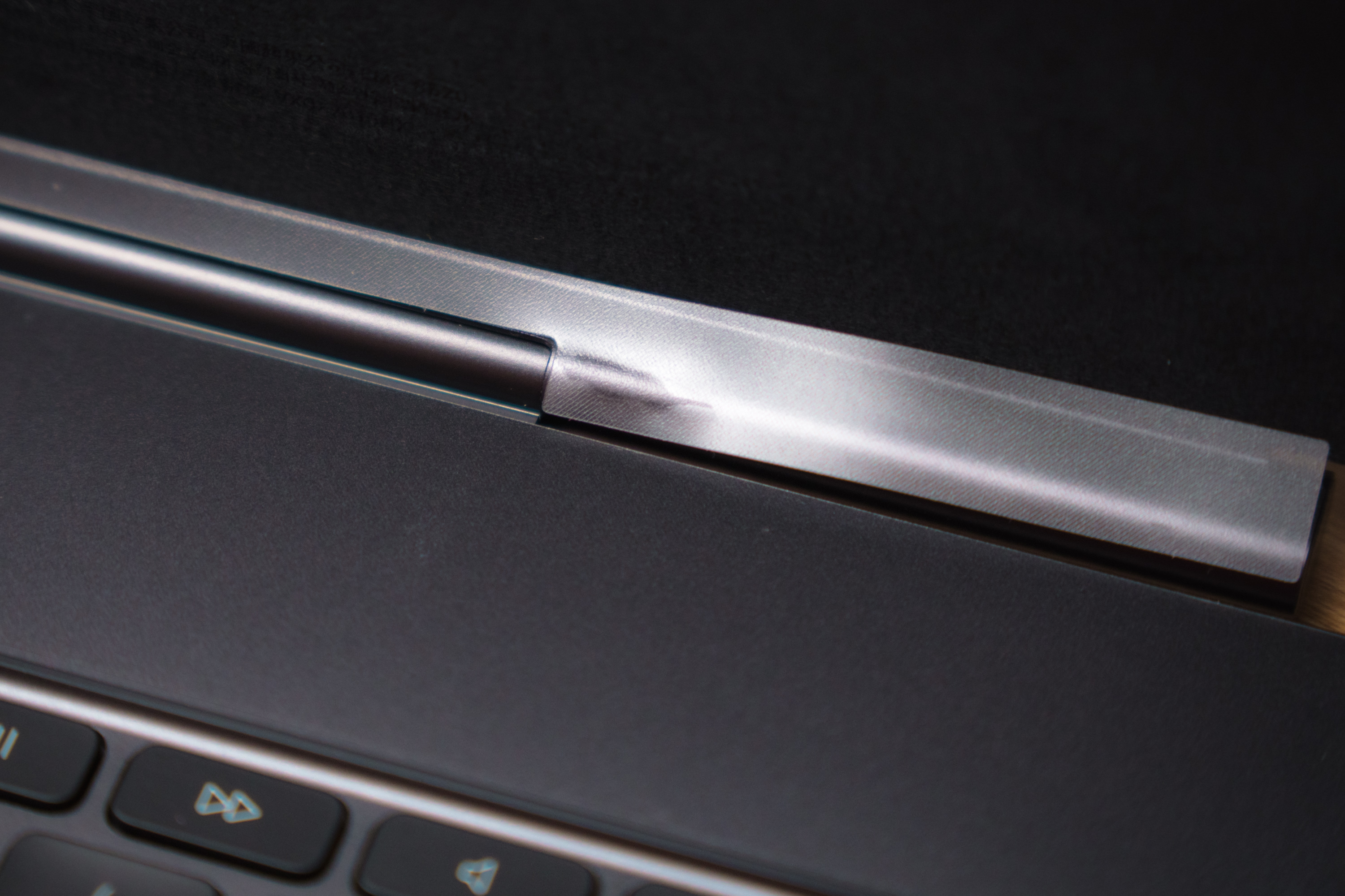 힌지는 안쪽과 바깥쪽으로 나뉘어 있습니다. 키보드 윗쪽 보호필름은 노치 형태로 되어 있으니 가운데 힌지 접합부 주변으로 위치를 맞추는 것이 좋고 필름이 가늘어 쉽게 늘어날 수 있으니 힘을 빼고 천천히 해야 실패를 막을 수 있습니다.