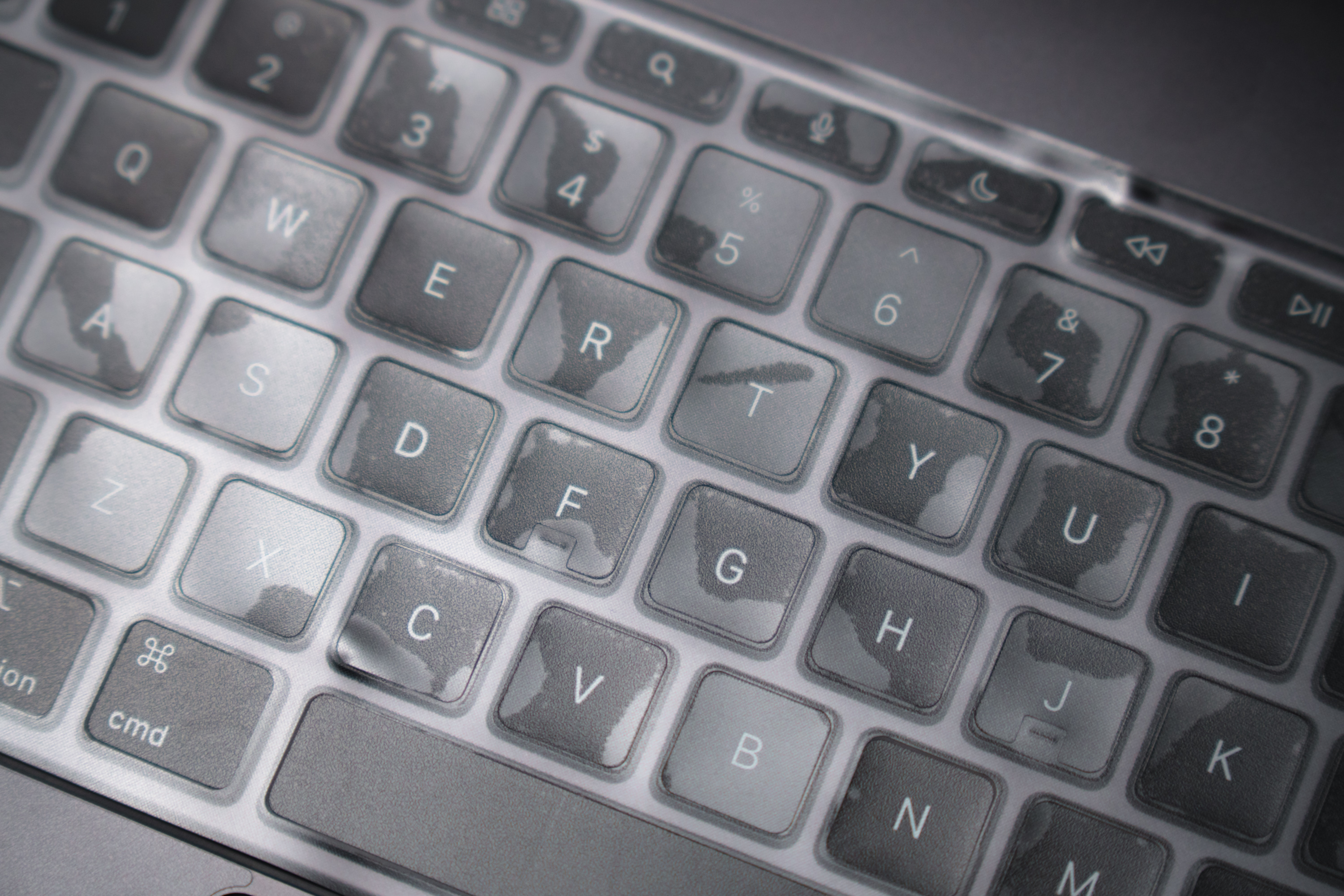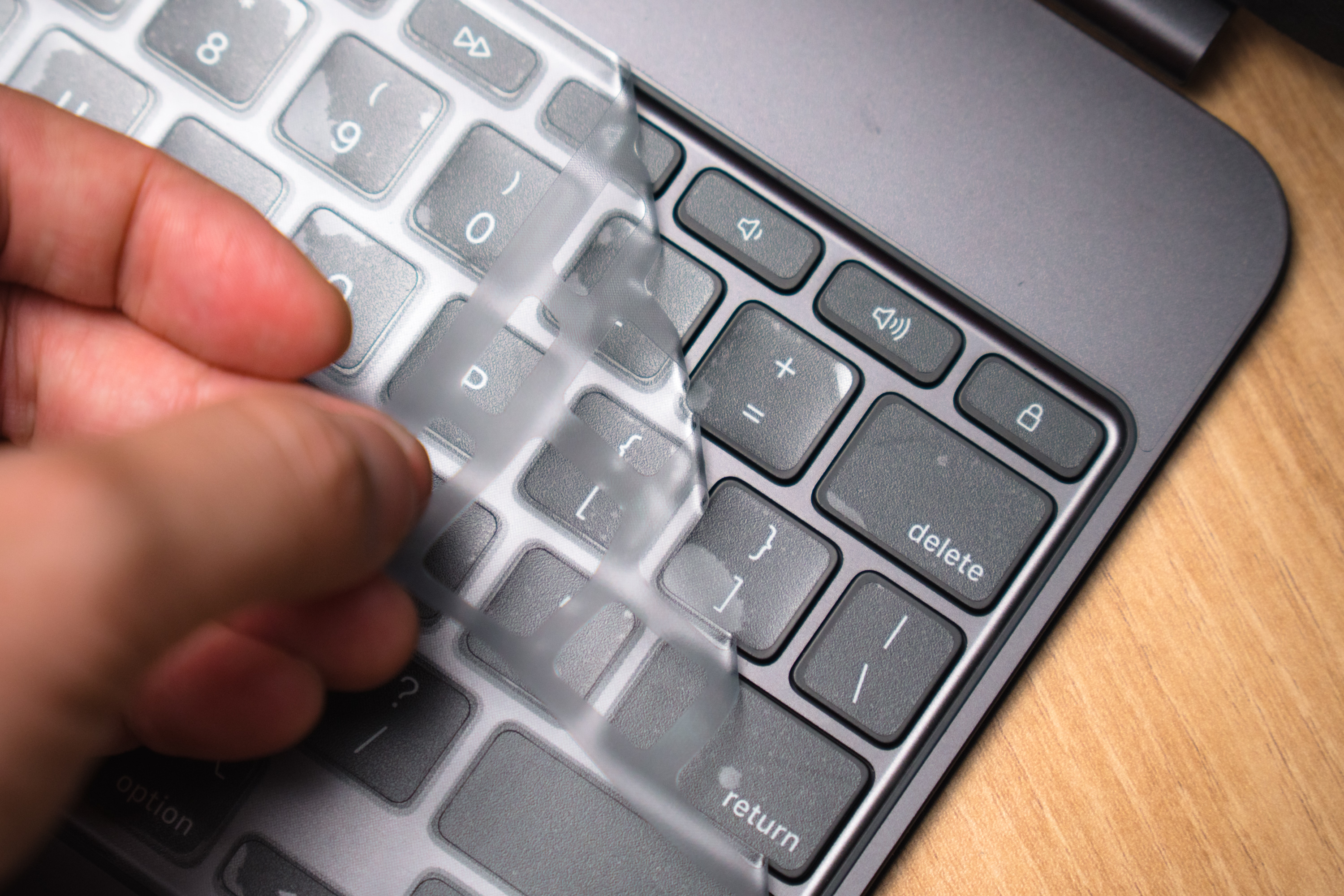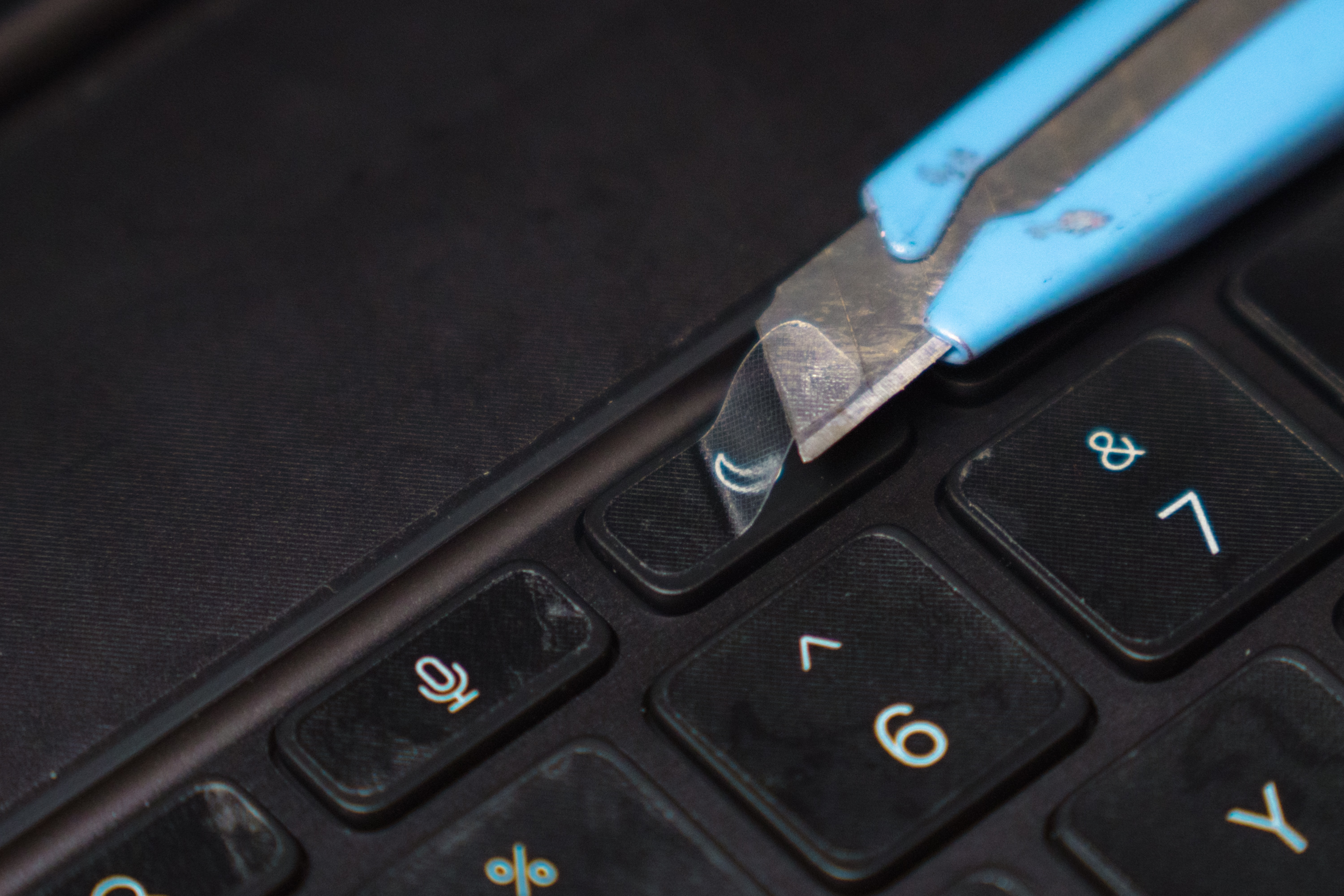 자판 보호필름 부착때는 필름이 조금 기울었는지 기능버튼쪽 필름이 미세하게 상단으로 쏠려 있었어요. 눈에 띄는 몇 개를 살짝 떼어내 위치를 조정했습니다. 이 역시 칼에 힘을 주면 필름이 찢기거나 늘어날 수 있기 때문에 살살 해야 합니다. 크게 어려운 작업은 아니지만요. 정 자신이 없다 싶으면 하나 하나 떼어내서 붙여도 되긴 합니다.