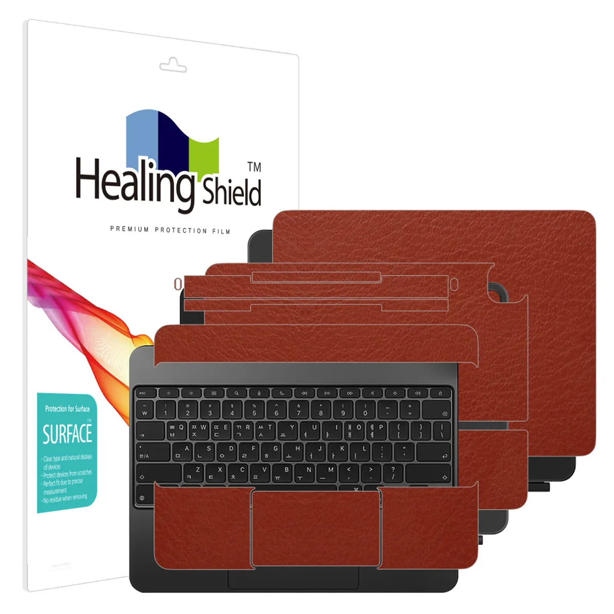 먼저 부착해 본 것은 외부 보호필름 3종. 매직키보드 전체에 다 부착하고 싶다면 이 3종 패키지를 구매하시면 됩니다. 상,하판, 팜레스트는 물론 힌지와 USB C 충전 포트쪽 보호필름까지 포함된 것이 인상적이었습니다. 저는 원래 디자인을 최대한 유지하기 위해 무광의 반투명 보호필름을 선택했지만 검정/레드 컬러 보호필름과 가죽 패턴 보호필름까지 총 4개의 선택권이 있습니다.
