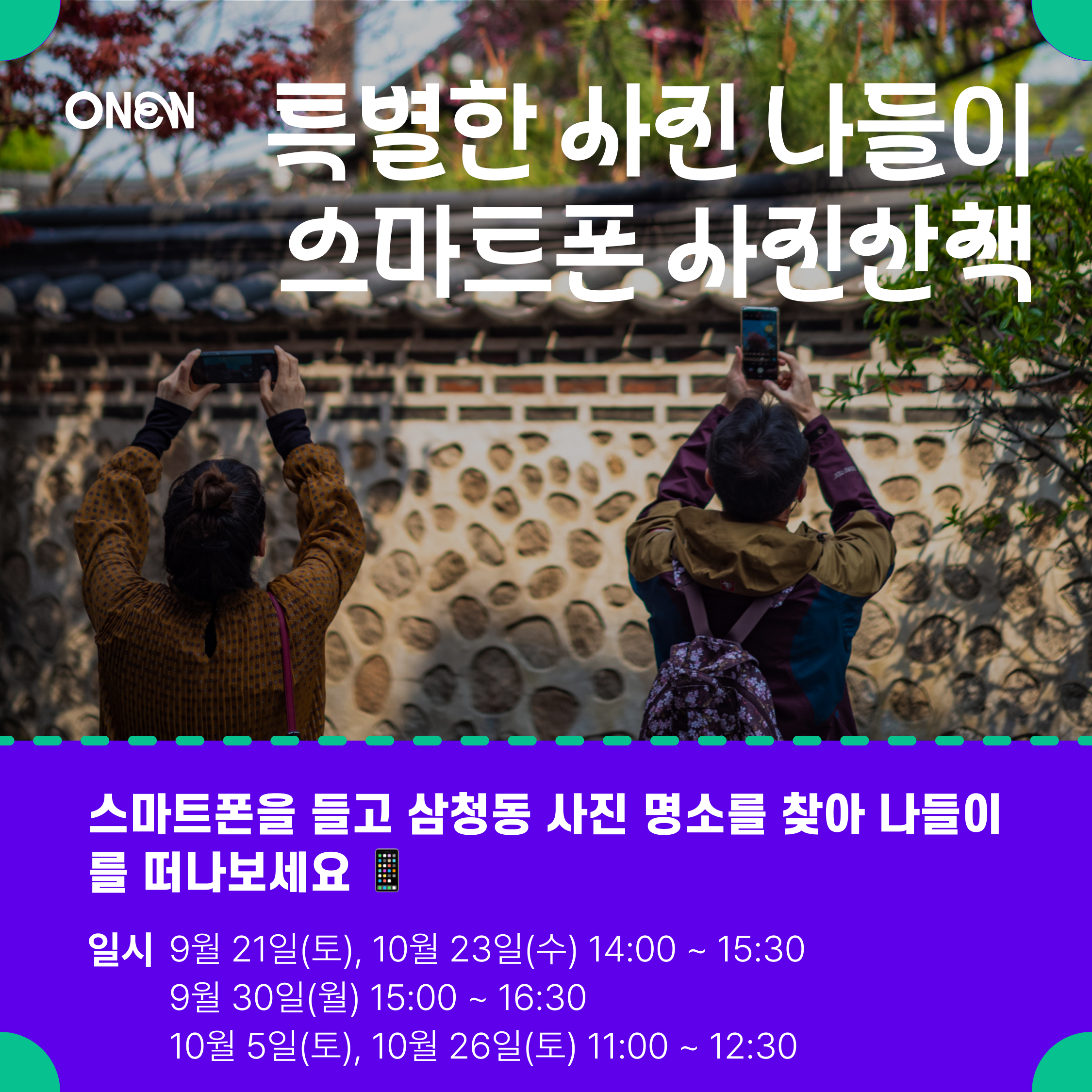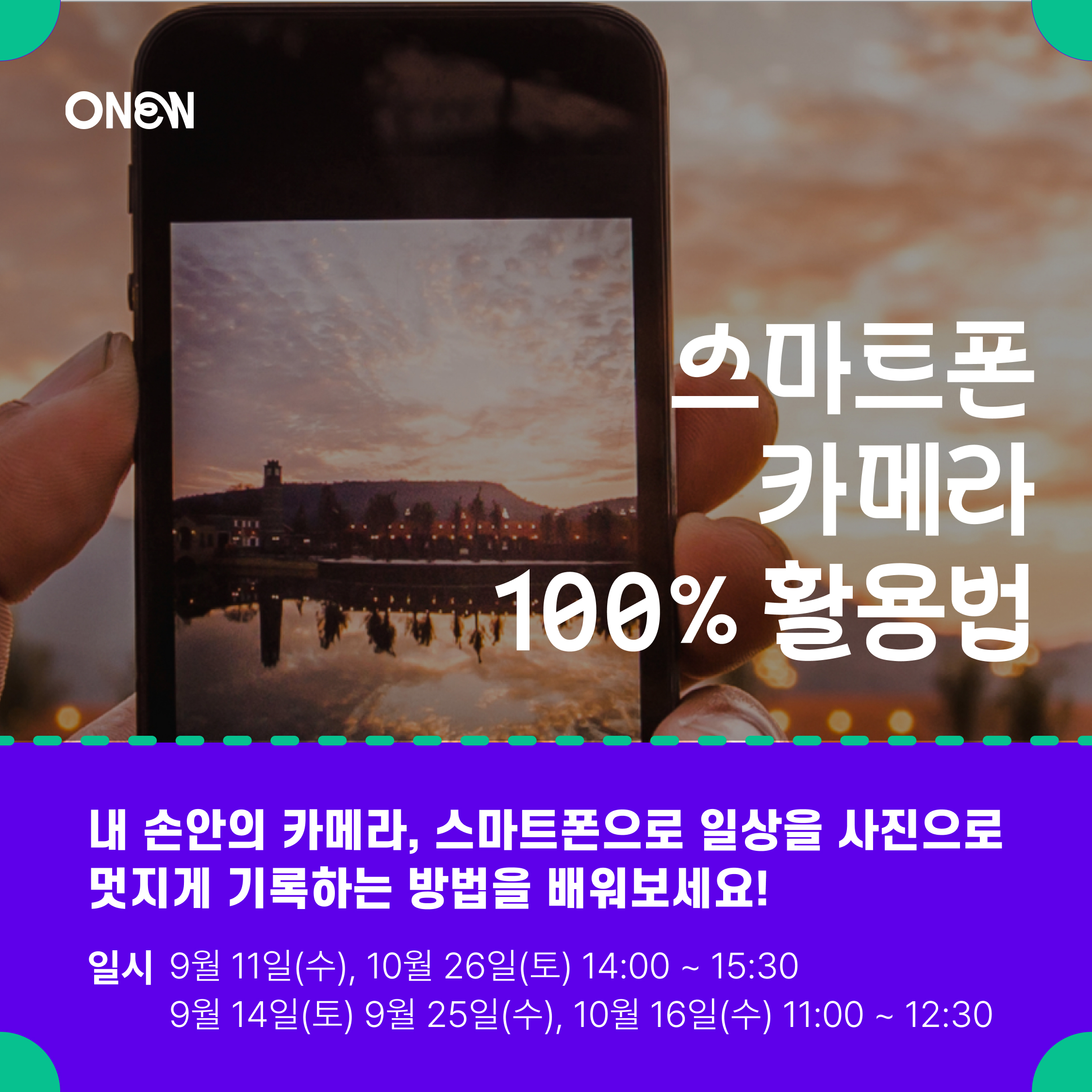 2022년부터 여러 곳에서 스마트폰 사진 클래스를 진행하고 있습니다. 오늘은 이번 가을 진행하는 스마트폰 클래스를 소개하려고 합니다. 시니어를 대상으로하는 플랫폼 오뉴의 스마트폰 사진 클래스 세 종류입니다. 9,10월에는 총 세 가지 클래스를 준비했어요.