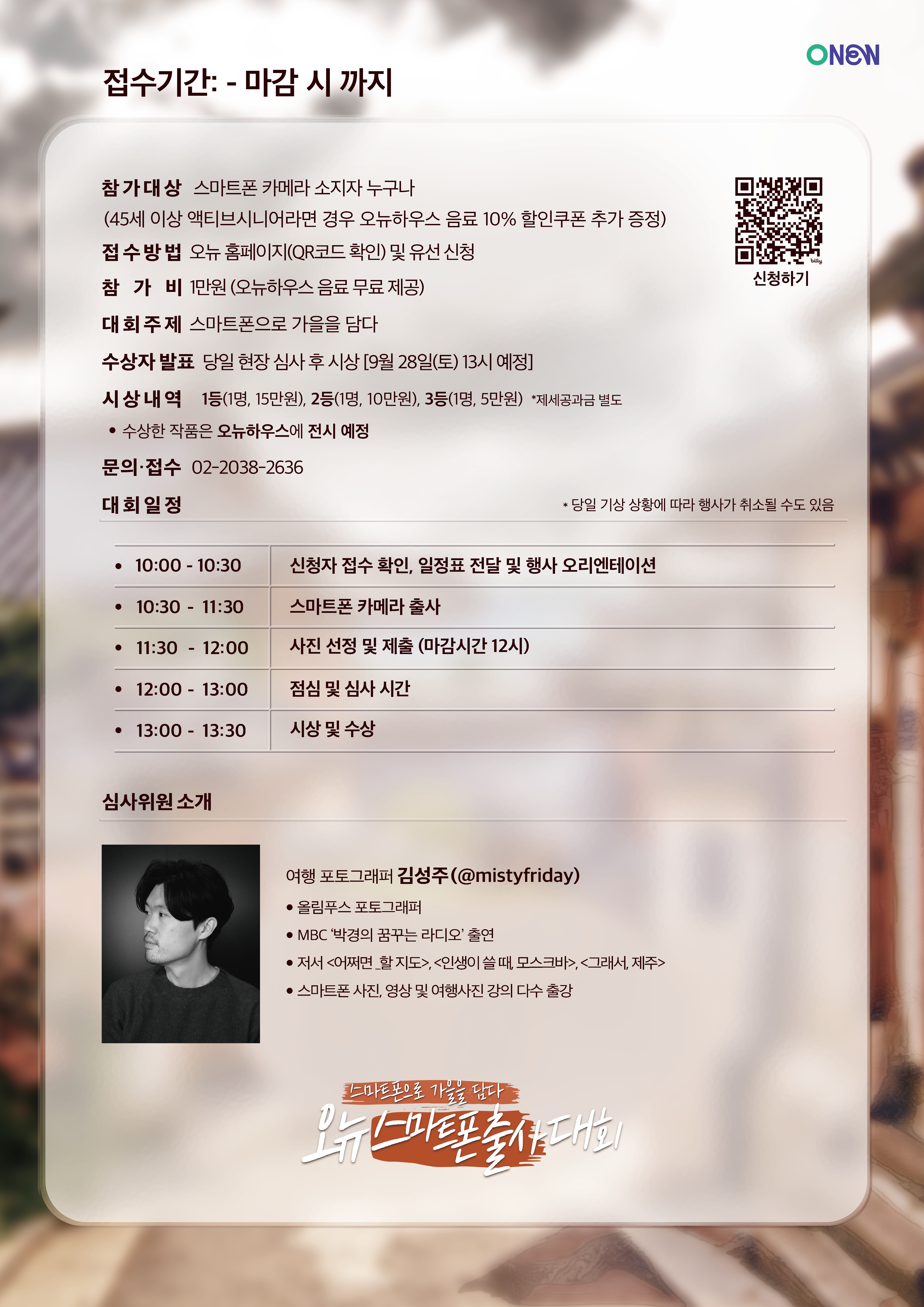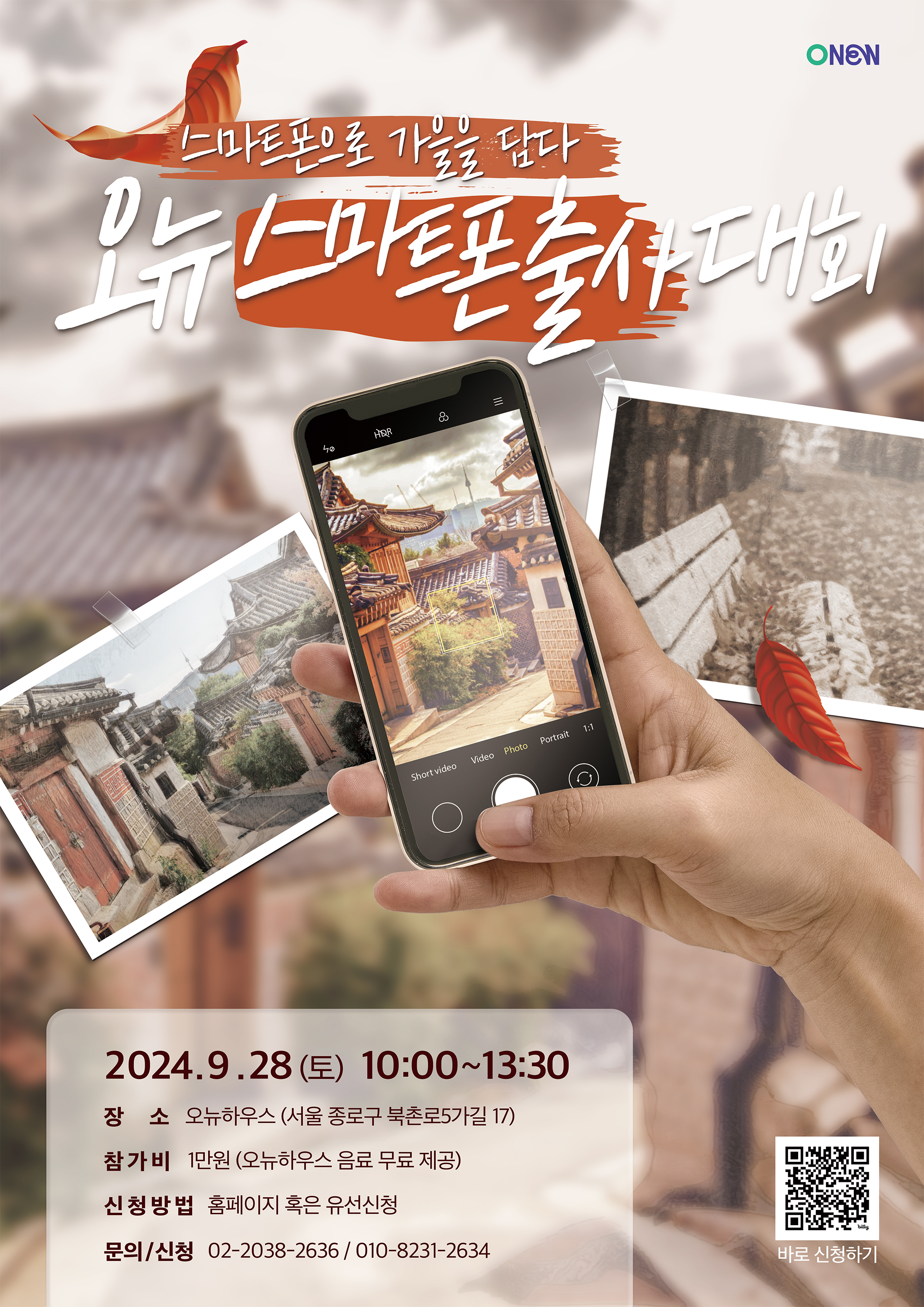 정기적으로 스마트폰 사진 클래스 진행하는 오뉴에서는 스마트폰 출사대회가 진행됩니다. 45세 이상 시니어를 대상으로 한 이벤트로 함께 북촌 풍경을 사진으로 찍고 최대 15만원의 상금까지 받을 수 있는 시간입니다. 사진 좋아하시는 분들께 좋은 추억이 될 거예요.