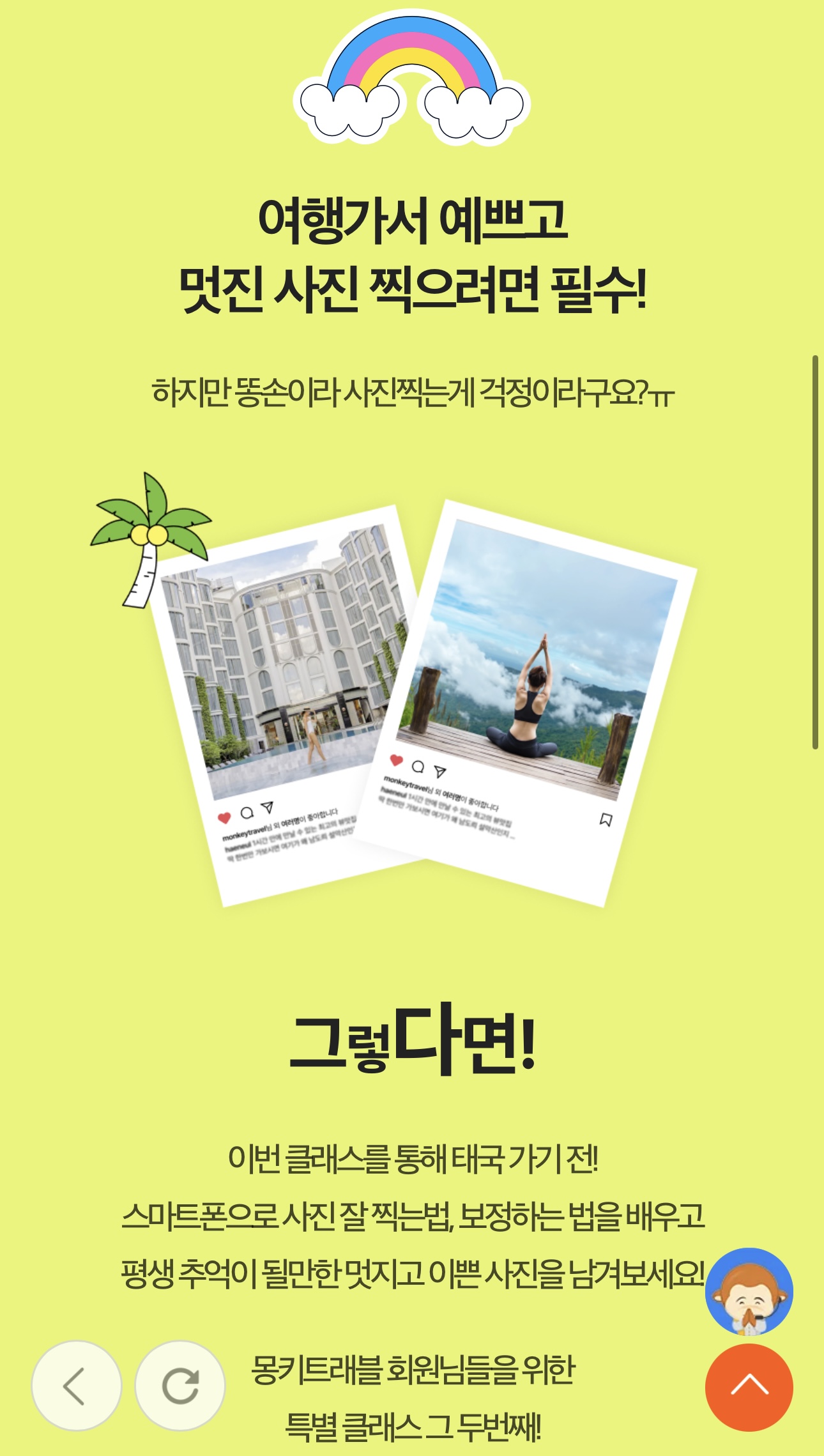 9월 28일 토요일에는 여행사 몽키 트래블에서 주최하는 스마트폰 사진 촬영&보정 원데이 클래스를 진행합니다. 태국을 배경으로 멋진 추억 남기는 방법들에 대해 준비하고 있어요. 여행 사진에 집중해 촬영 테크닉을 알려 드릴테니 관심과 참여 기다립니다.