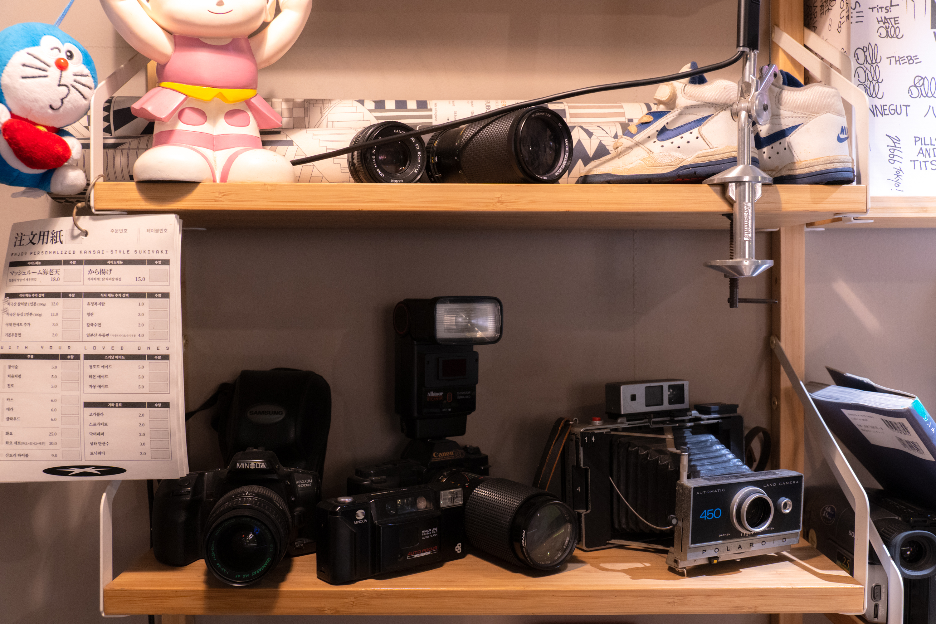 그 위에 놓인 것들도 사람들의 눈길을 사로잡을 만 합니다. 꽤나 신경 써서 모은 듯한 그래서 취향이 묻어나는 소품들이 가게 입구에 놓여 있더군요. 빈티지 카메라들이나 캐릭터 인형들, 낡은 나이키 운동화같은 것들. 맛집 방문하게 되면 전체 전경과 클로즈업 촬영을 모두 하게 되는데 이럴 때 줌 배율이 높은 렌즈가 당연히 유리합니다. 광학 3배 줌 내외가 일반적이지만 이 렌즈는 그보다 넓은 4.1배 줌을 지원합니다. 그만큼 다양한 프레임을 제공한다는 뜻이죠. 이날도 전체 인테리어와 음식/소품을 이 렌즈 하나로 다 찍었습니다.