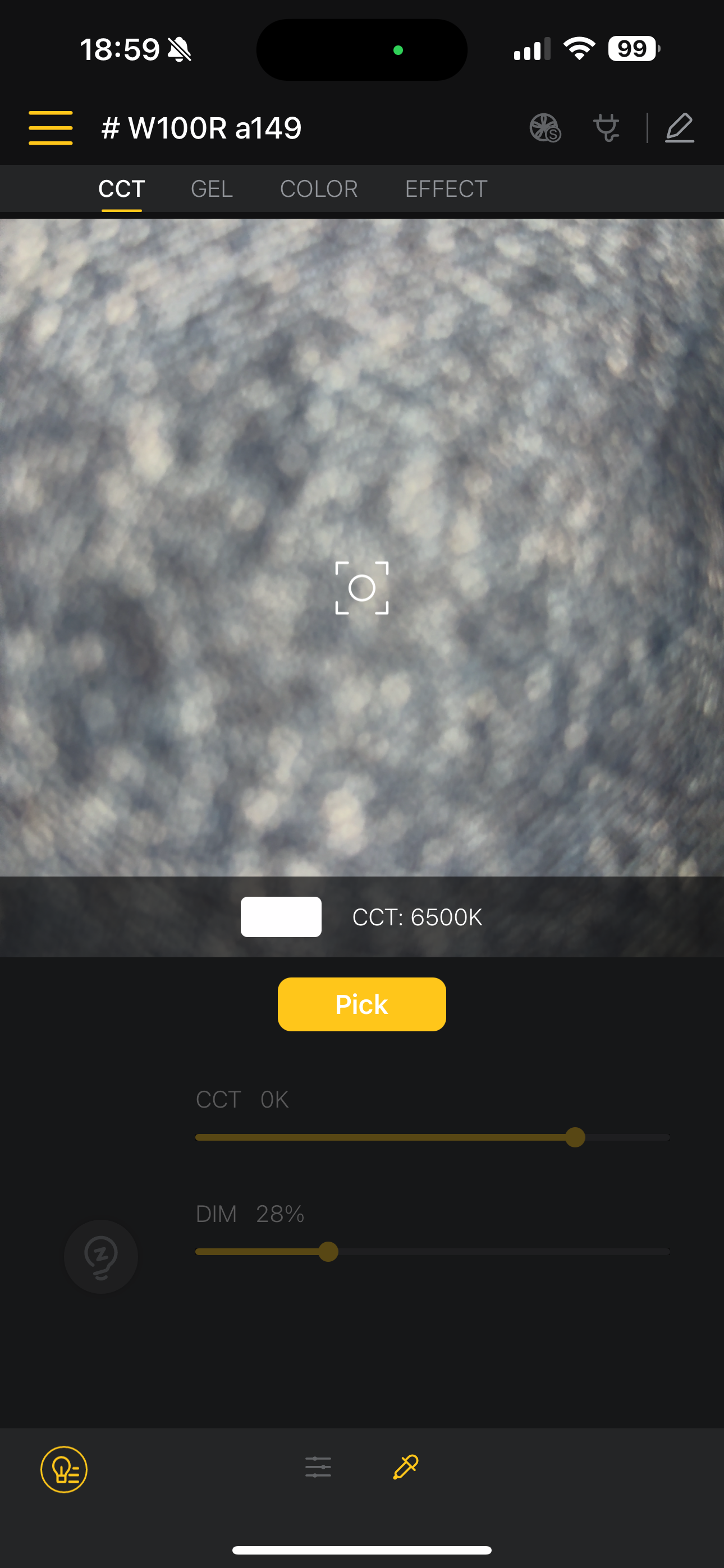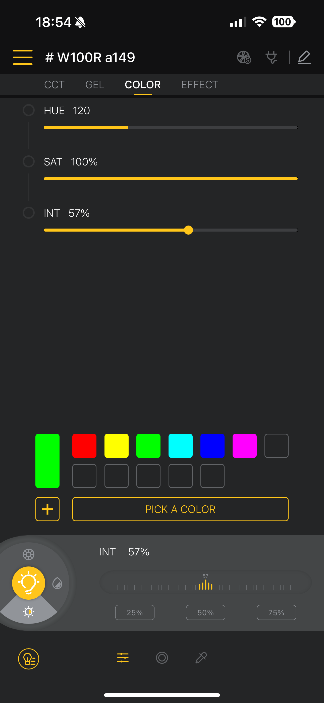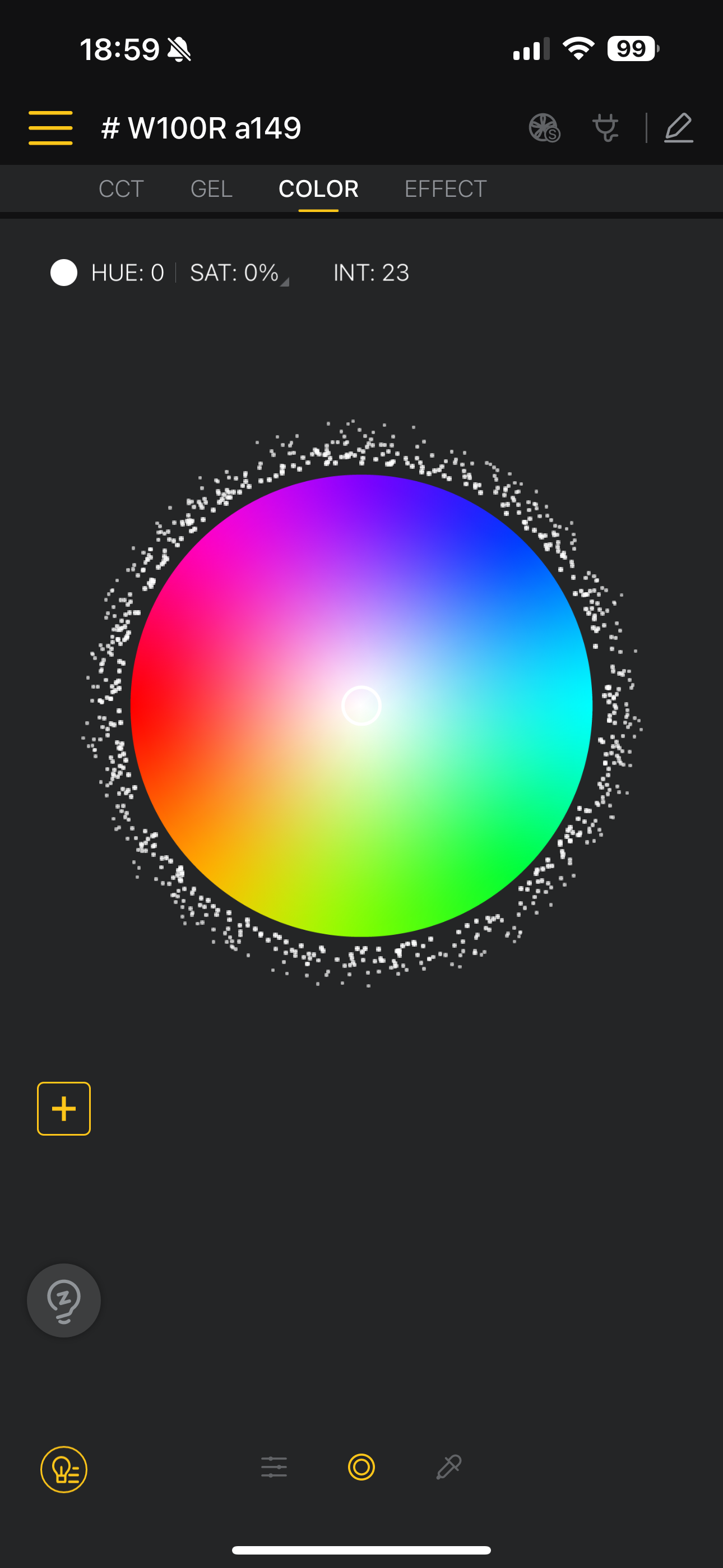 RGB LED를 탑재한 W100R 모델은 COLOR 메뉴에서 조명의 색상을 바꿀 수 있습니다. HUE(색조)/SAT(포화도)/INT(강도) 옵션또는 컬러 서클에서 색상을 직접 선택할 수 있는데 그 선택 폭이 꽤나 넓습니다. 또 하나 인상적이었던 것은 컬러 피커 옵션. 아랫쪽 스포이드 아이콘을 누르면 촬영 화면을 기준으로 색상이 설정됩니다.