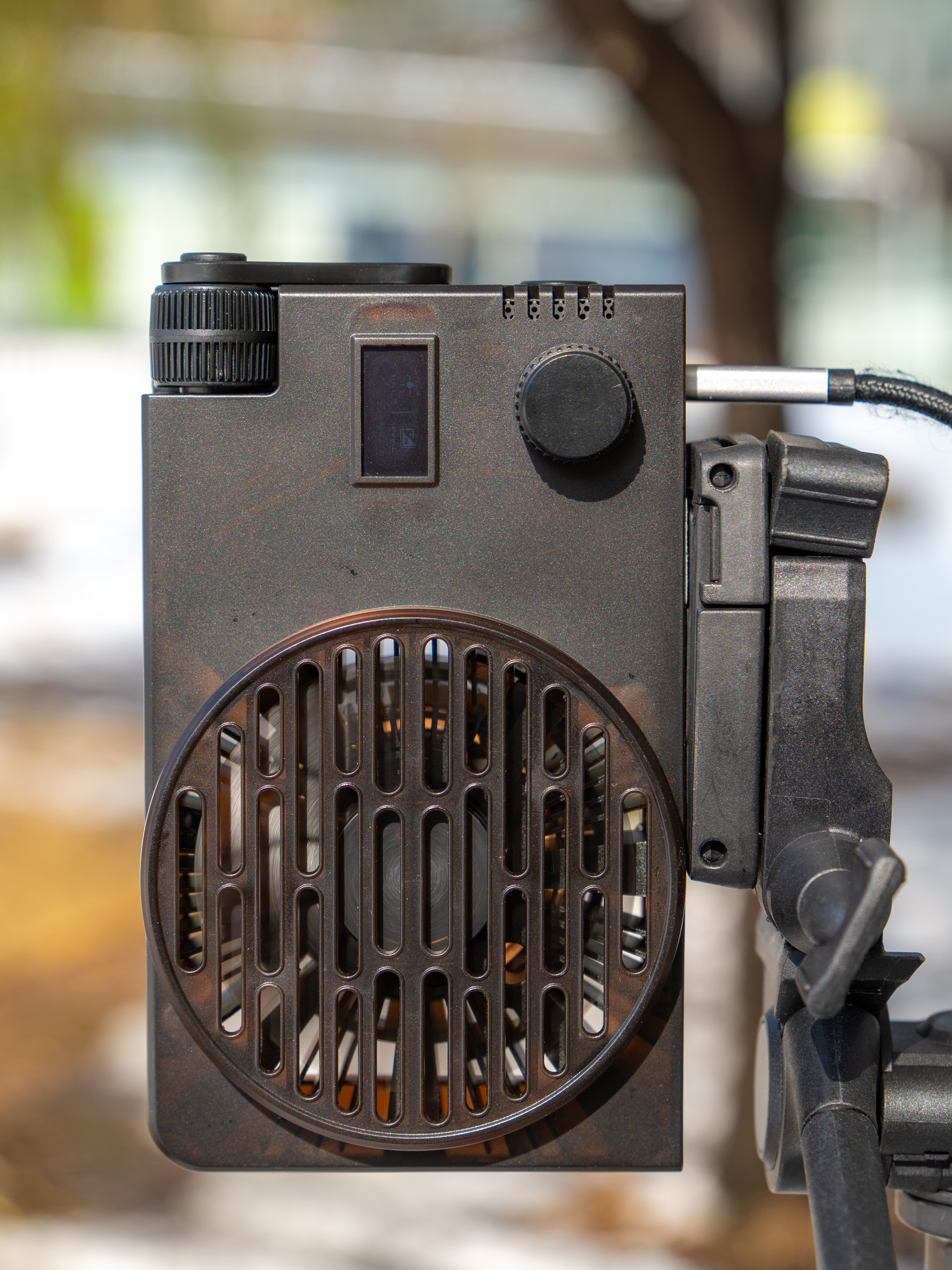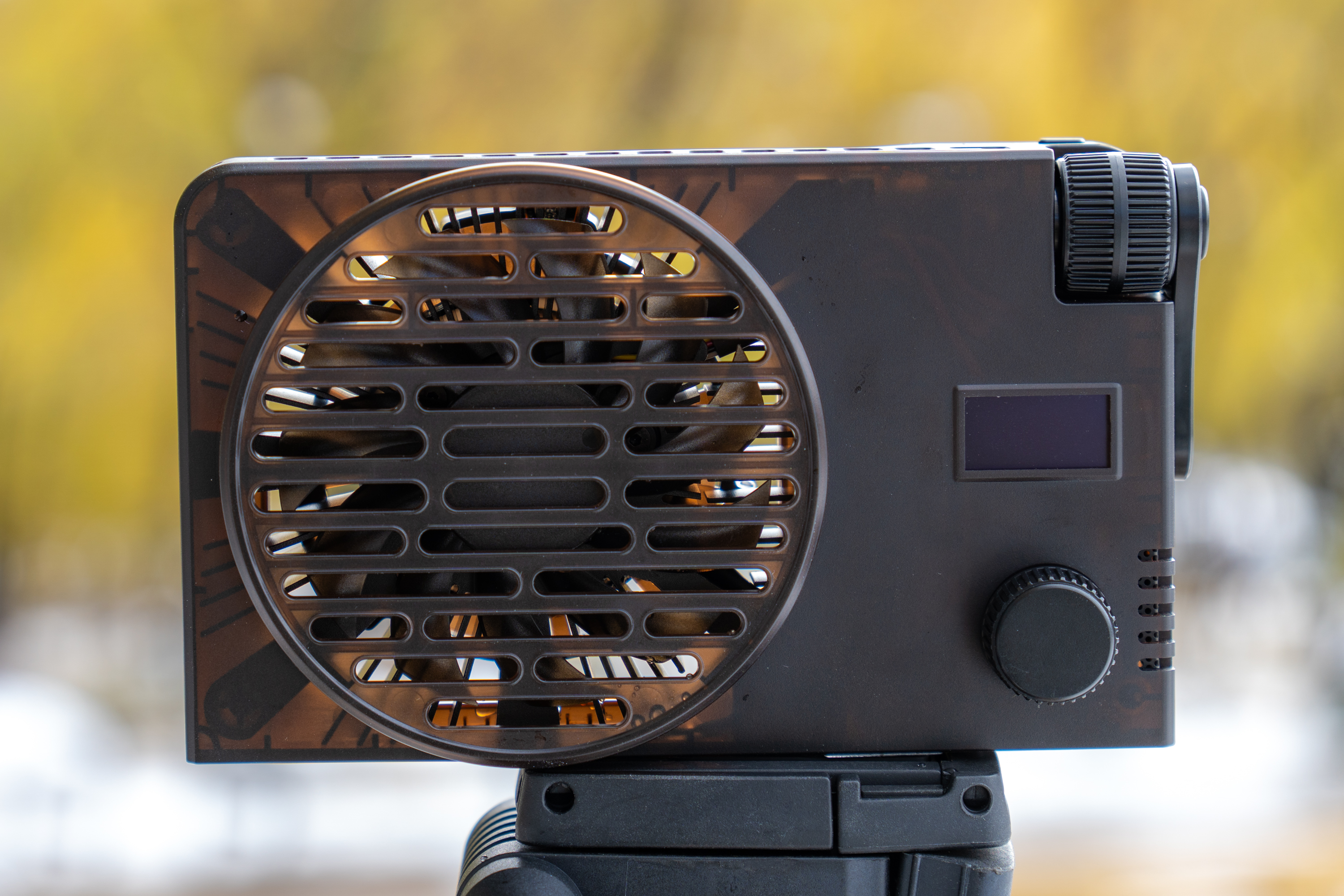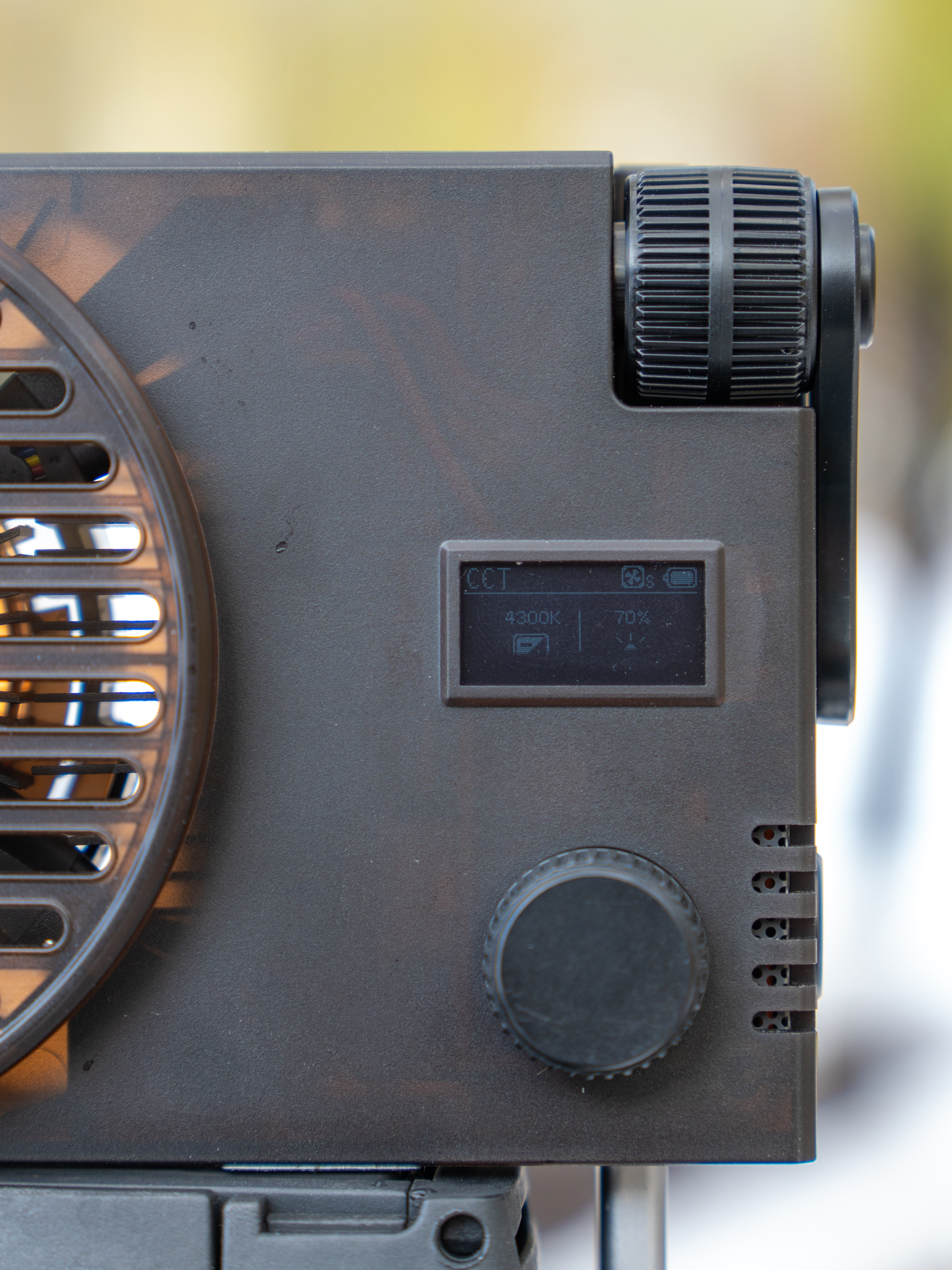 후면에는 발열 제어를 위한 팬과 조작 버튼/다이얼이 있습니다. 발열을 제어하기 위해 본체 대비 팬 크기가 상당히 큰 편이고 테두리에도 방열구가 여럿 뚫려 있습니다. 버튼과 다이얼은 전원 제어와 색온도/밝기/색상/앱 연결 등의 작업에 사용됩니다. 오른쪽에는 현재 설정과 상태를 표시하는 모니터가 있습니다.