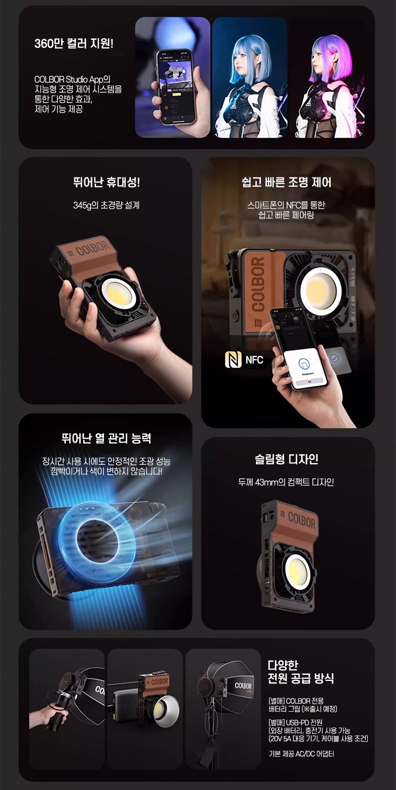 크리에이터들의 활동이 사진에서 동영상으로 확장된 지 오래입니다. 이제는 영상 중심으로 컨텐츠가 제작되고 있는데 COLBOR W100R과 같은 조명은 사진보다 영상 환경에서 그 매력과 쓰임새가 돋보일 것이란 생각이 들었습니다. 물론 사진 촬영에서도 조명 설정, 보조광의 유무로 결과물이 크게 달라지지만 영상에서는 그보다 근본적인 차이가 발생한다는 생각이 들더군요. 1인 또는 소규모 팀의 활동에서 전체 장비의 부피와 가격은 매우 중요하고 W100R은 기존 제품들과 비교했을 때.확실한 매력이 있습니다. 출력부터 다양한 컬러 설정 등 기본기가 탄탄하면서 휴대성이 뛰어납니다. 스마트폰 앱 조작과 USB C 전원은 기동성을 요하는 촬영에 유용하고요. 개인적으로는 클래식 카메라를 연상 시키는 디자인도 높은 점수를 줍니다. 내 사진,영상을 조금 더 발전시킬 방법을 찾는 아마추어 크리에이터들에게 추천하고 싶은 제품입니다.