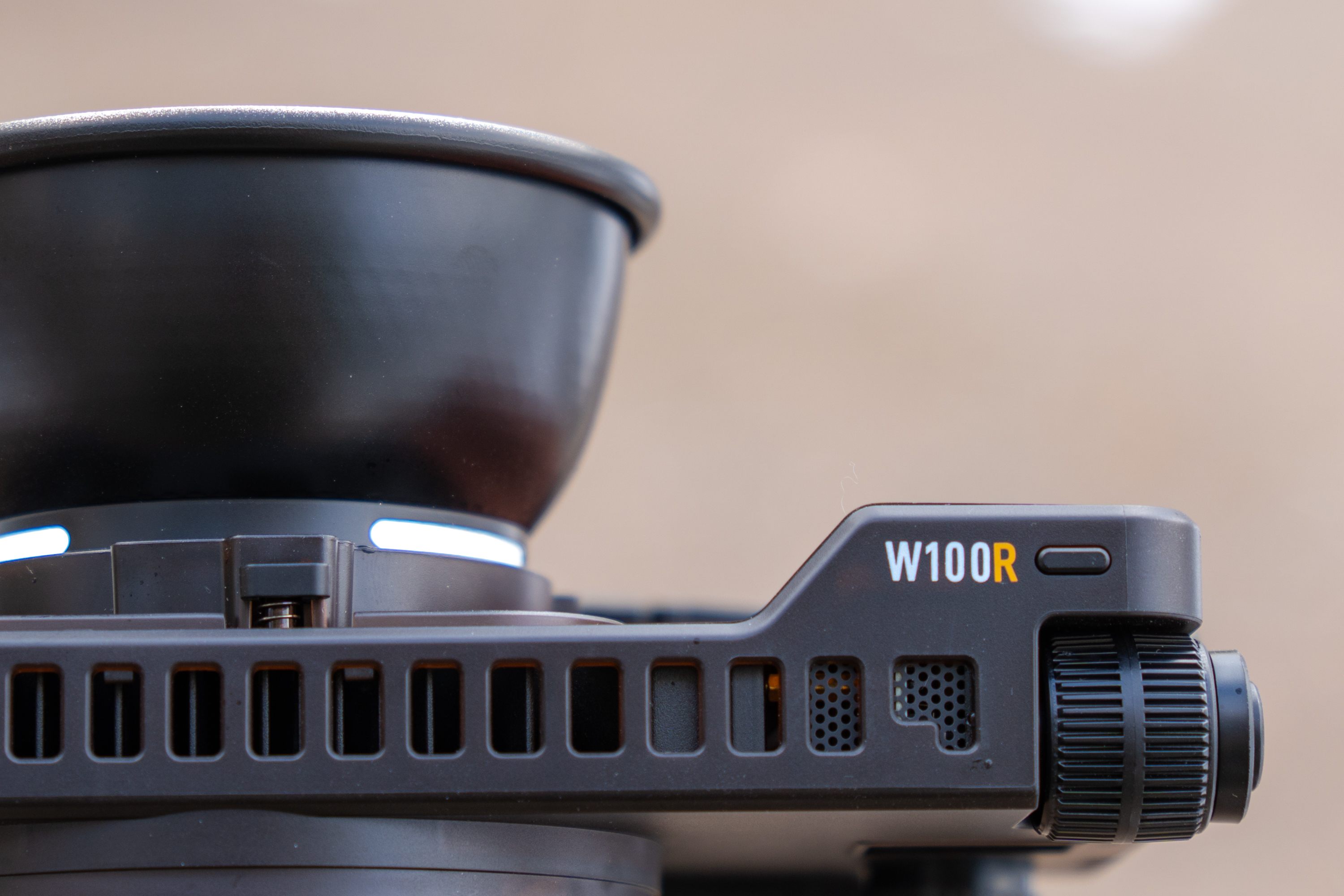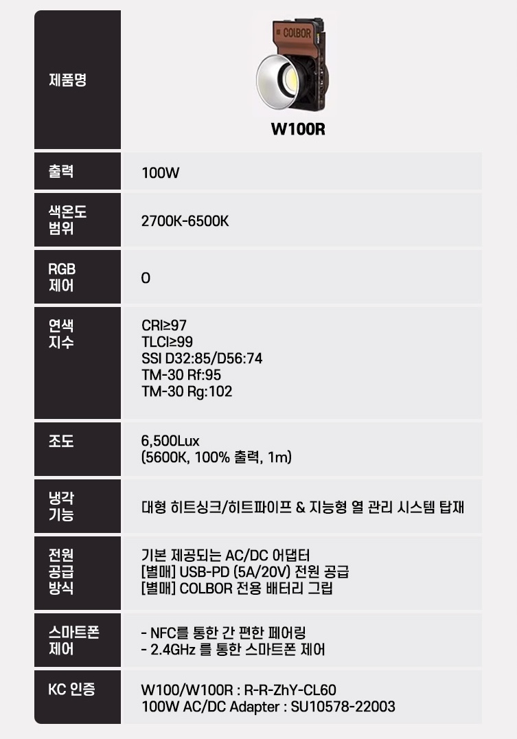 작은 크기 때문에 스마트폰 촬영 정도의 소형 조명으로 생각하기 쉽지만 출력 100W, 조도 6500Lux의 고사양 LED 라이트입니다. 색온도는 2700-6500K 사이에서, 밝기는 100단계로 조절 가능합니다. W100과 W100R 두 모델로 나뉘는데 W100R은 360만 컬러를 조절할 수 있는 RGB LED가 탑재됐습니다. 두 모델 모두 스마트폰 앱을 이용해 주요 기능을 간편하고 섬세하게 조절할 수 있습니다. 기본 AC 어댑터뿐 아니라 USB C로도 전원 공급이 가능한 것도 중요한 특징입니다.
