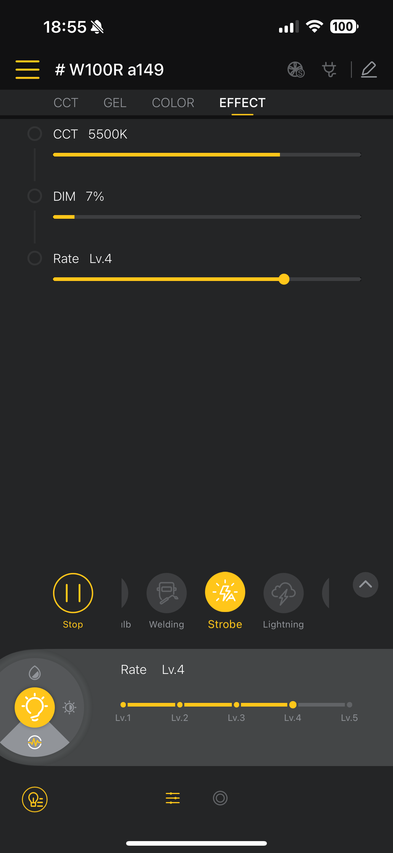 장치가 연결된 후에는 색온도/밝기/색상 변경 등의 기본 기능, 다양한 플래시 효과 등을 사용할 수 있습니다. 각 옵션은 직관적인 터치-드래그 방식으로 동작합니다. 본체의 다이얼, 버튼을 조작하는 것보다 훨씬 편하고 빠른 작업이 가능한 것이 장점입니다. GEL 메뉴에선 젤 필터를 사용한 것과 같은 조명 효과를, EFFECT 메뉴에서는 스트로브, 웨딩, 번개, 모닥불 등 다양한 조명 시뮬레이션 효과를 선택할 수 있습니다. 영상 촬영에서 분위기를 배가시키는 용도로 활용하면 좋겠습니다.