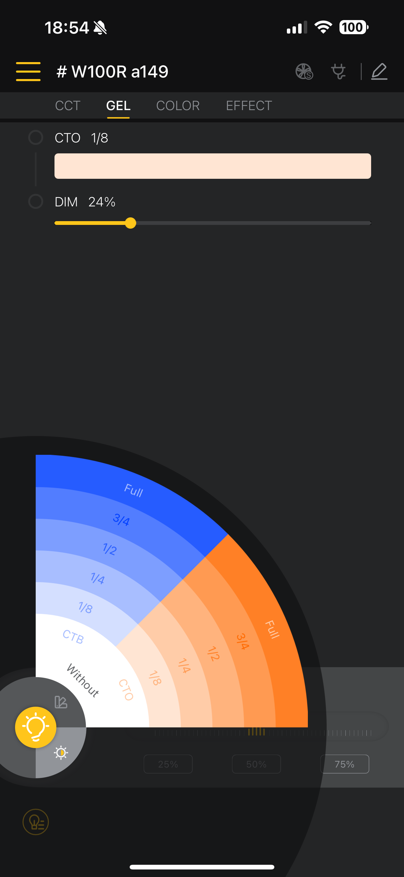 조도는 0-100까지 조절됩니다. 출력이 높은 편이라 야간 야외 촬영에서는 50 정도만 사용해도 인물 촬영 정도에 충분히 대응할 수 있습니다. 주간 촬영에서는 보조광 용도로 최대 100까지 설정하면 되겠고요. 리플렉터를 사용하면 빛을 집중시키기 때문에 효과가 배가됩니다.