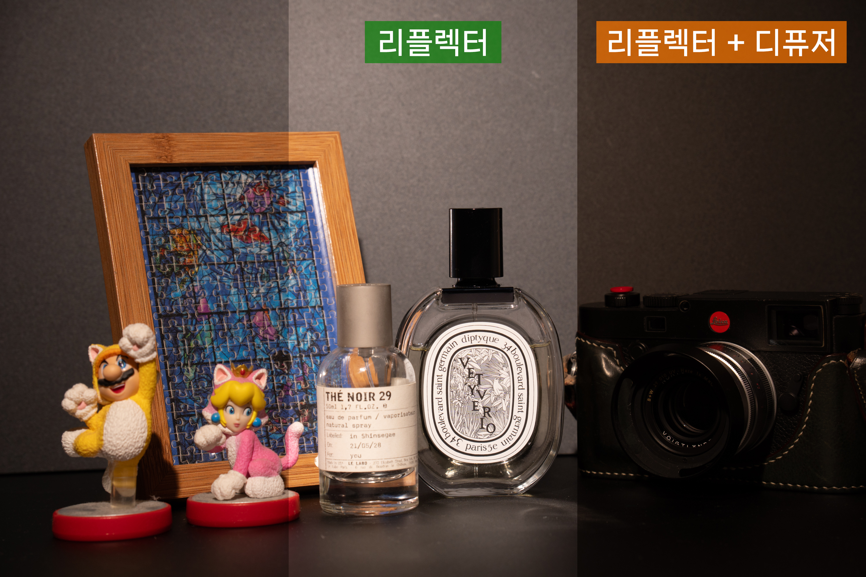 기본 제공되는 리플렉터와 디퓨저로 조명을 좀 더 섬세하게 설정할 수 있습니다. 리플렉터는 발광부의 빛을 집중시켜 피사체에 도달하는 조도를 높이는 효과가 있습니다. 리플렉터에 추가로 장착하는 디퓨저는 빛을 은은하게 퍼지게 해 빛을 자연스럽게 만들고 반사, 하이라이트를 줄입니다. 아래는 조명 단독, 리플렉터 장착, 리플렉터+디퓨저 장착 시의 조명 변화를 비교한 것입니다. 디퓨저를 장착하면 조도가 감소하면서 색온도도 눈에 띄게 달라지기에 사용 여부에 따라 사전 설정이 꼭 필요하겠습니다.