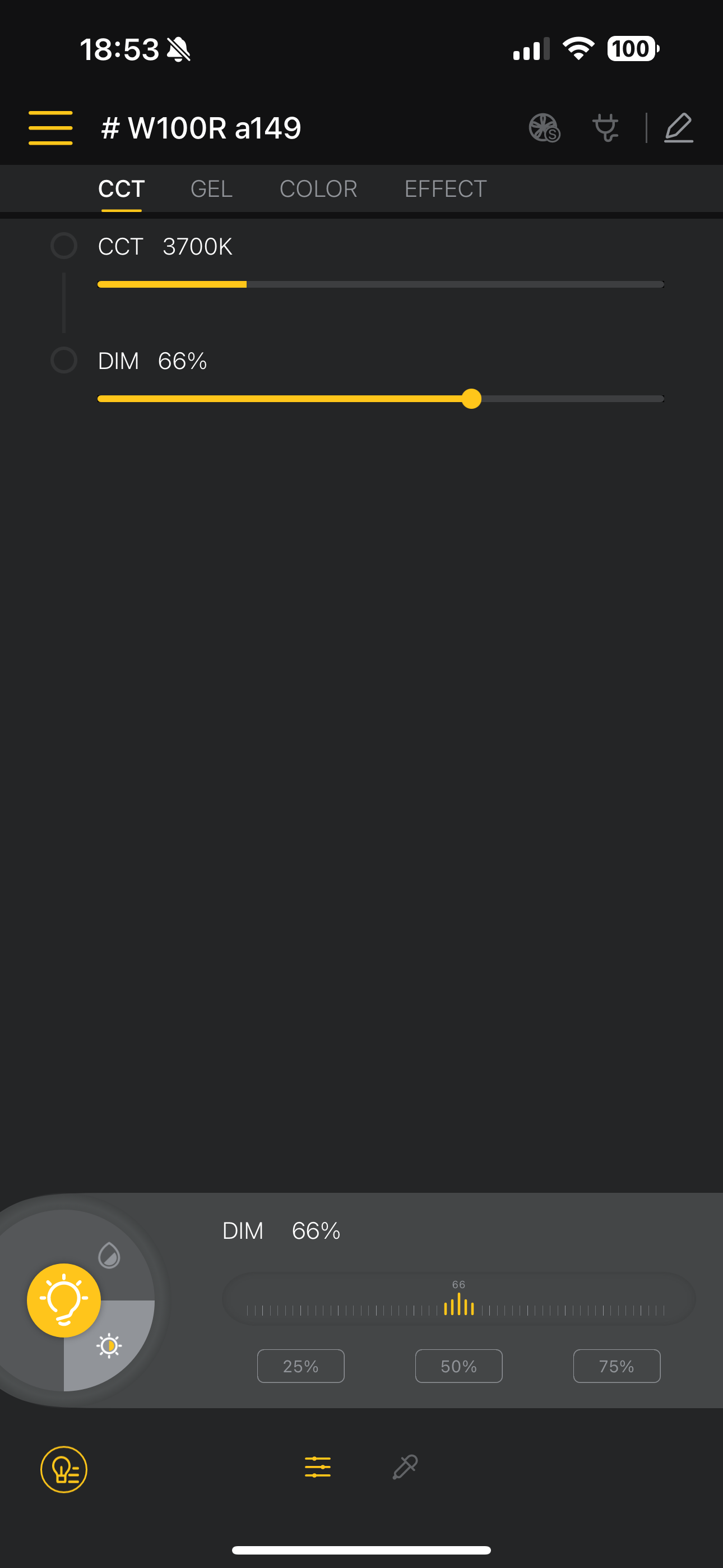 장치가 연결된 후에는 색온도/밝기/색상 변경 등의 기본 기능, 다양한 플래시 효과 등을 사용할 수 있습니다. 각 옵션은 직관적인 터치-드래그 방식으로 동작합니다. 본체의 다이얼, 버튼을 조작하는 것보다 훨씬 편하고 빠른 작업이 가능한 것이 장점입니다. GEL 메뉴에선 젤 필터를 사용한 것과 같은 조명 효과를, EFFECT 메뉴에서는 스트로브, 웨딩, 번개, 모닥불 등 다양한 조명 시뮬레이션 효과를 선택할 수 있습니다. 영상 촬영에서 분위기를 배가시키는 용도로 활용하면 좋겠습니다.