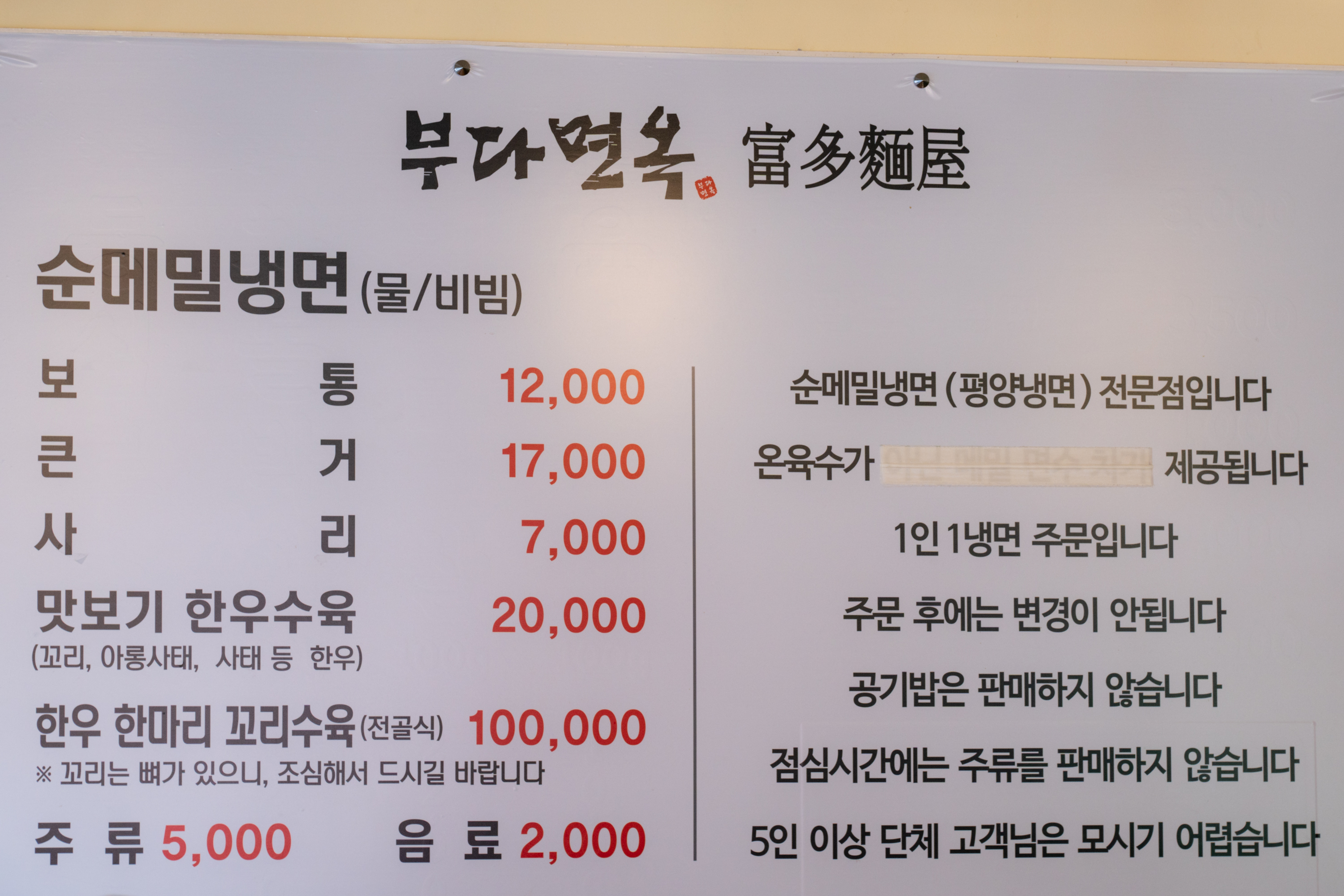 메뉴는 냉면과 수육입니다. 기본 냉면이 12000원인데 면이 순메밀입니다. 서울에서 순면 평냉을 먹으려면 이보다 1.5배는 받죠. 곱빼기는 17000원. 냉면만을 즐기고 싶다면 냉면 큰걸로 주문하셔도 좋지만 이집은 맛보기 한우 수육이 기가 막히니 냉면+수육 조합을 추천합니다.