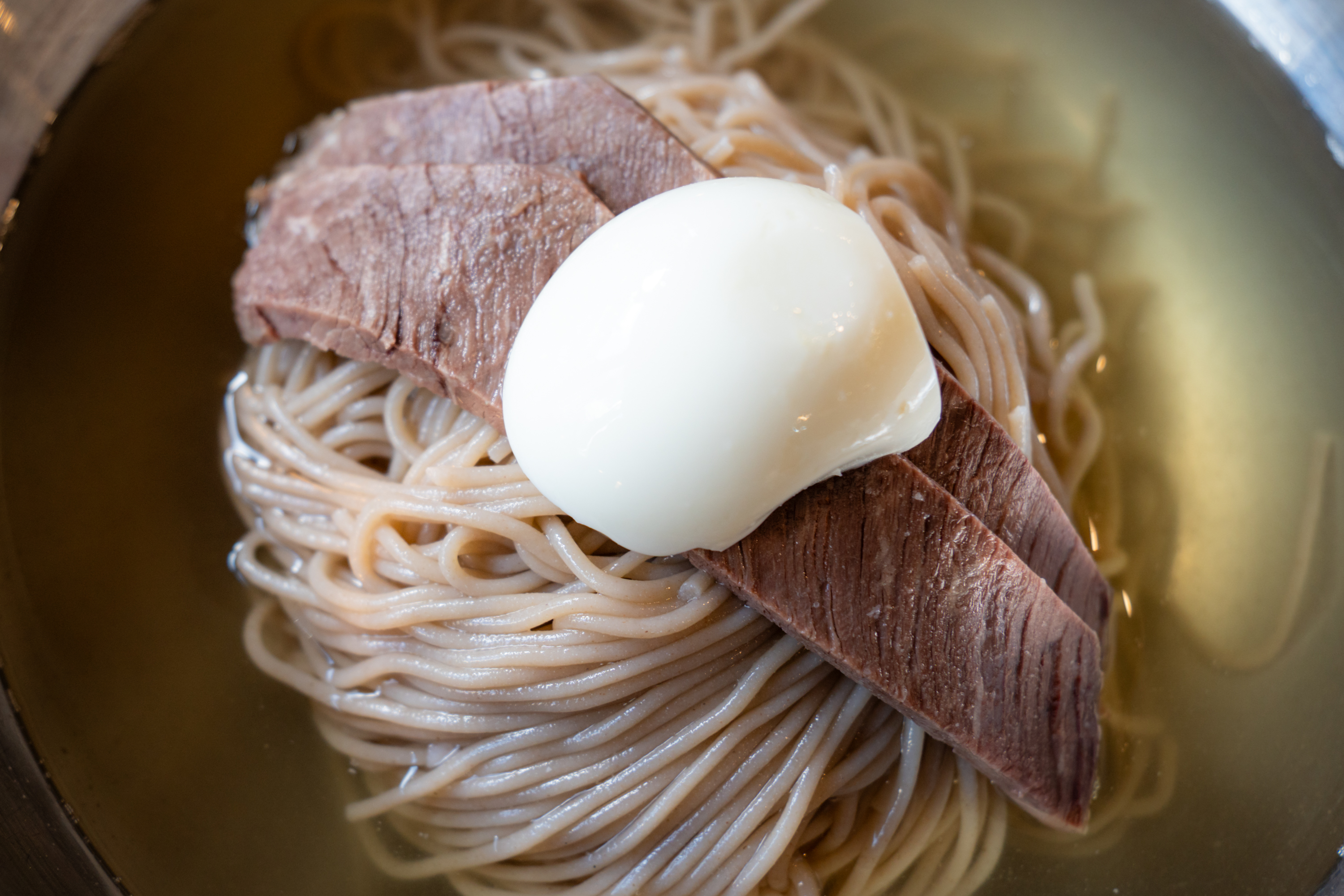 서울에서 먹던 평냉과 별반 다르지 않습니다. 이건 칭찬입니다. 사람들이 좋아하는 평냉 고유의 맑고 담백한, 그러면서 끝맛에 육향과 감칠맛이 도는 매력을 잘 살렸습니다. 서울의 평냉집들과 비교하면 육향은 중간 이상급으로 강한 편에 속합니다. 순메밀면인데도 면에 찰기가 있는 게 의외였는데 메밀 향이 충분히 나고 툭툭 끊어지는 걸 보면 맞는 것 같아요. 게다가 고기를 아주 부드럽게 잘 삶았습니다. 종종 유명한 냉면집에서도 고기가 종이 씹는 것처럼 질기고 별다른 맛이나 향이 없는 경우가 있는데 이집은 고기 단독으로도 맛있습니다.